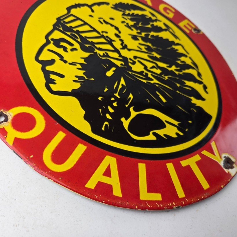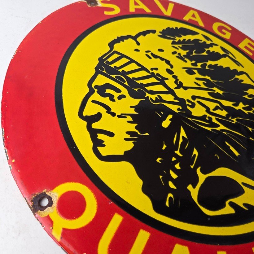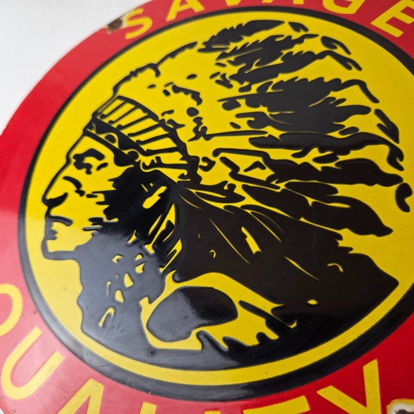 This vintage Savage Arms porcelain sign features the iconic Savage American Indian with large lettering that says Savage Quality. This sign is perfect for firearm enthusiasts and collectors alike. The bold red, yellow, and black colors bring a pop of style to any space. Measures 12″ across and made of porcelain, this sign is durable and built to last.
