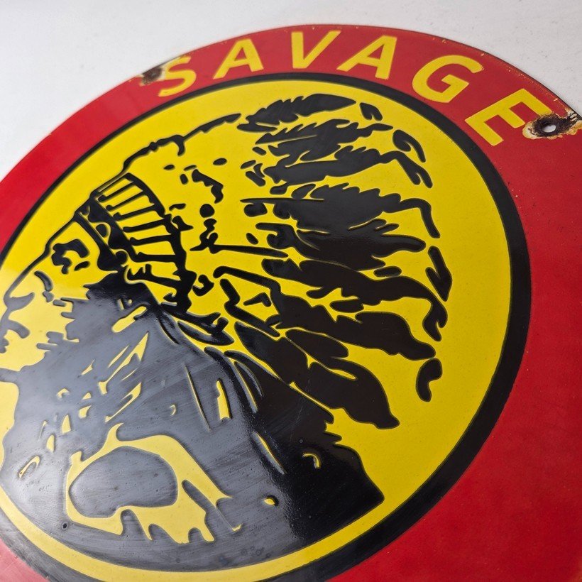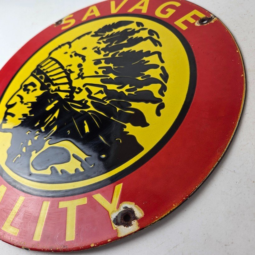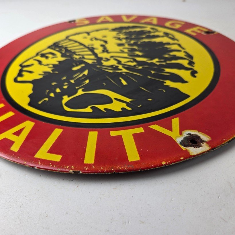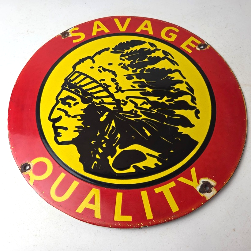 Vintage Savage Arms Sign – Quality Porcelain Service Gun Ammo Gas Oil Pump Sign