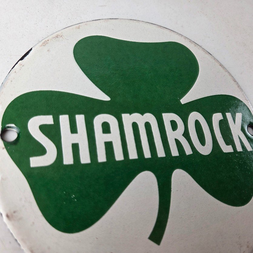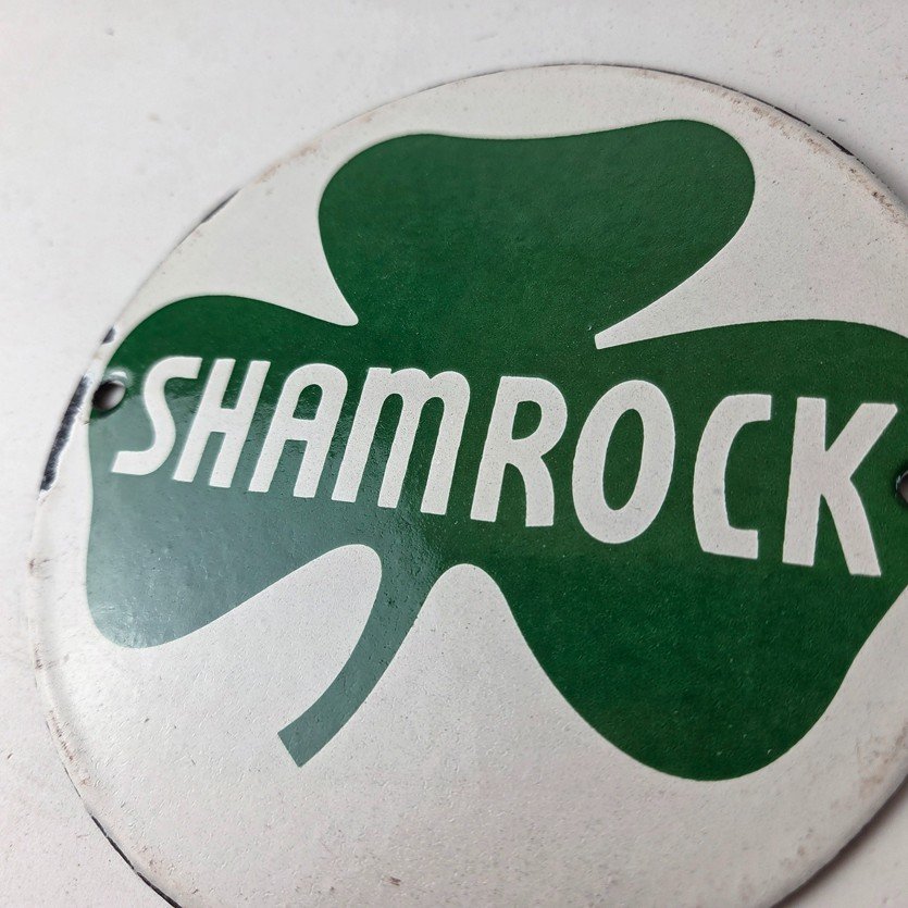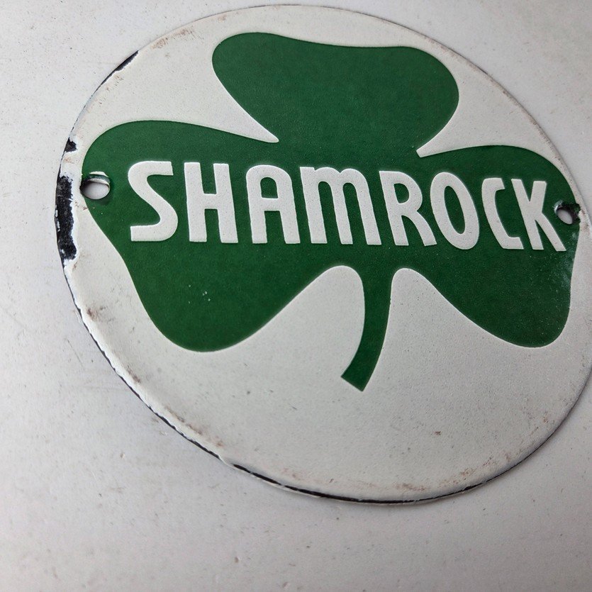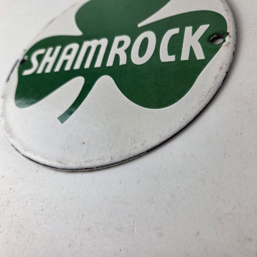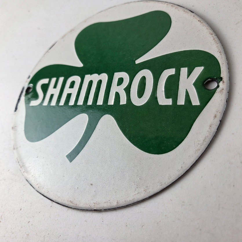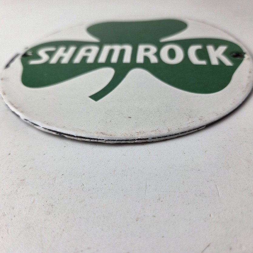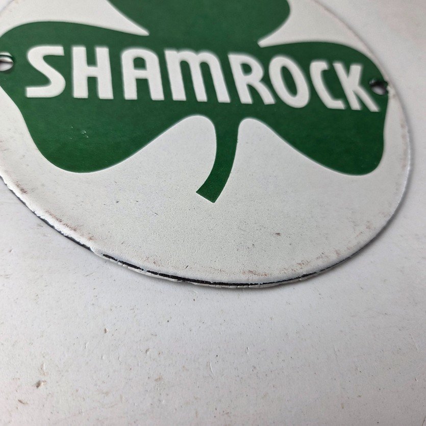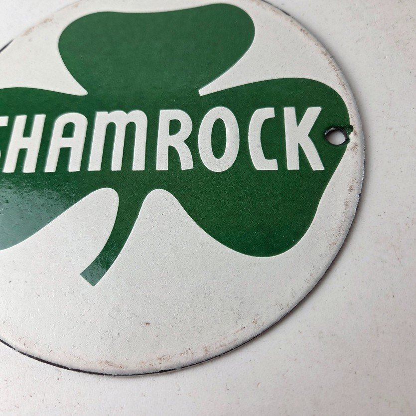 This vintage Shamrock porcelain sign features the iconic green clover with large Shamrock lettering in the center. This sign has excellent large lettering and porcelain. The sign measures 6 inches across.