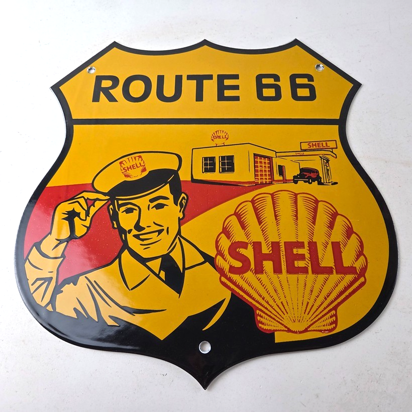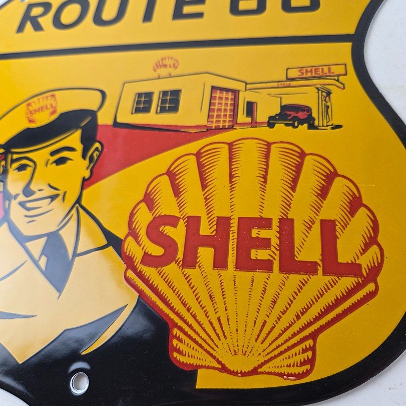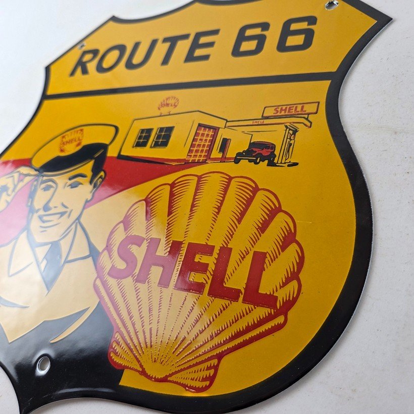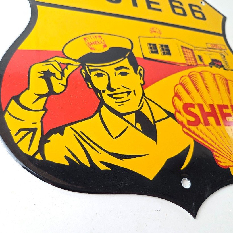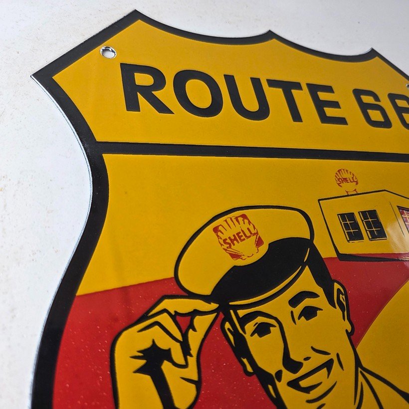 This vintage Shell Gasoline porcelain sign features the Shell Gas Station attendant on Route 66. Measuring 11 1/2 inches by 11 inches in size, this porcelain is in excellent condition with amazing gloss.