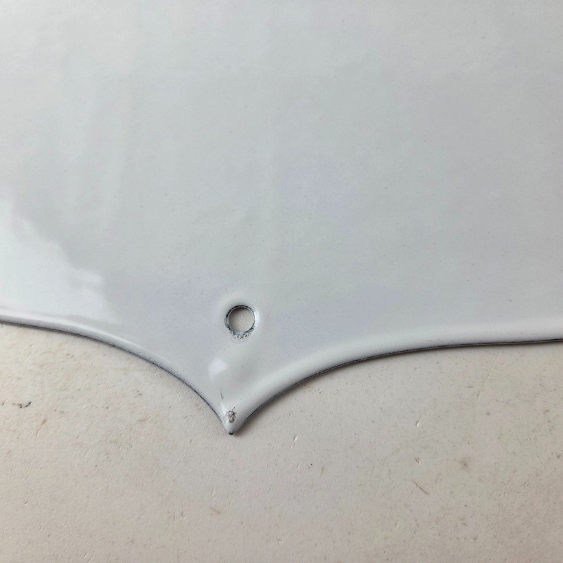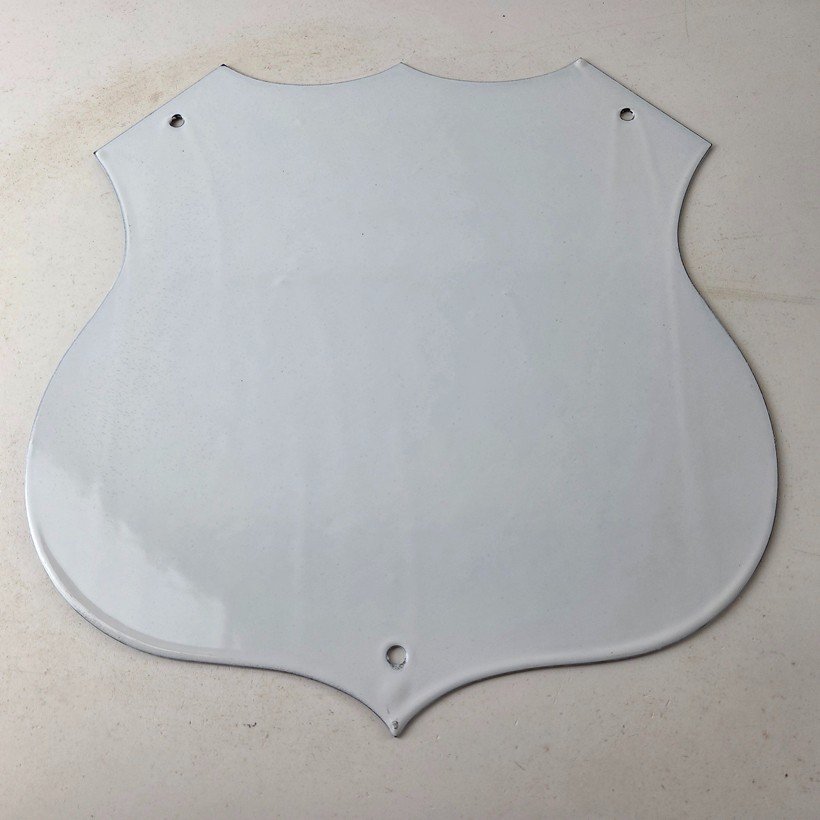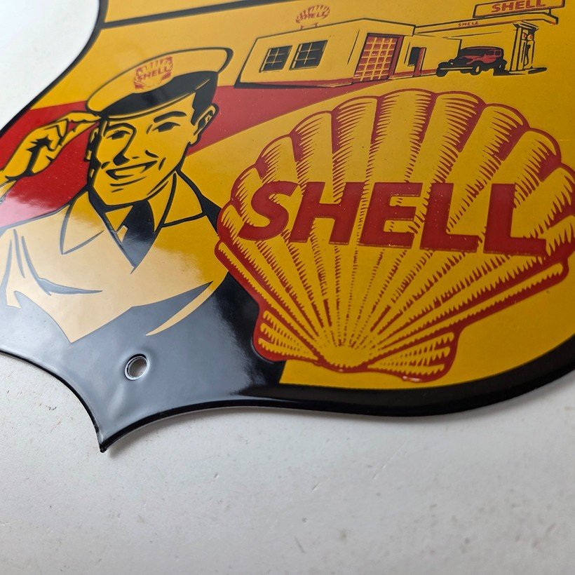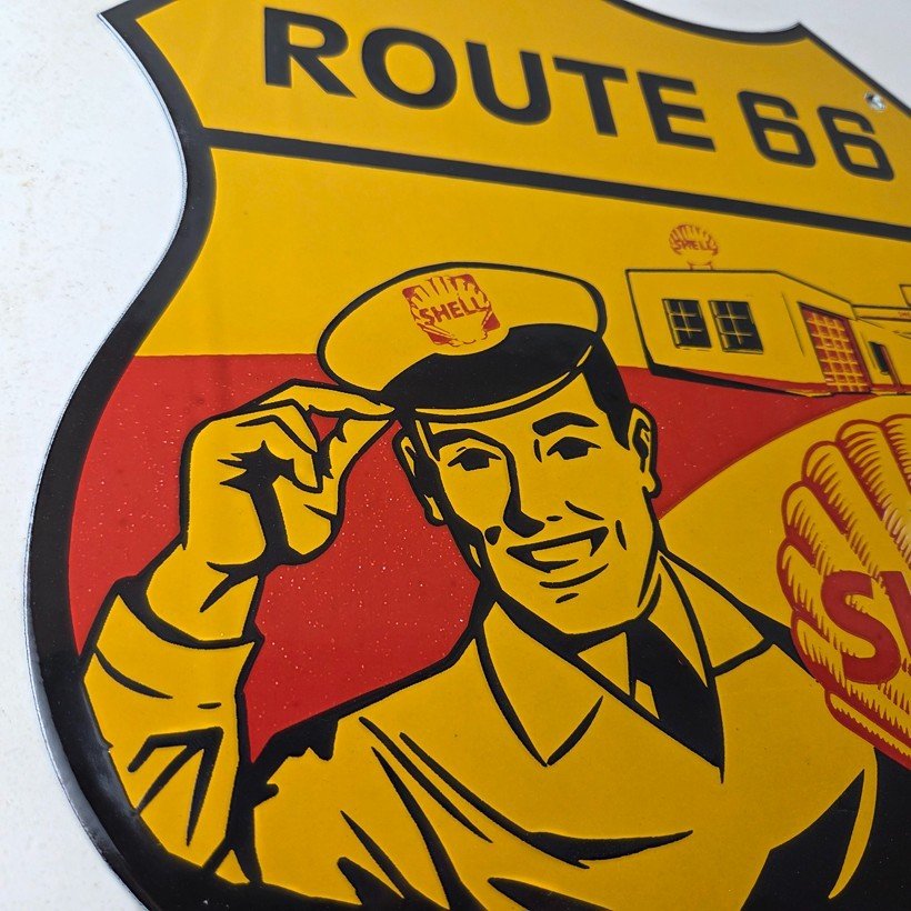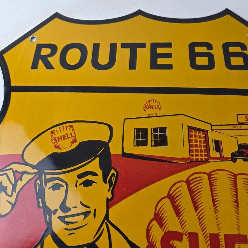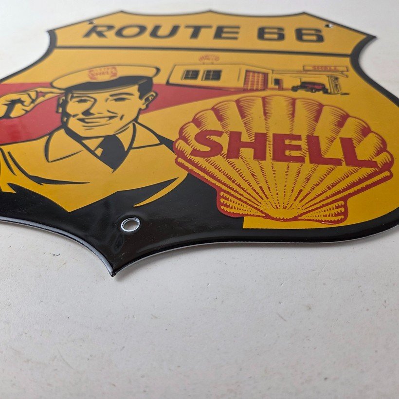 This vintage Shell Gasoline porcelain sign features the Shell Gas Station attendant on Route 66. Measuring 11 1/2 inches by 11 inches in size, this porcelain is in excellent condition with amazing gloss.