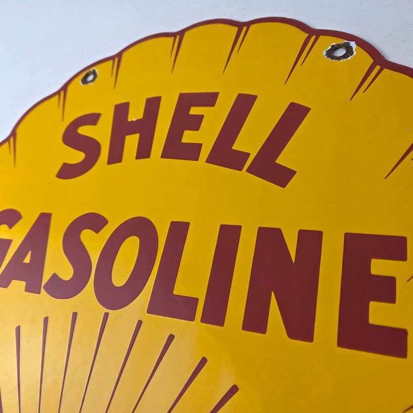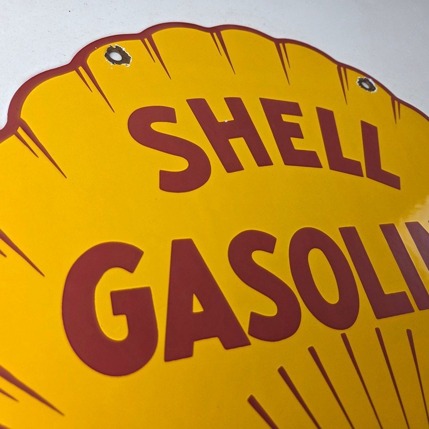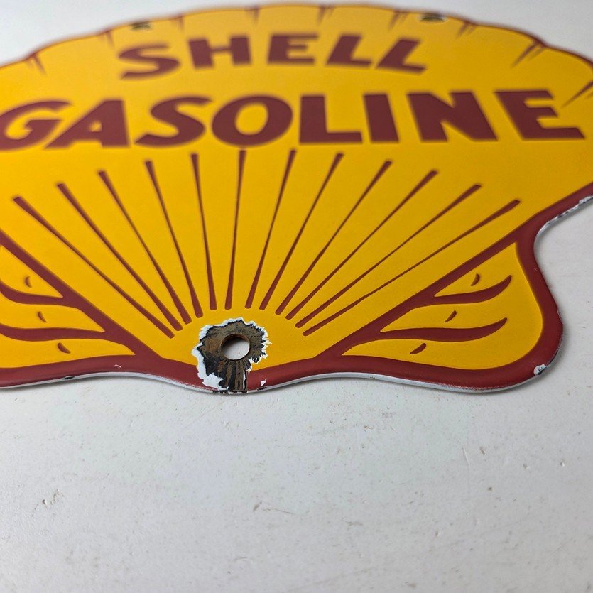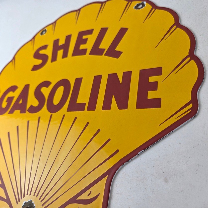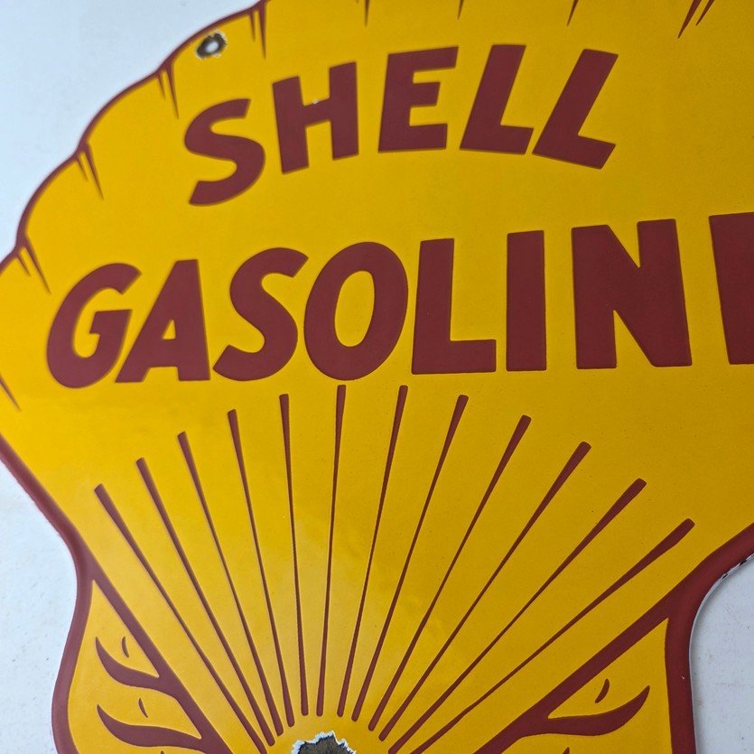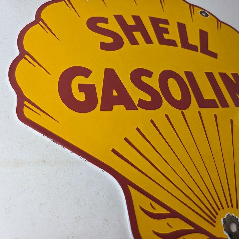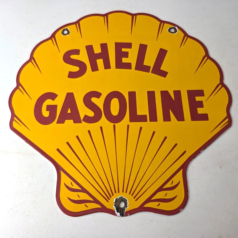 This vintage Shell scallop shell sign makes a great addition to a garage, shop display, man cave, or any Shell Oil memorabilia collection, vintage gas station advertising collection, or petroliana collection.