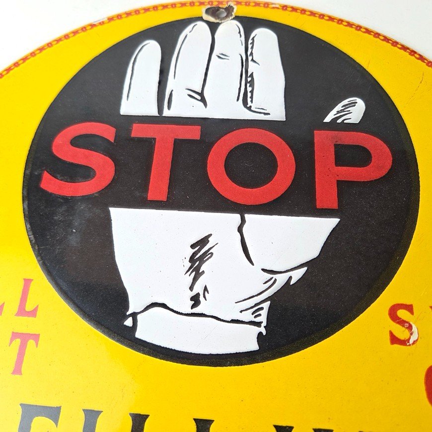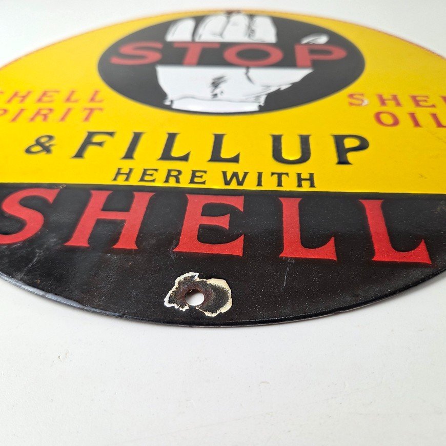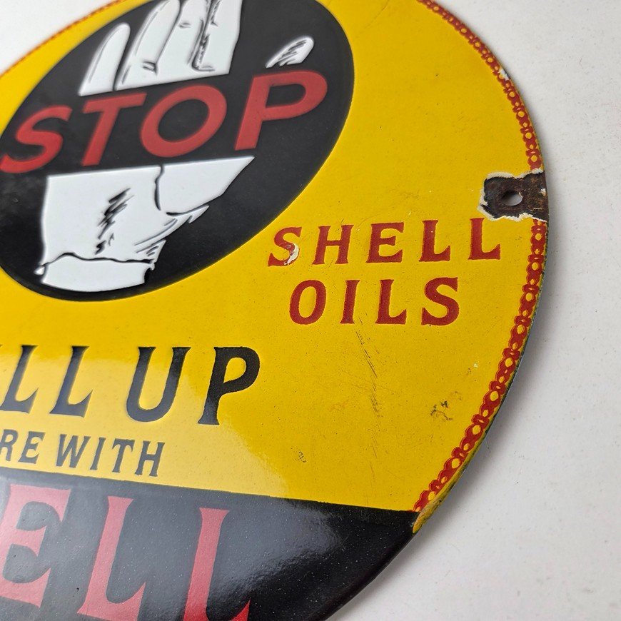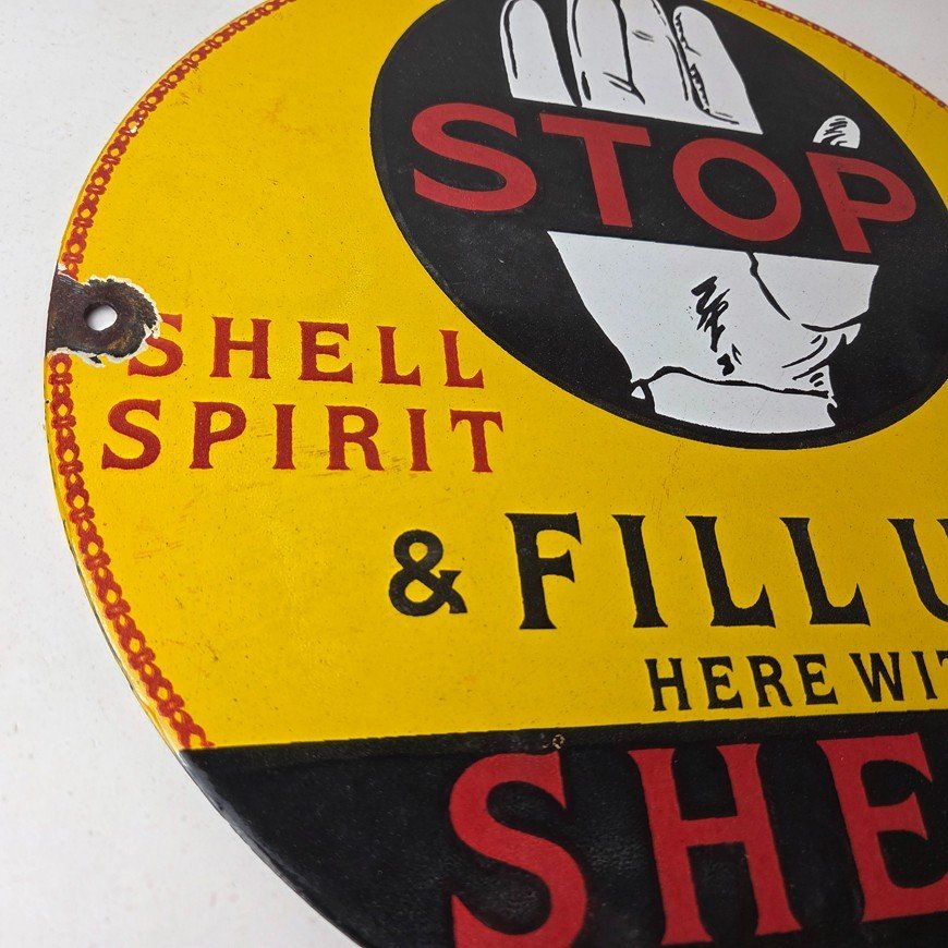 This vintage Super Shell Gasoline porcelain sign featuring a hand with large lettering. This has vibrant colors of red, yellow and black with excellent porcelain and measures 12″ across.