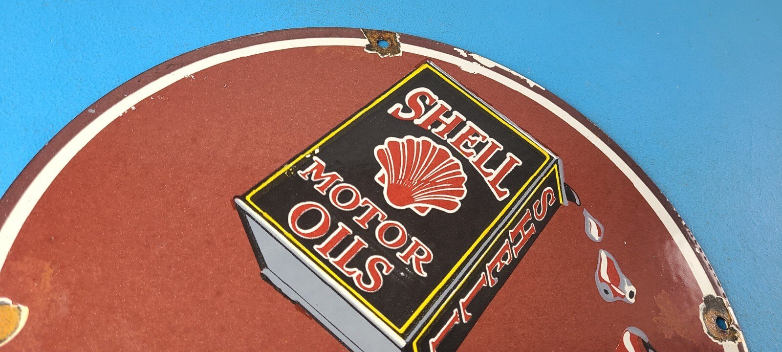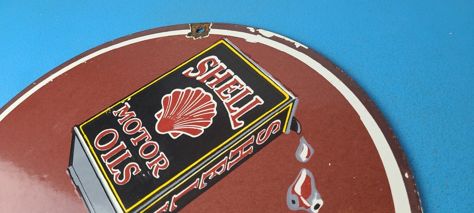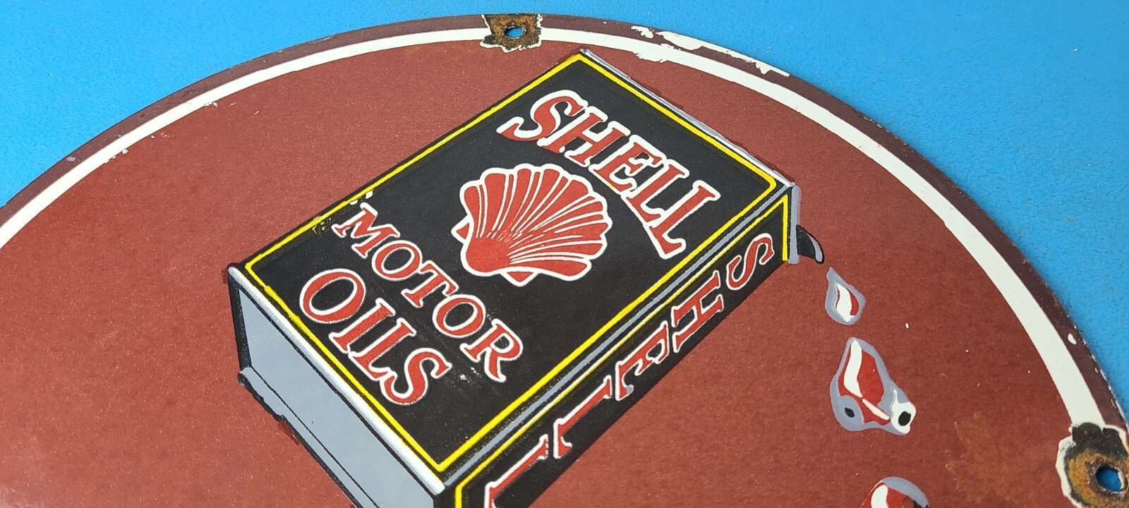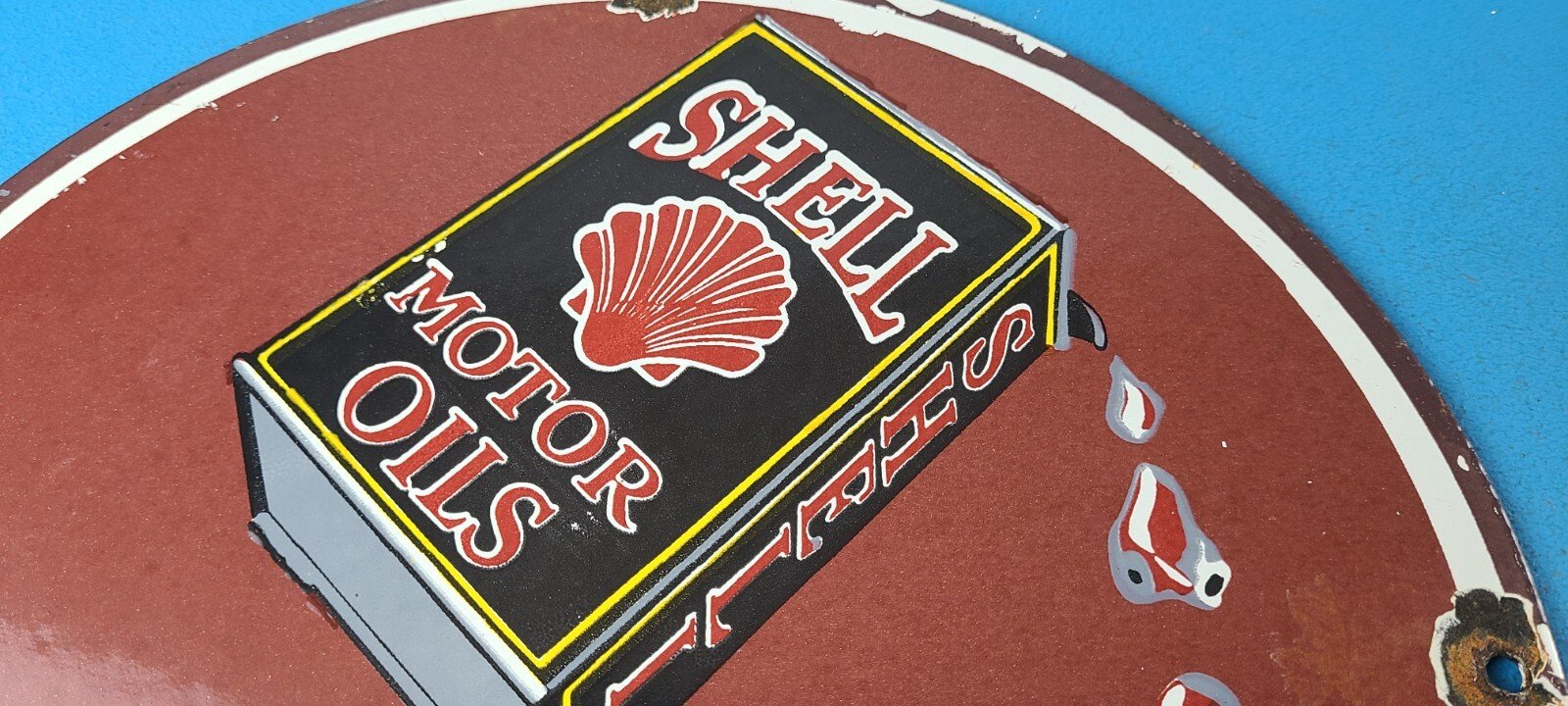 This vintage Shell Gasoline porcelain sign features the Shell Oil can and the automobile at the bottom. Measuring 12 inches in size, this porcelain is in excellent condition with amazing gloss.