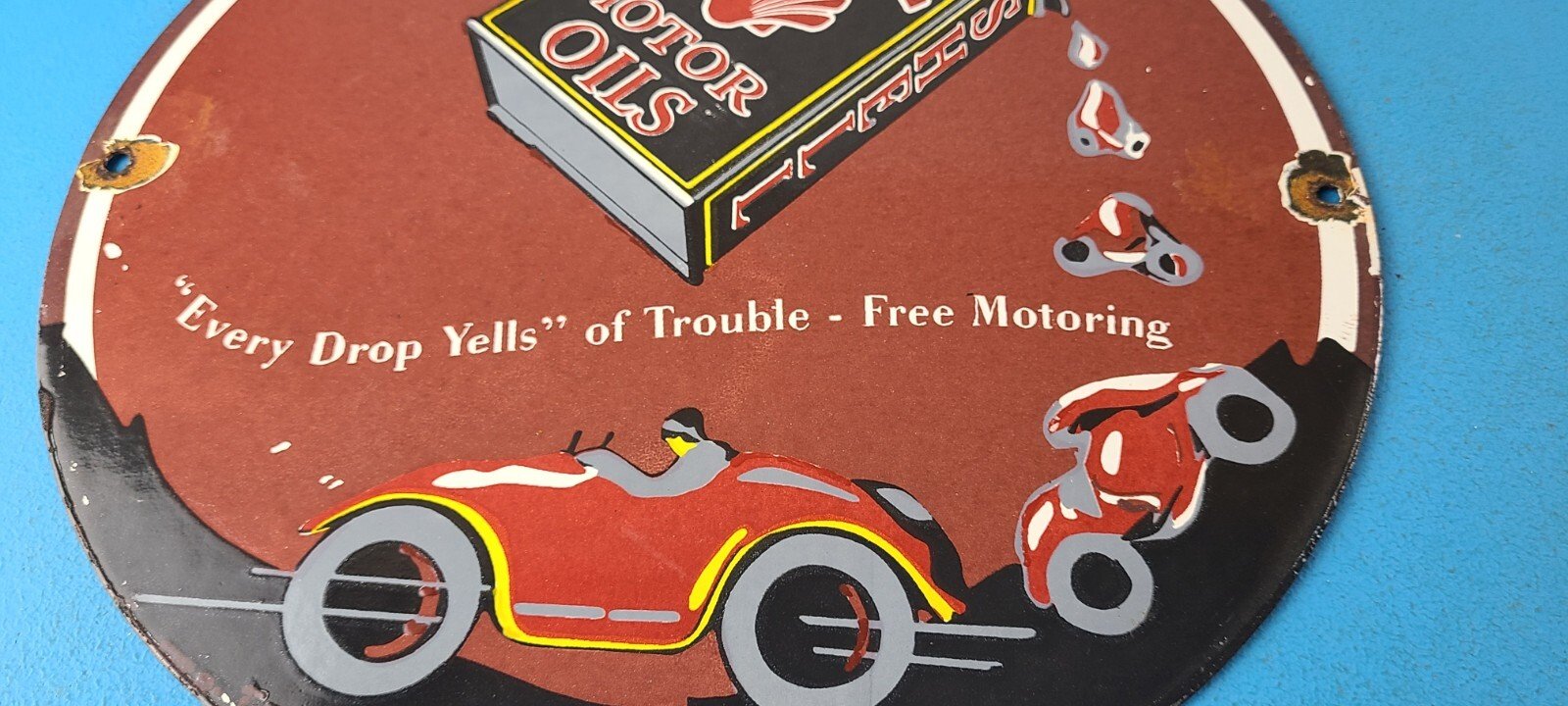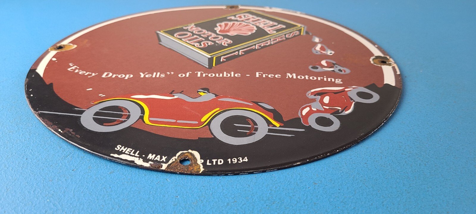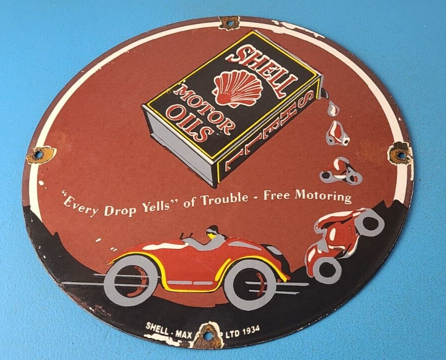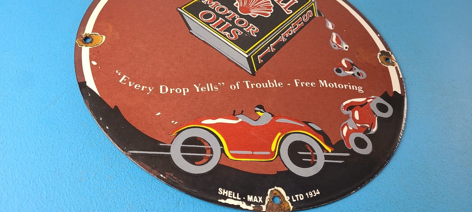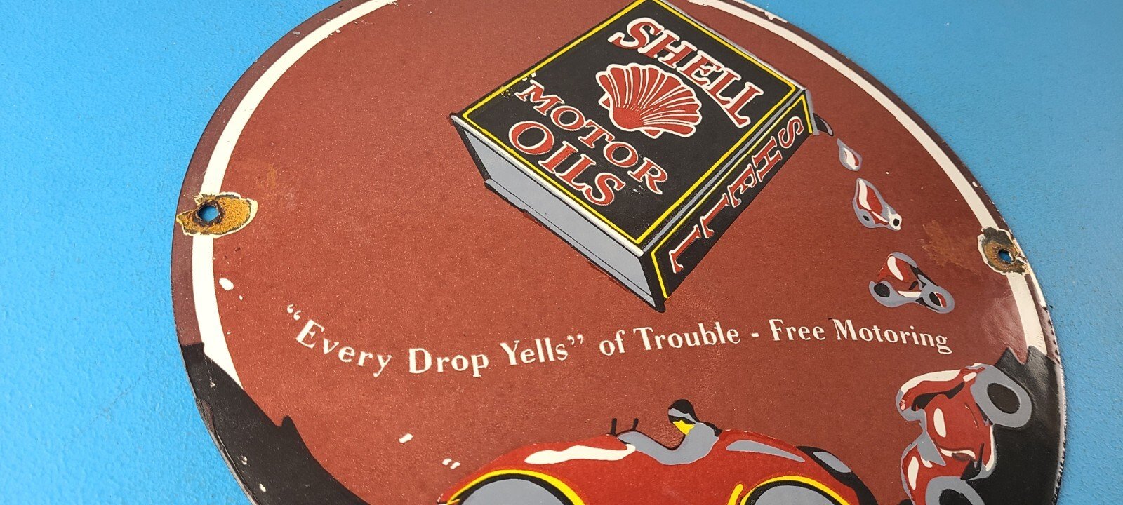 This vintage Shell Gasoline porcelain sign features the Shell Oil can and the automobile at the bottom. Measuring 12 inches in size, this porcelain is in excellent condition with amazing gloss.