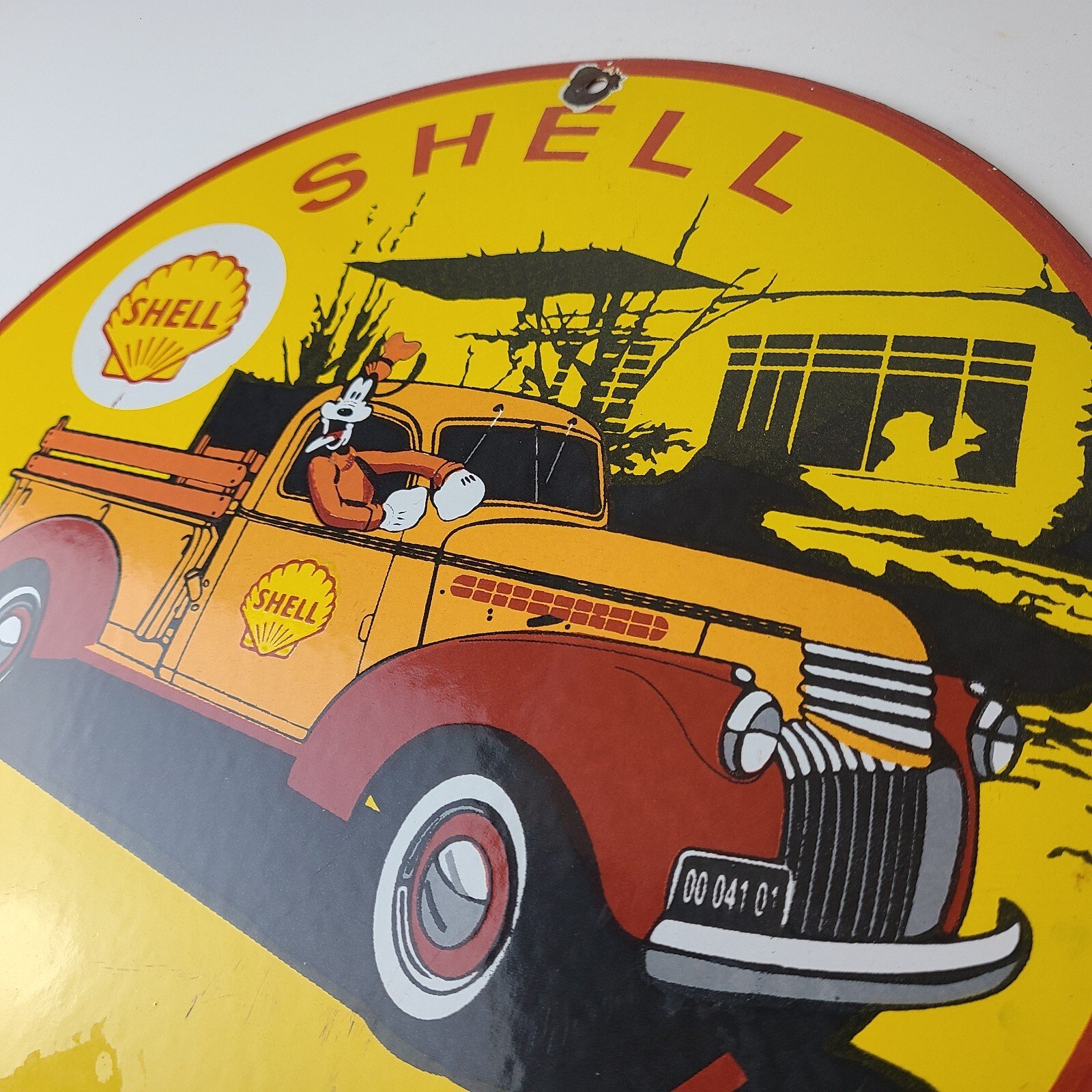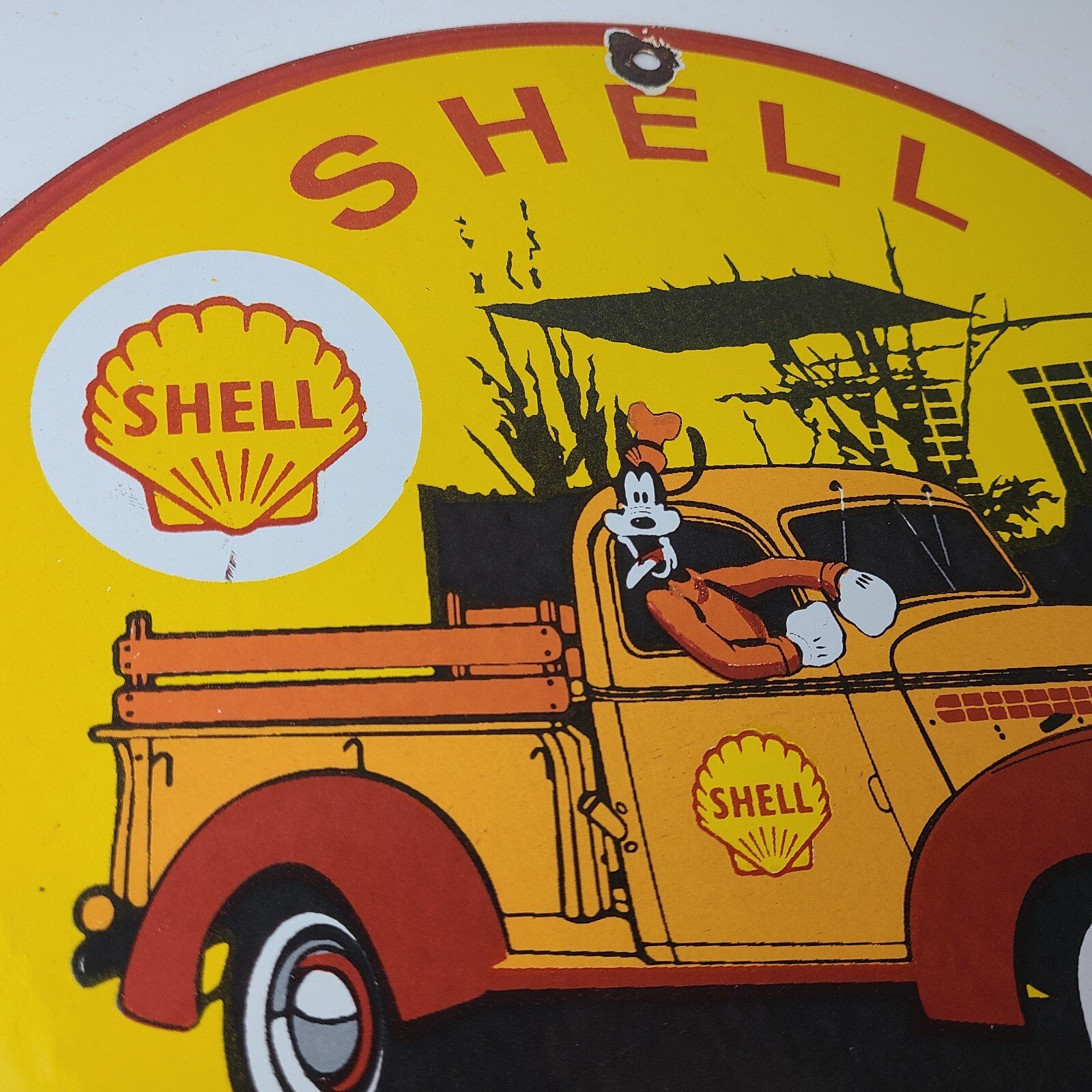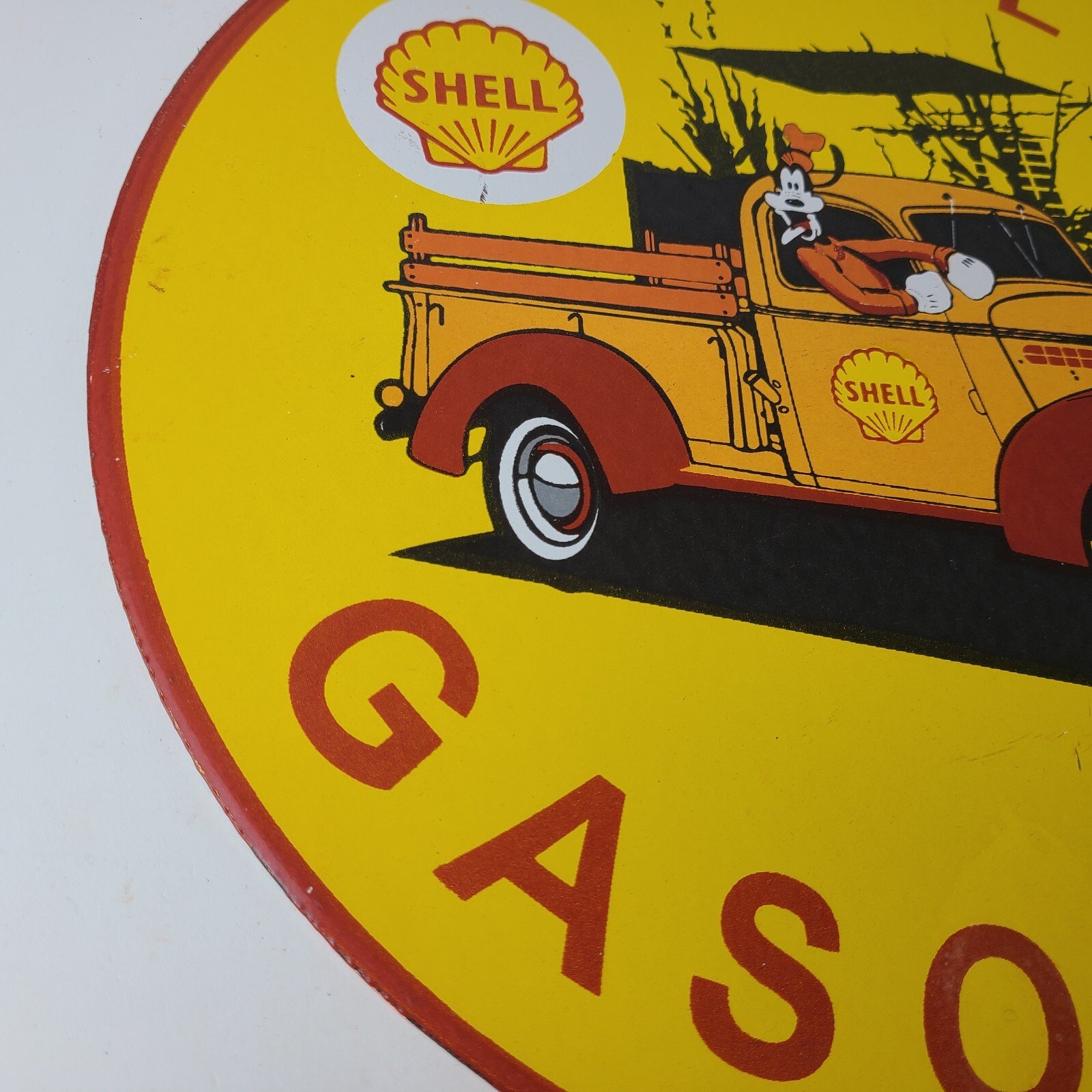 This vintage Shell Gasoline porcelain sign features the beloved Walt Disney character, Goofy. Measuring 12 inches in size, this porcelain is in excellent condition with amazing gloss.