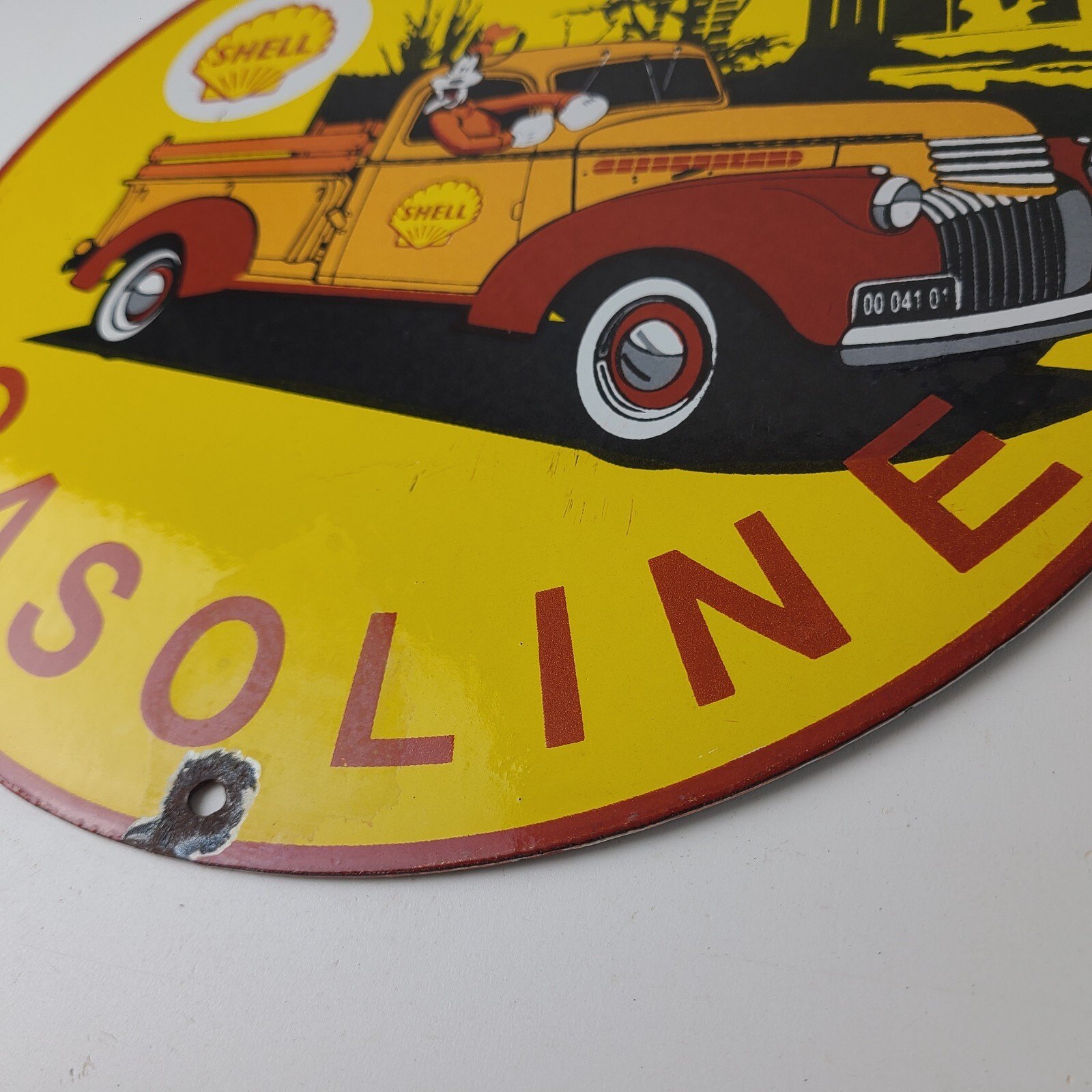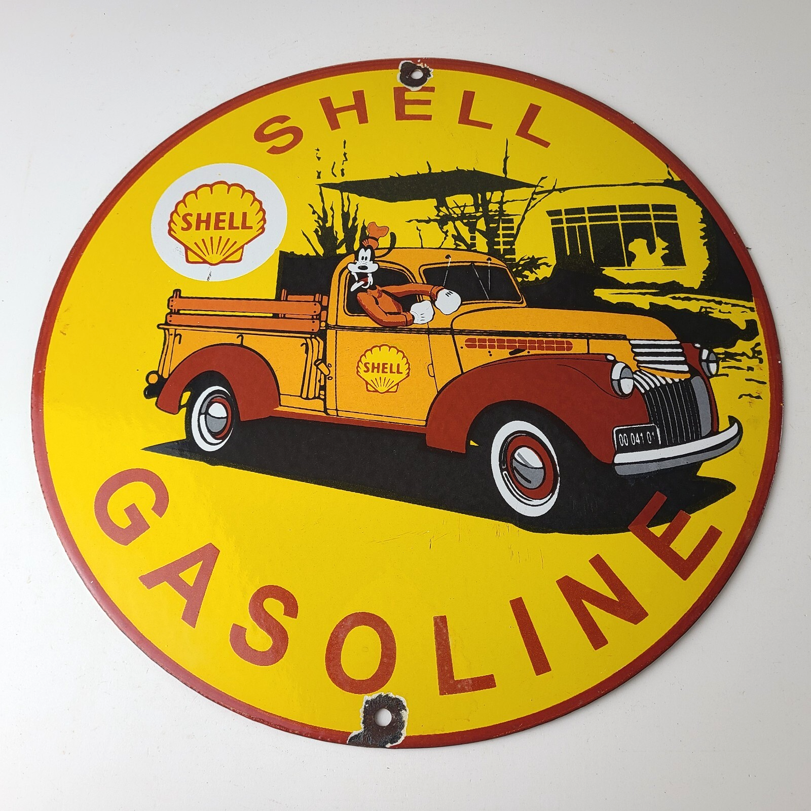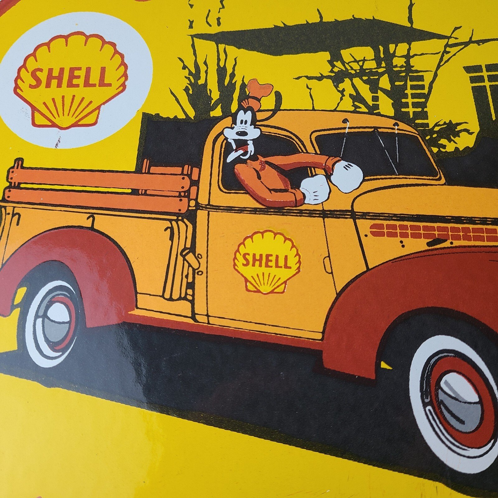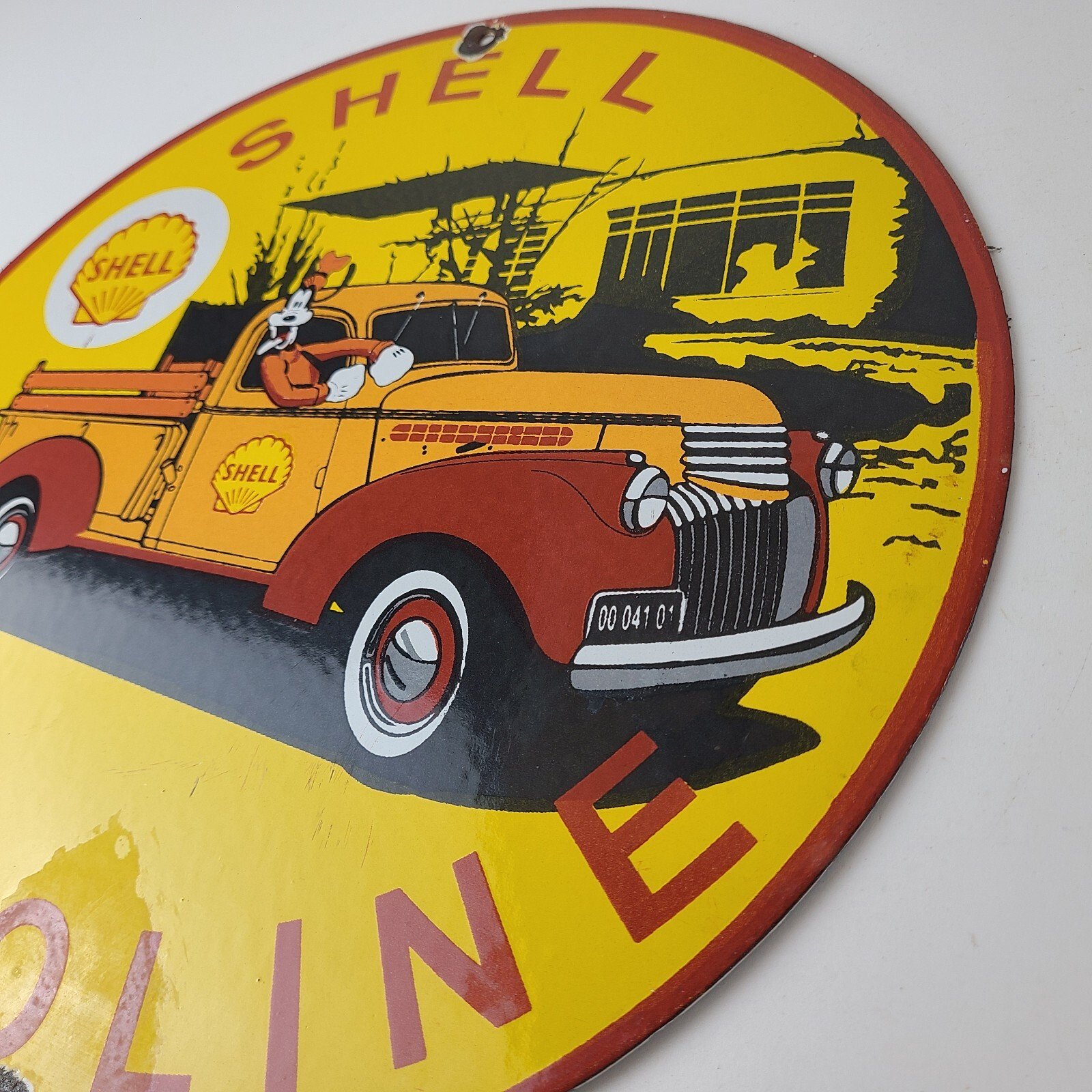 This vintage Shell Gasoline porcelain sign features the beloved Walt Disney character, Goofy. Measuring 12 inches in size, this porcelain is in excellent condition with amazing gloss.