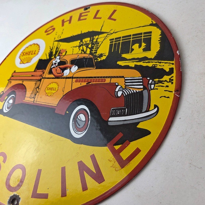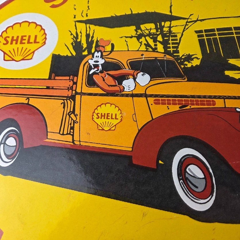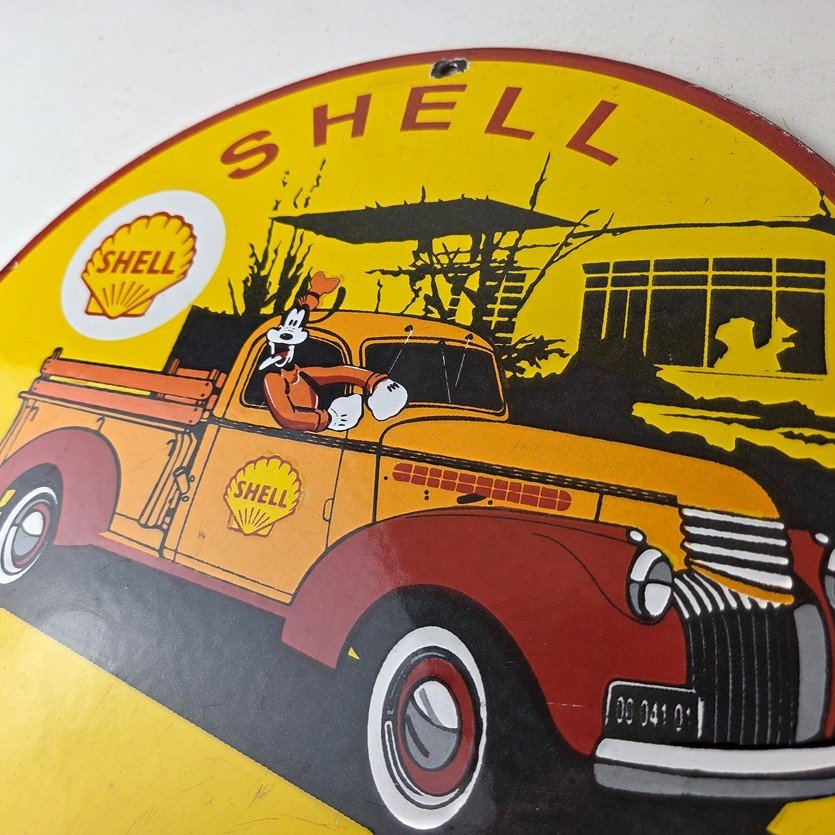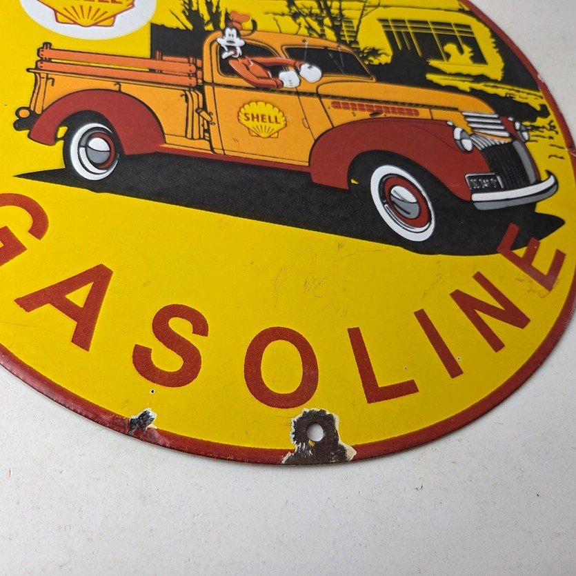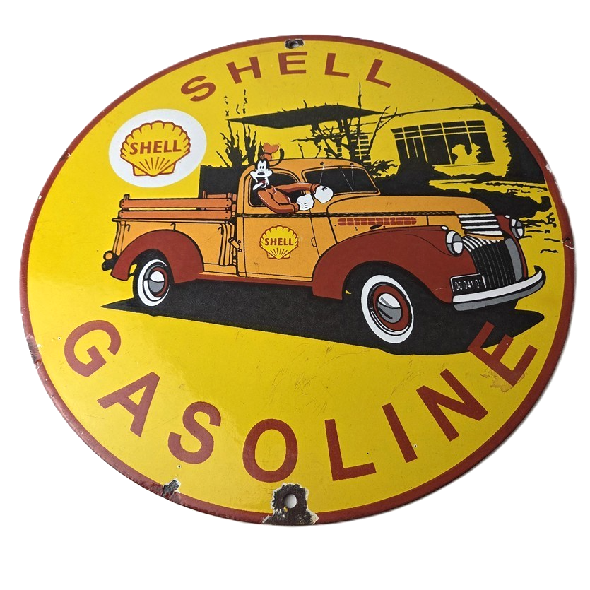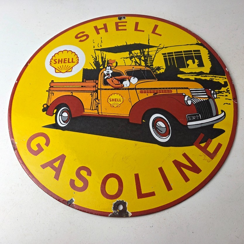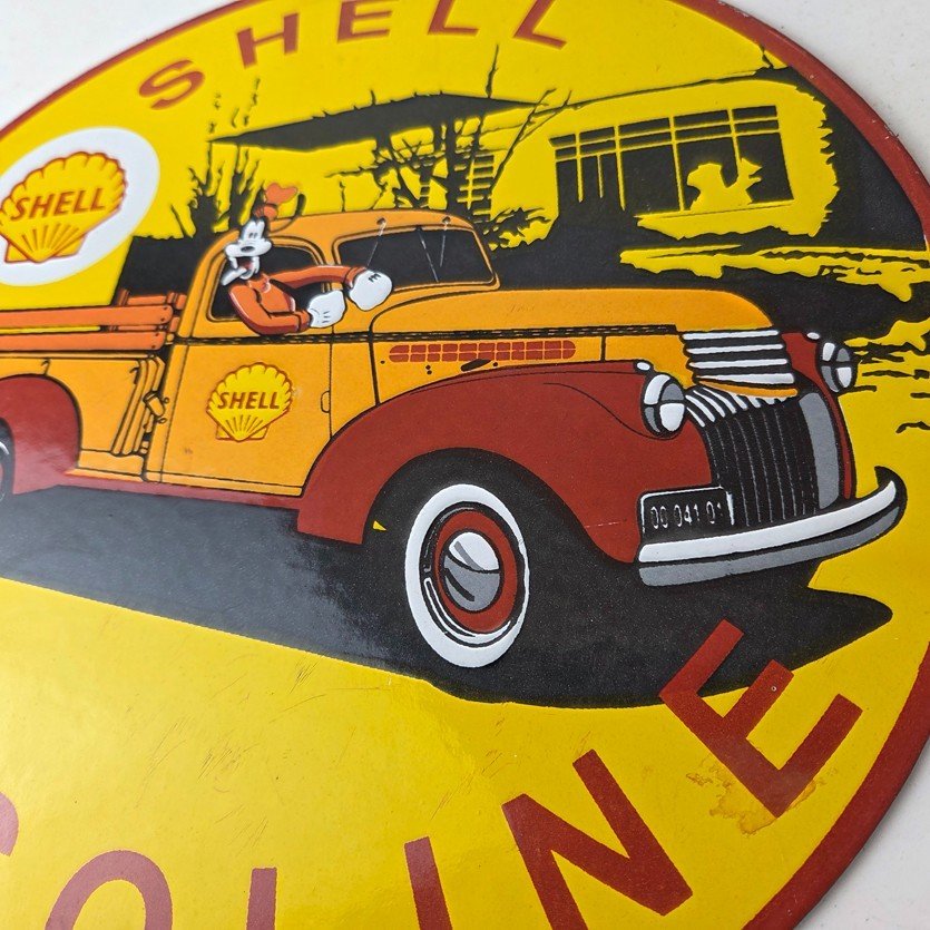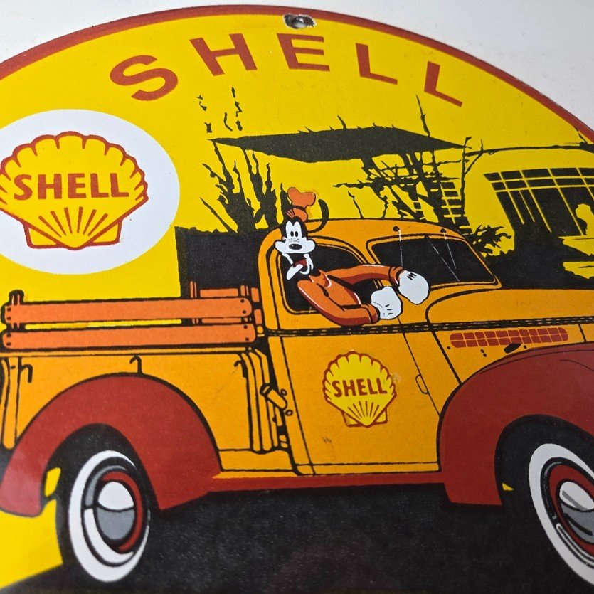 This vintage Shell Gasoline porcelain sign features the beloved Walt Disney character, Goofy. Measuring 12 inches in size, this porcelain is in excellent condition with amazing gloss.