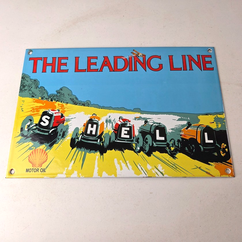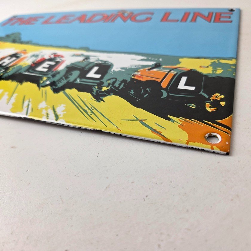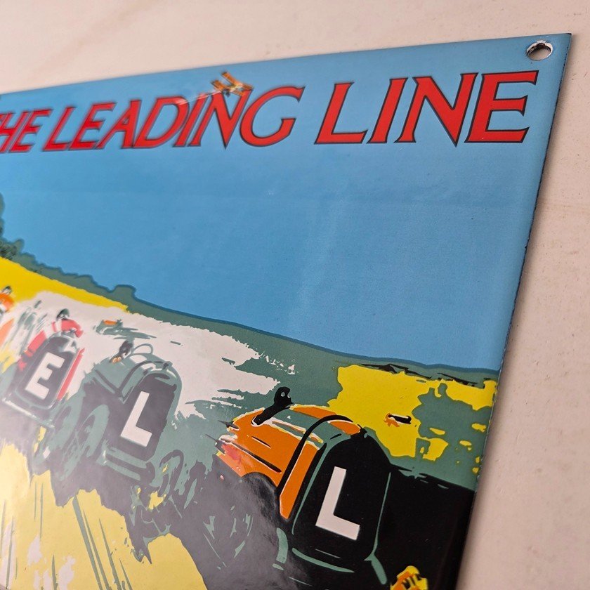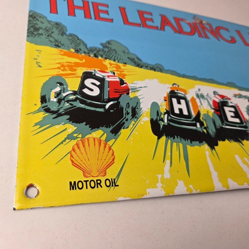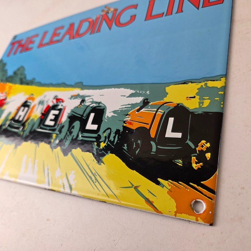 This vintage Shell Gasoline porcelain sign features the Leading Line with the old race cars. Measuring 11 3/4 inches by 7 3/4 inches in size, this porcelain is in excellent condition with amazing gloss.