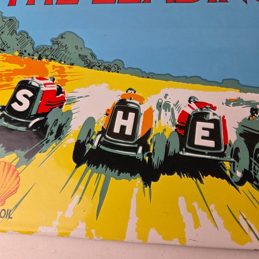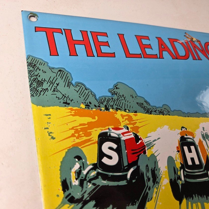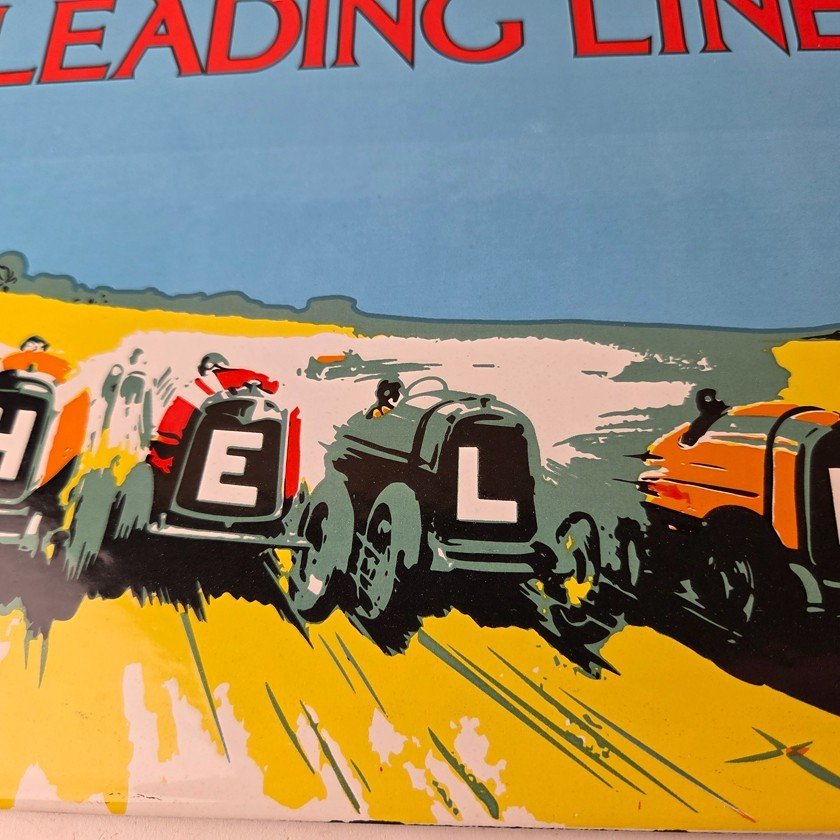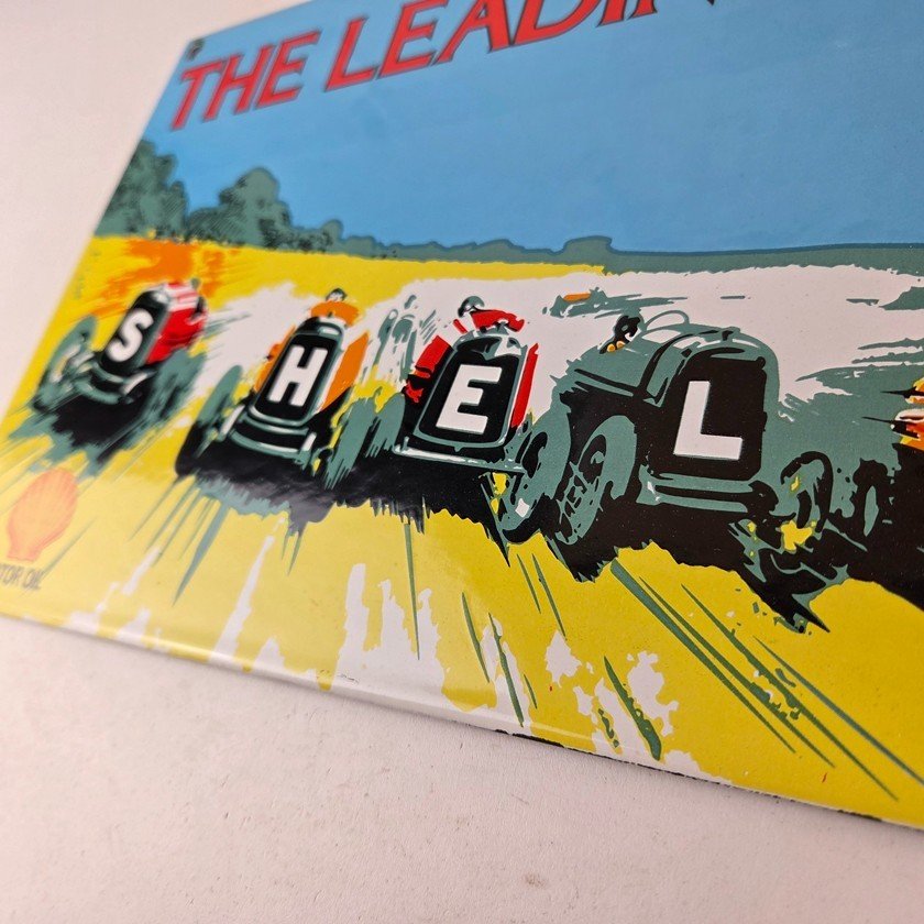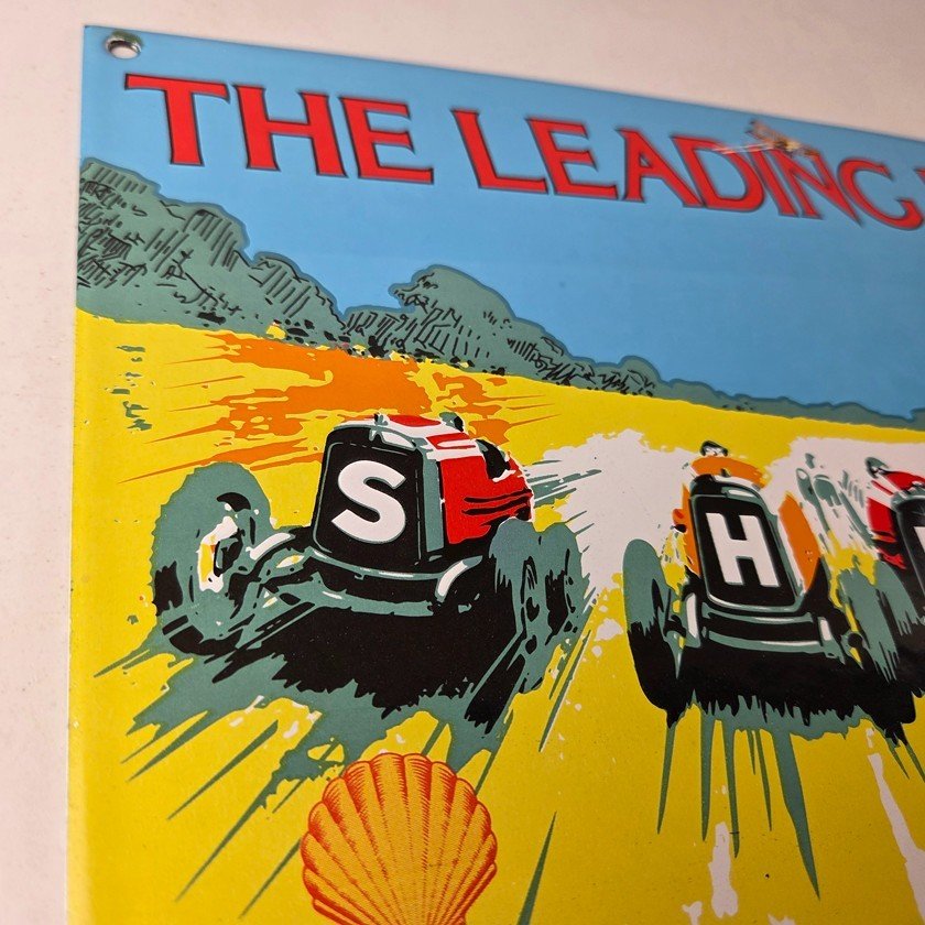 This vintage Shell Gasoline porcelain sign features the Leading Line with the old race cars. Measuring 11 3/4 inches by 7 3/4 inches in size, this porcelain is in excellent condition with amazing gloss.