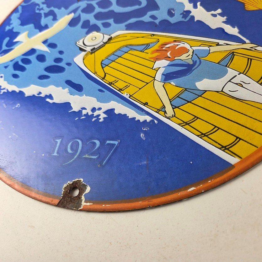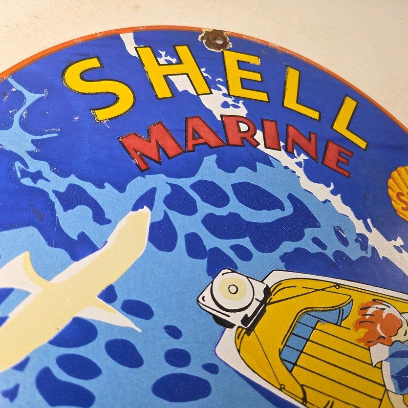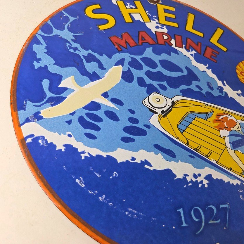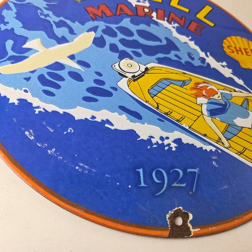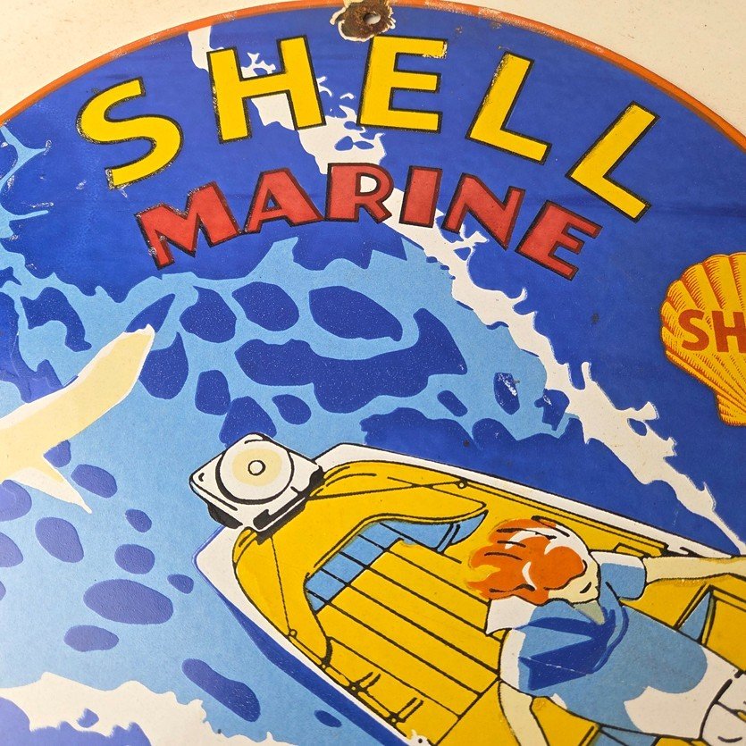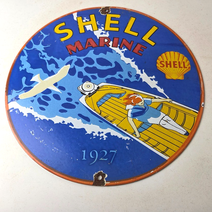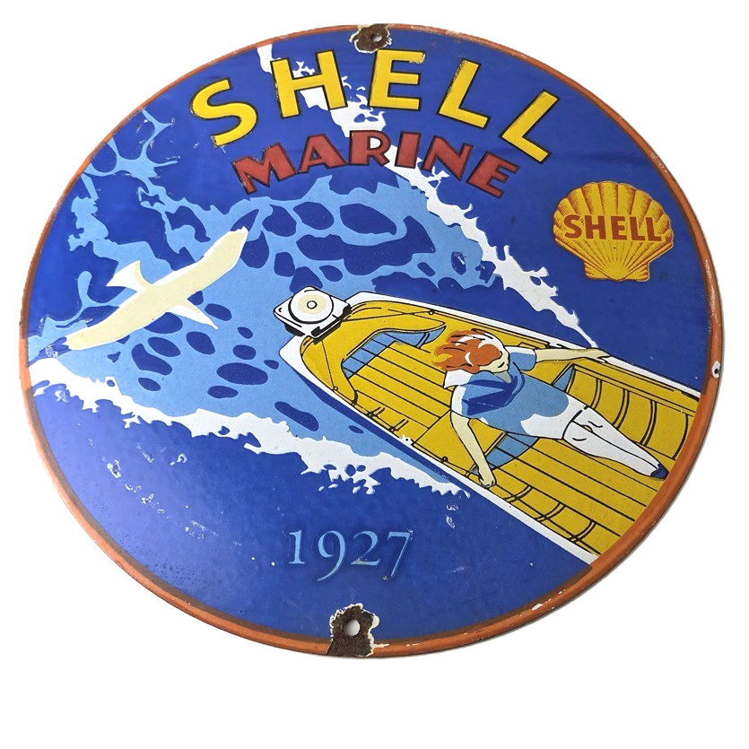 This vintage Shell porcelain sign is an excellent addition for a gas and oil collector and has the neat graphic of the woman in a boat. The sign features the Shell lettering and the iconic colors of Shell Gasoline. Measuring at 12″, this sign is a great addition to any vintage memorabilia collection. The sign is perfect for display in any garage, sign collection, shop or man cave and is sure to be a great center piece.