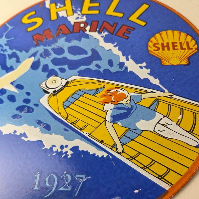 This vintage Shell porcelain sign is an excellent addition for a gas and oil collector and has the neat graphic of the woman in a boat. The sign features the Shell lettering and the iconic colors of Shell Gasoline. Measuring at 12″, this sign is a great addition to any vintage memorabilia collection. The sign is perfect for display in any garage, sign collection, shop or man cave and is sure to be a great center piece.