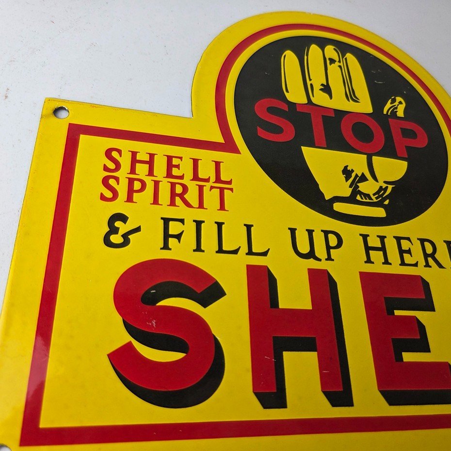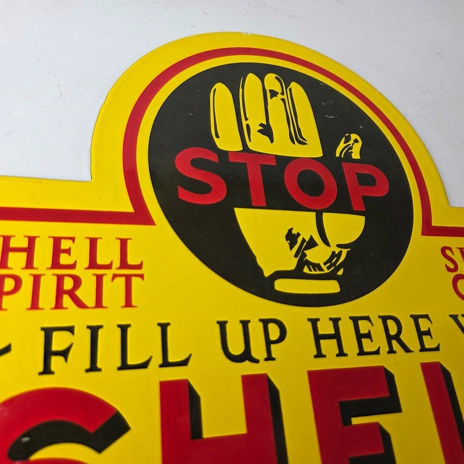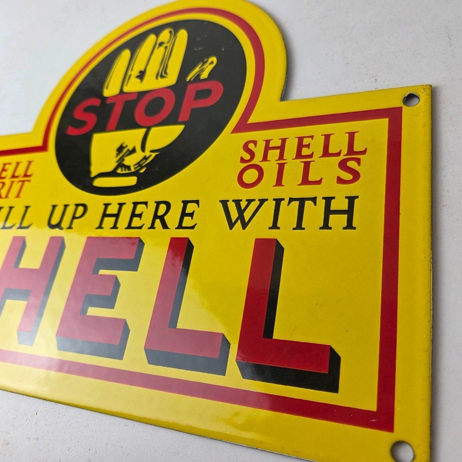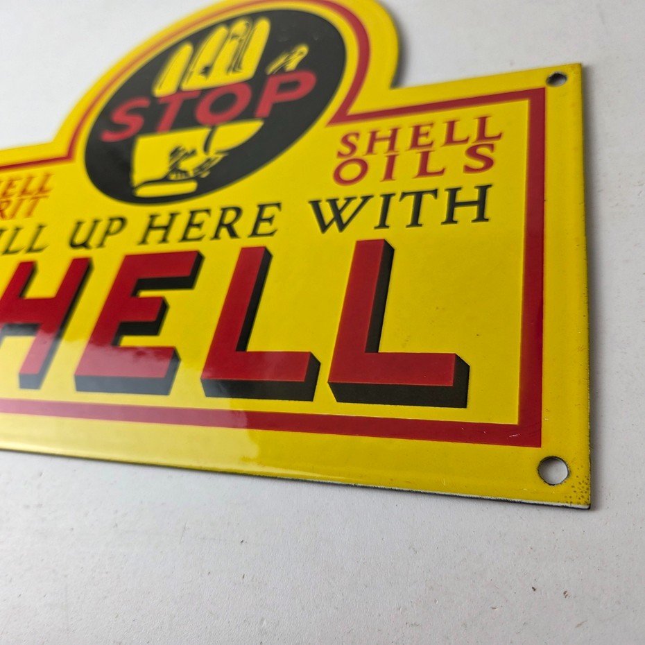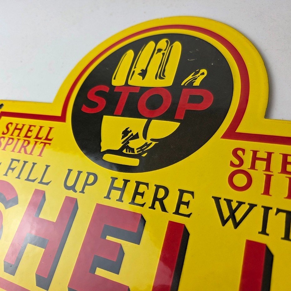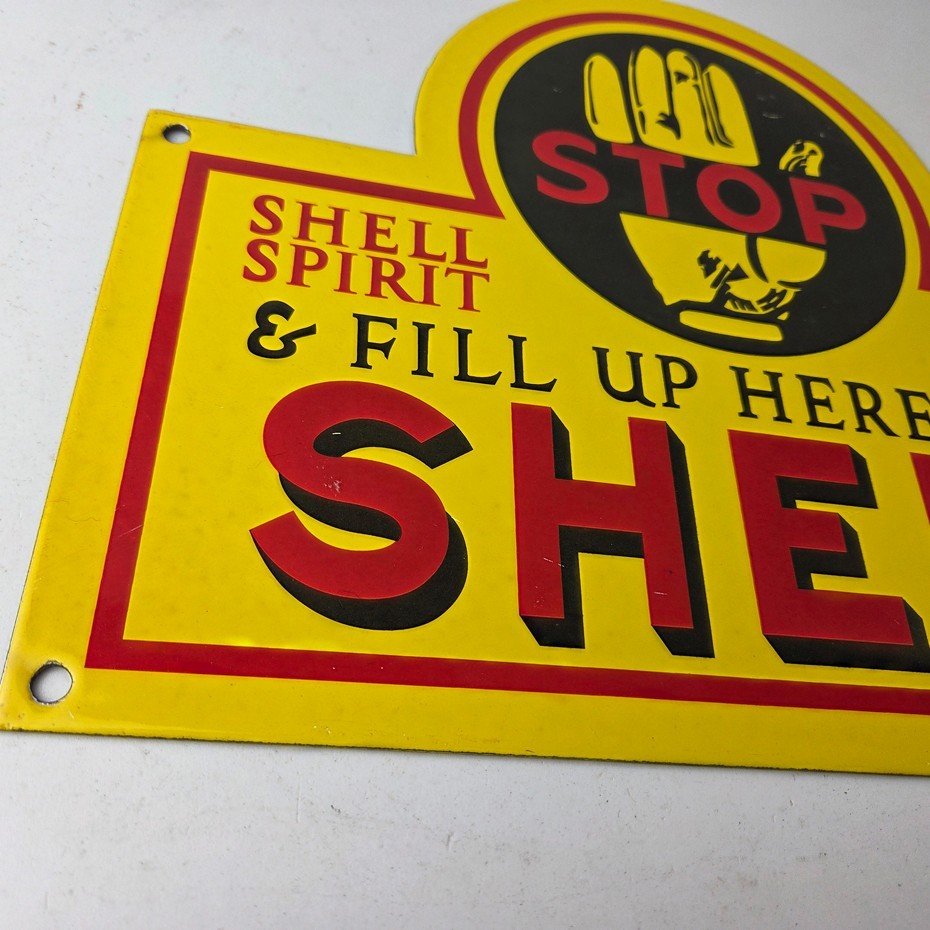 This vintage Shell Gasoline porcelain sign features the iconic Shell Gasoline branding and is made of porcelain. The sign measures 11 3/4″ x 9 1/2″ and has excellent colors and porcelain.