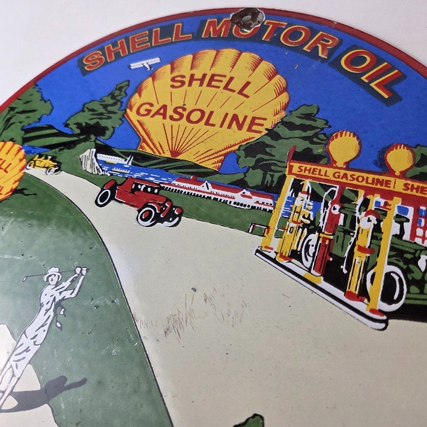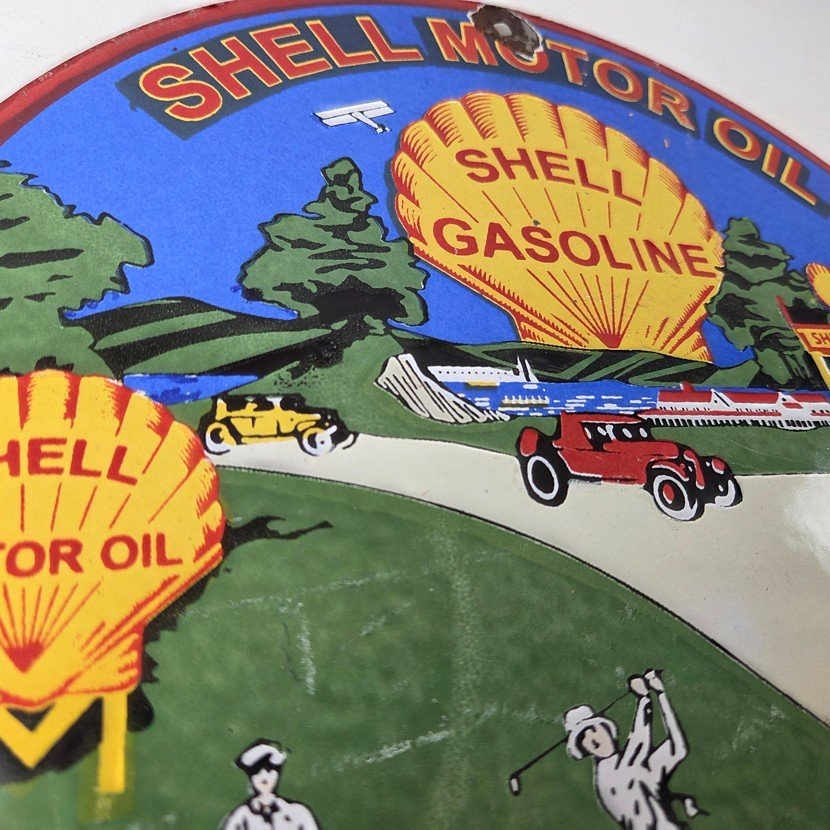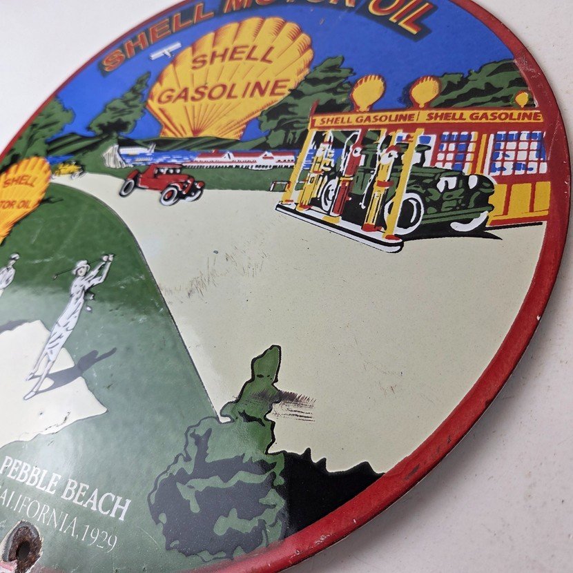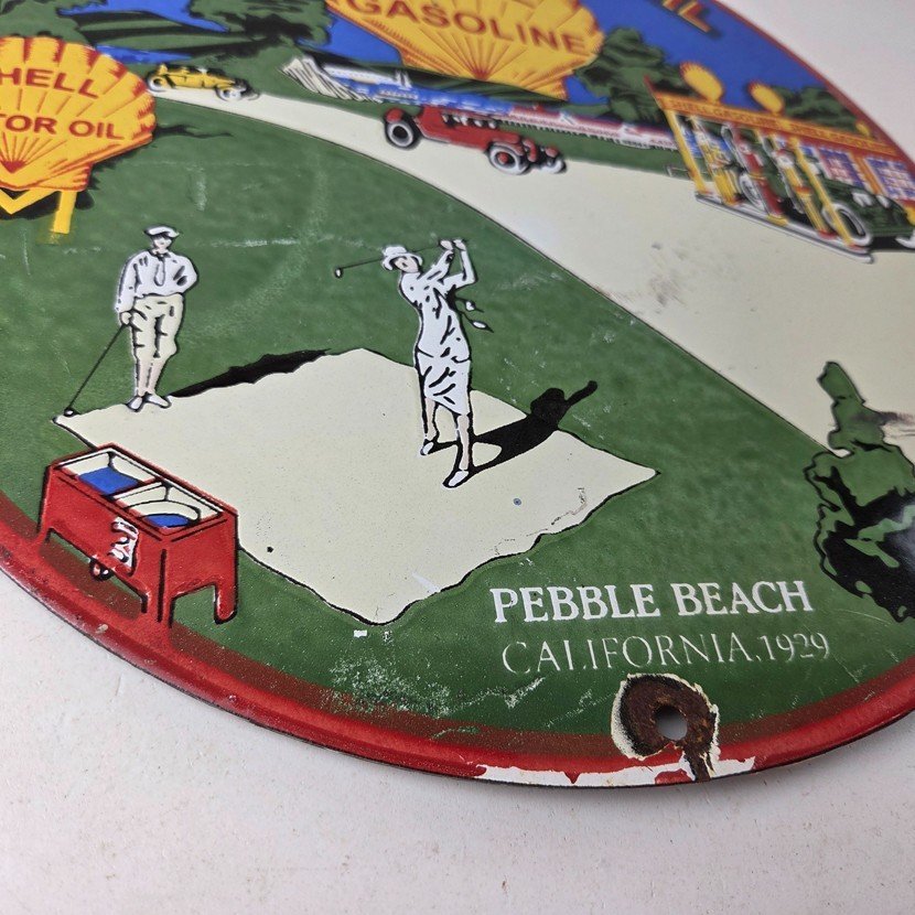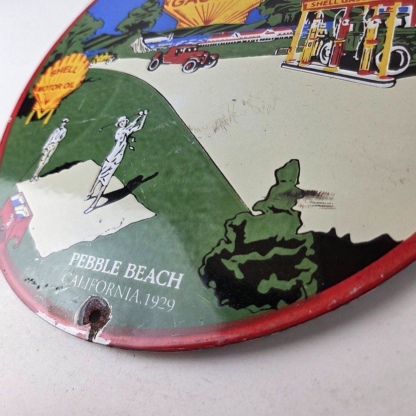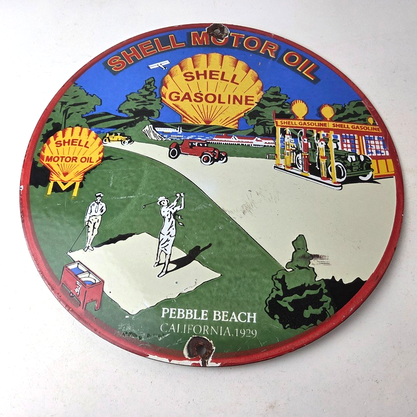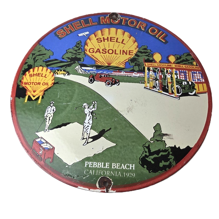 This vintage Shell Gasoline porcelain sign features the Pebble Beach California service station. Measuring 12 inches in size, this porcelain is in excellent condition with amazing gloss.