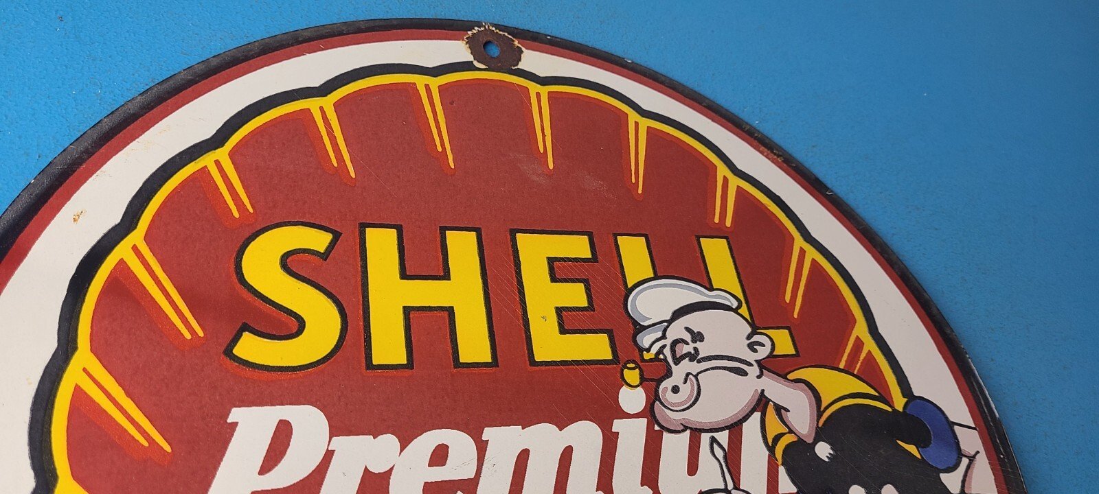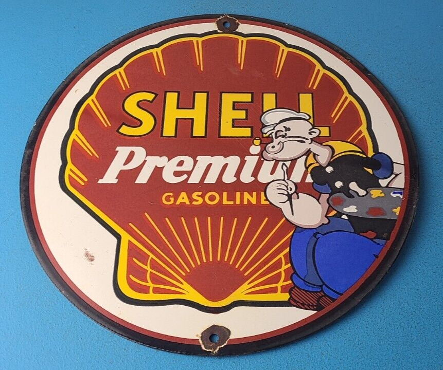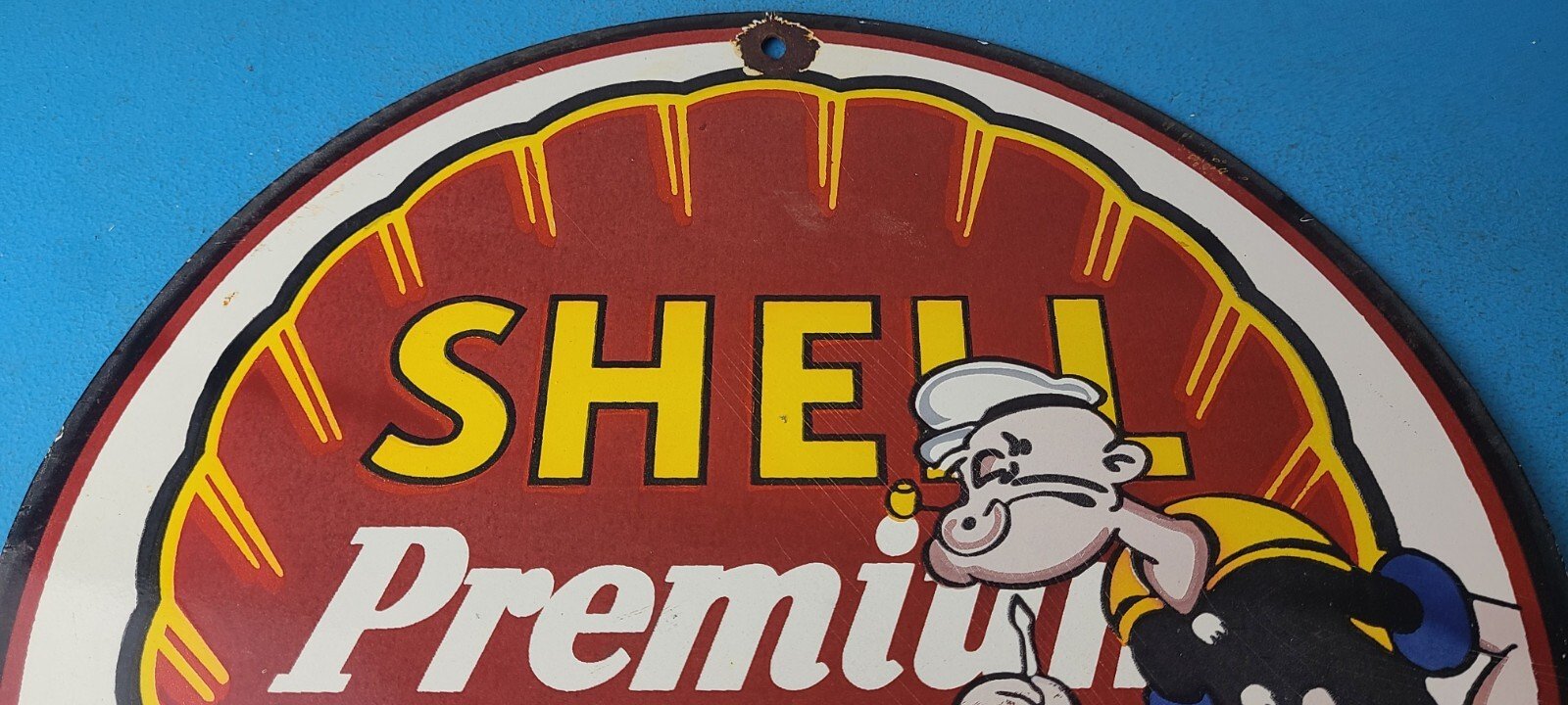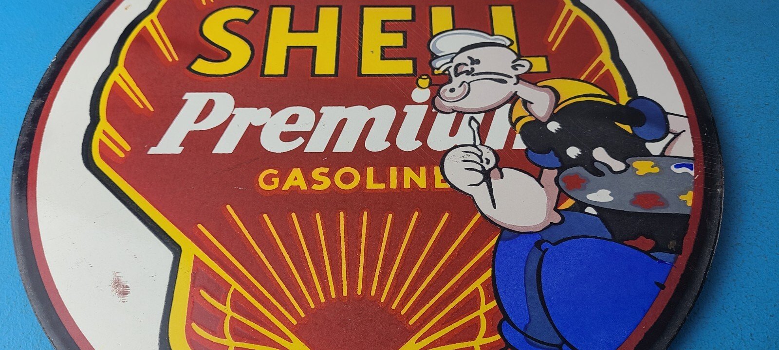 This vintage Shell Gasoline porcelain sign features the beloved character Popeye the Sailor with the large Red Shell clam-shell shape in the background. Measuring 12 inches in size, this porcelain is in excellent condition with amazing gloss.