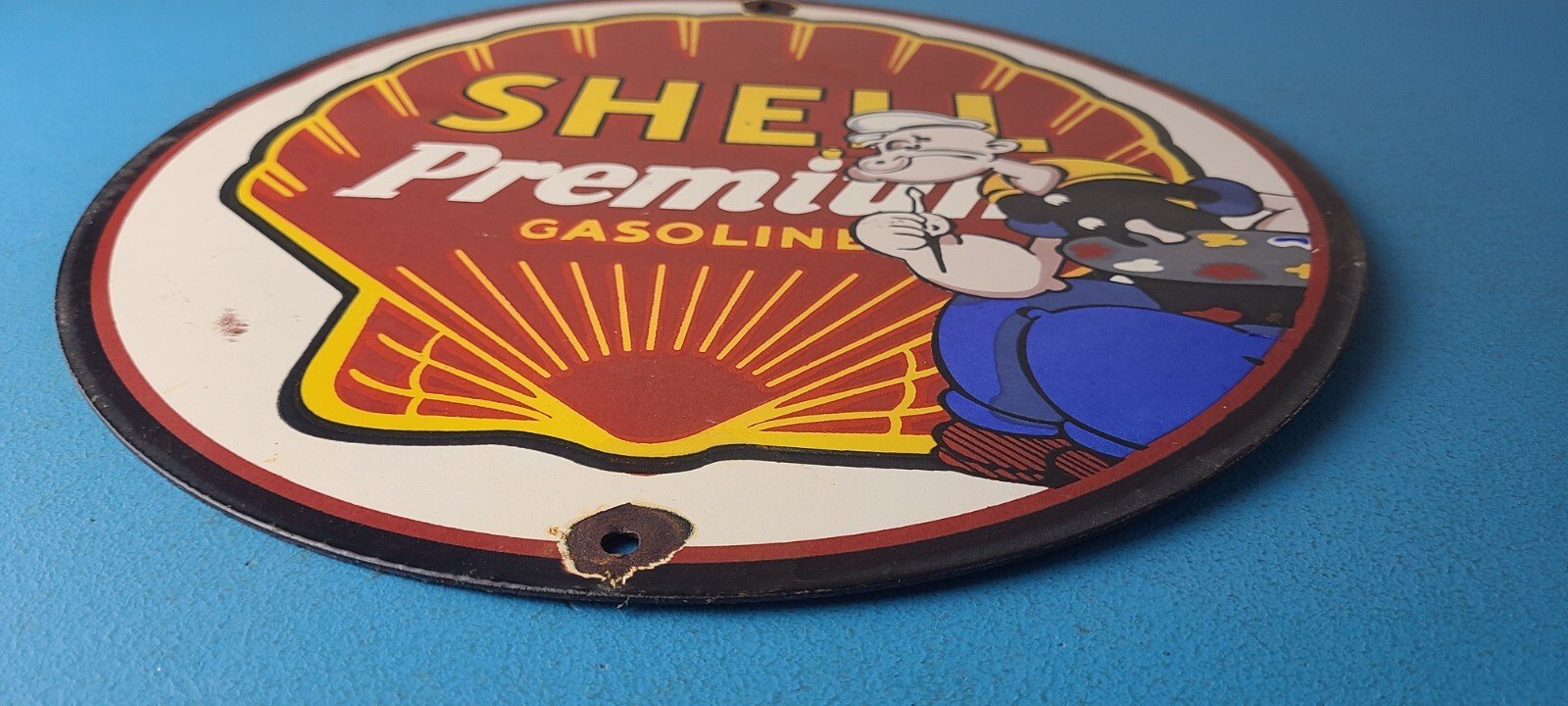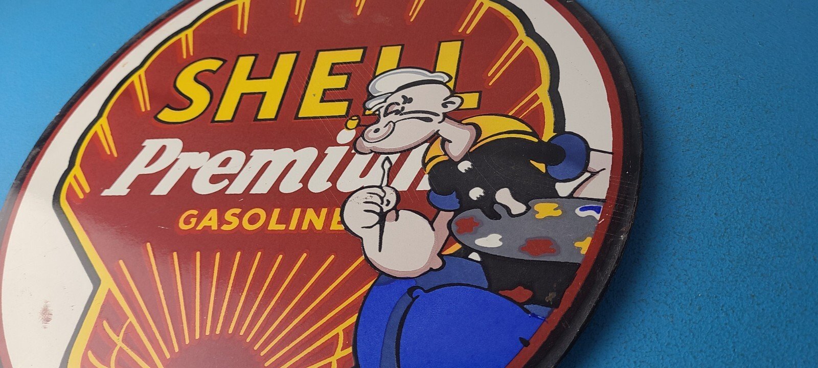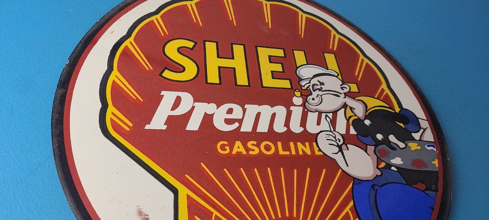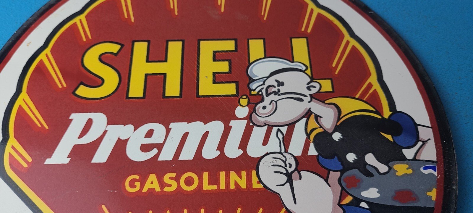 This vintage Shell Gasoline porcelain sign features the beloved character Popeye the Sailor with the large Red Shell clam-shell shape in the background. Measuring 12 inches in size, this porcelain is in excellent condition with amazing gloss.
