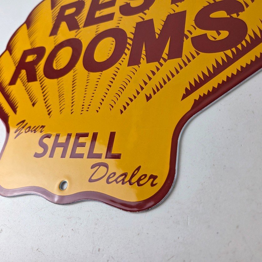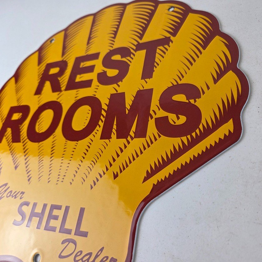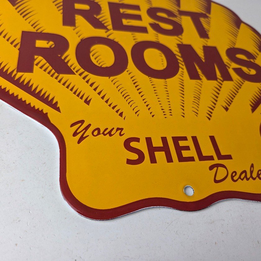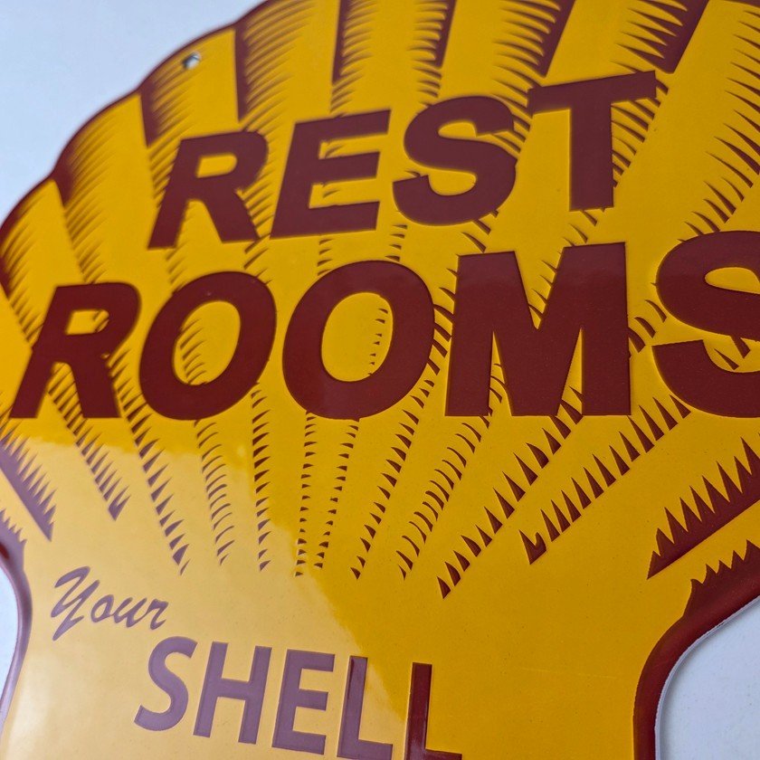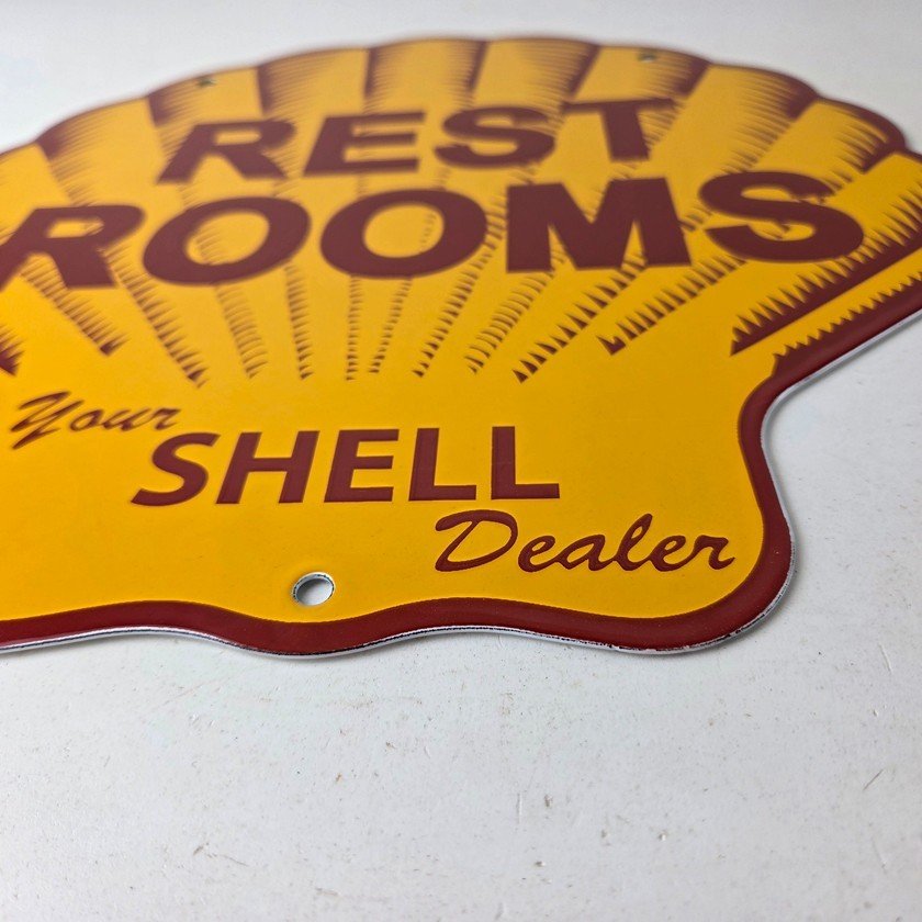 This vintage Shell porcelain sign is an excellent addition for a gas and oil collector and has the neat graphic of the Shell Rest Rooms lettering. The sign features the Clam Shell shape and the iconic colors of Shell Gasoline. Measuring at 11 3/4″ by 11 3/4″, this sign is a great addition to any vintage memorabilia collection. The sign is perfect for display in any garage, sign collection, shop or man cave and is sure to be a great center piece.