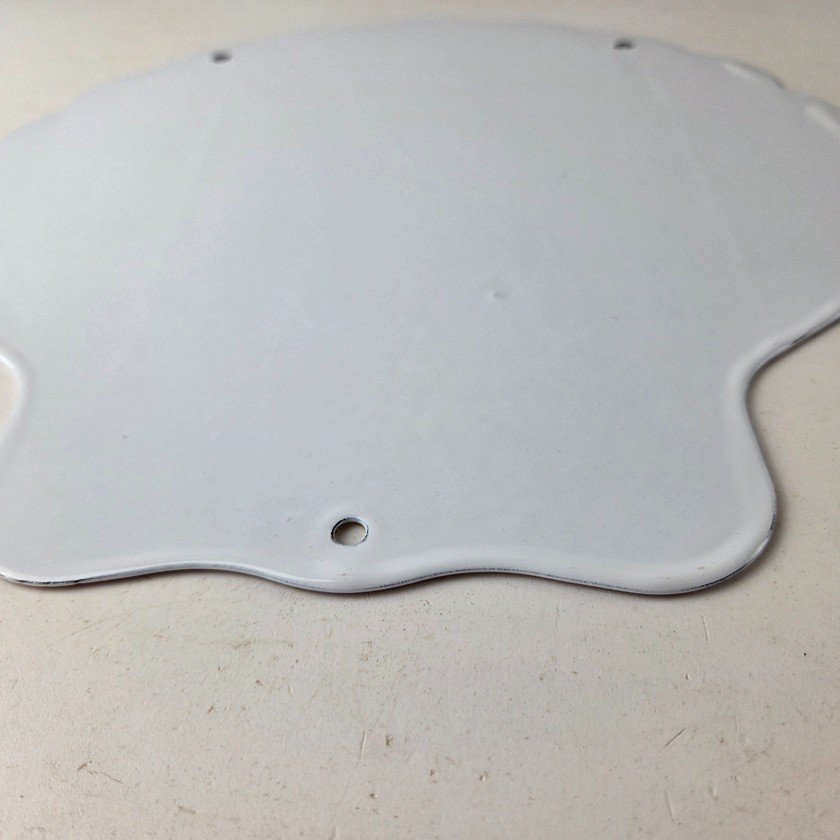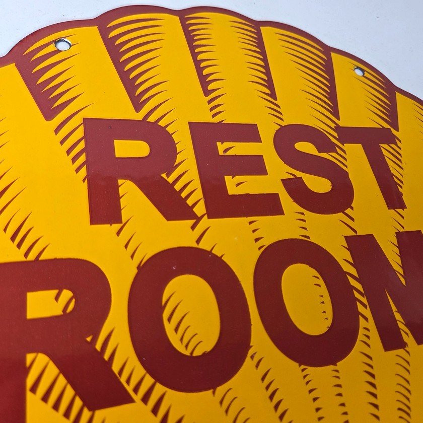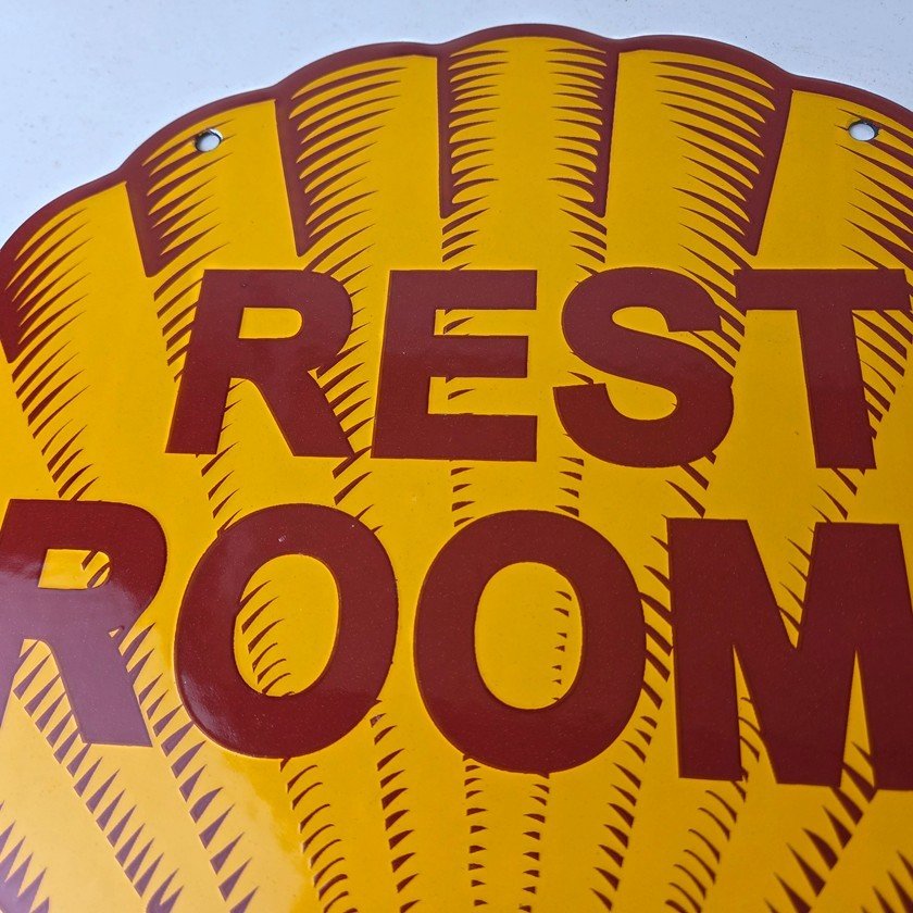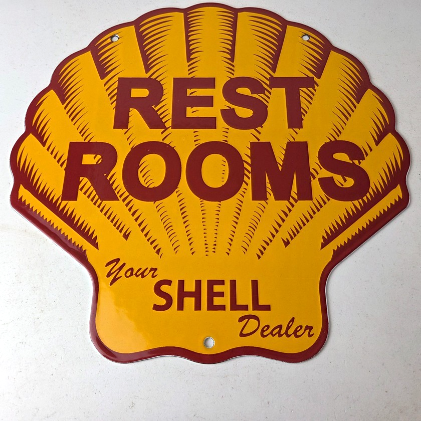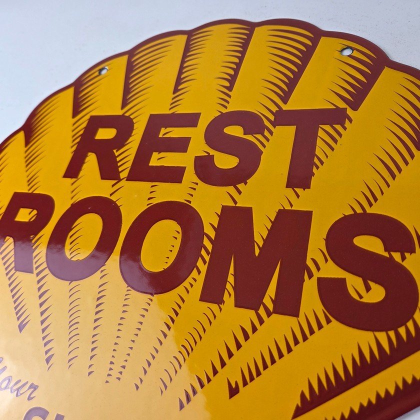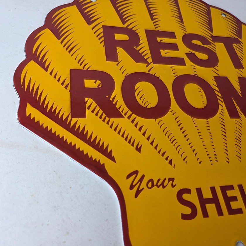 This vintage Shell porcelain sign is an excellent addition for a gas and oil collector and has the neat graphic of the Shell Rest Rooms lettering. The sign features the Clam Shell shape and the iconic colors of Shell Gasoline. Measuring at 11 3/4″ by 11 3/4″, this sign is a great addition to any vintage memorabilia collection. The sign is perfect for display in any garage, sign collection, shop or man cave and is sure to be a great center piece.