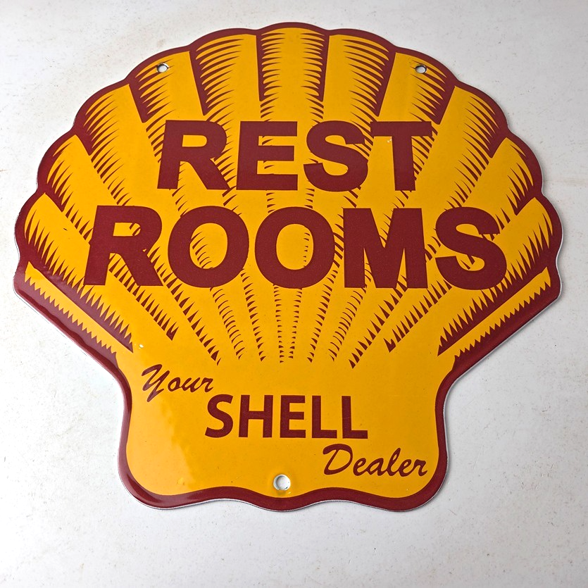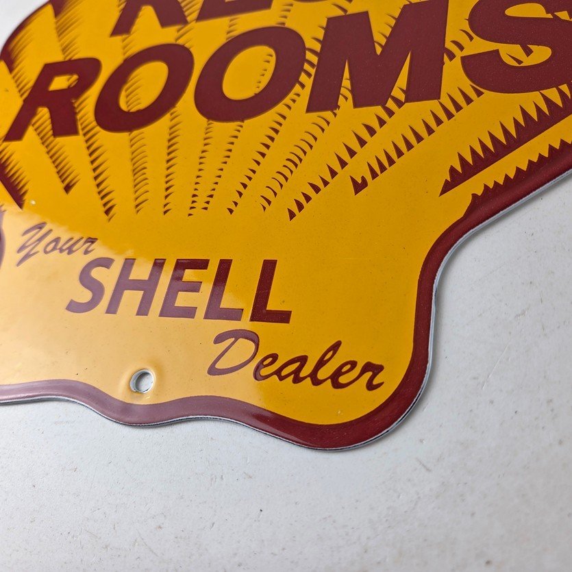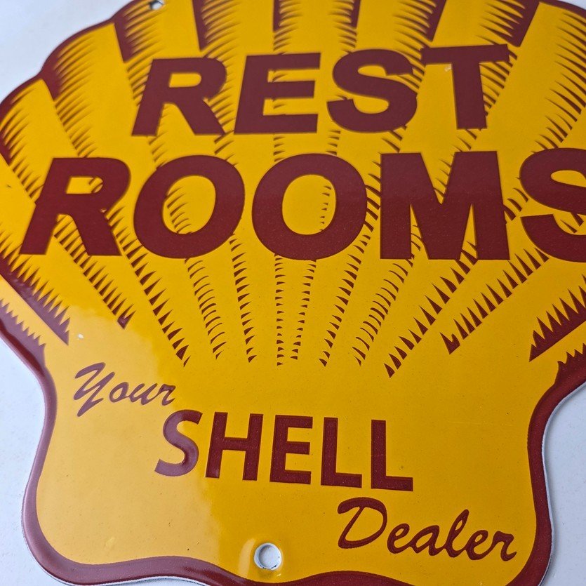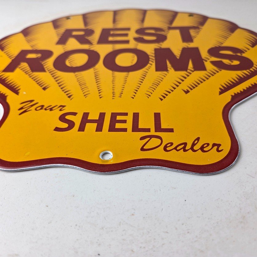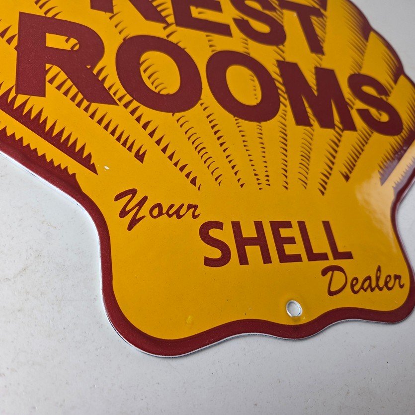 This vintage Shell porcelain sign is an excellent addition for a gas and oil collector and has the neat graphic of the Shell Rest Rooms lettering. The sign features the Clam Shell shape and the iconic colors of Shell Gasoline. Measuring at 11 3/4″ by 11 3/4″, this sign is a great addition to any vintage memorabilia collection. The sign is perfect for display in any garage, sign collection, shop or man cave and is sure to be a great center piece.