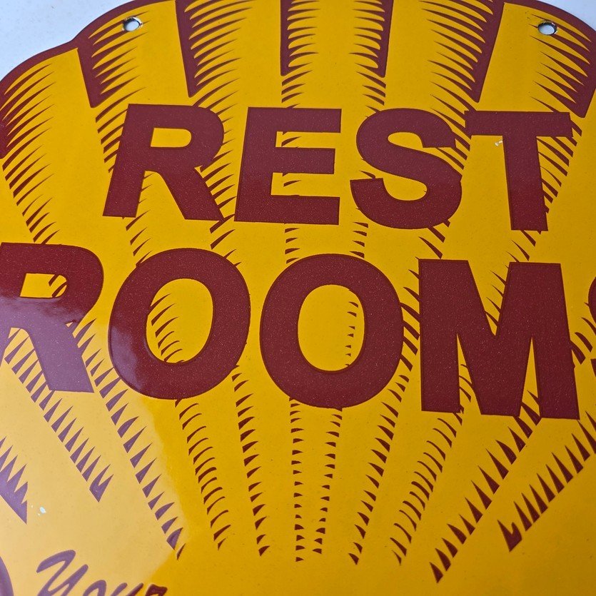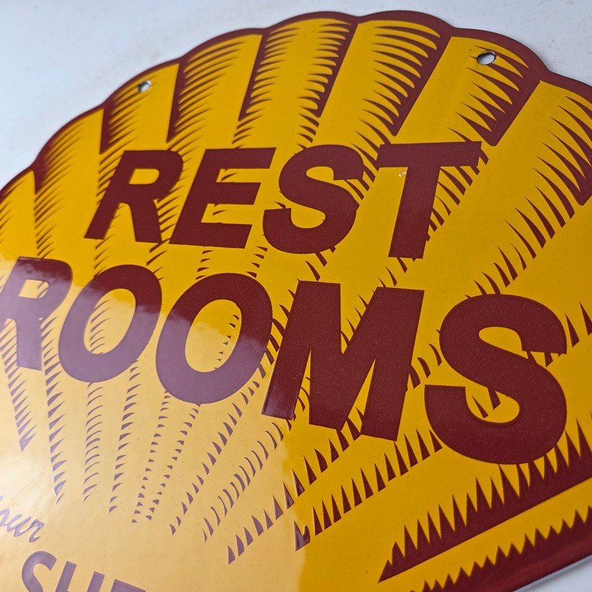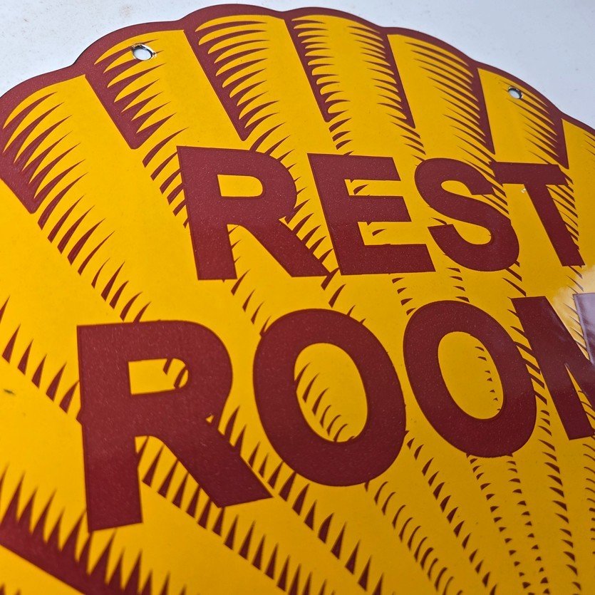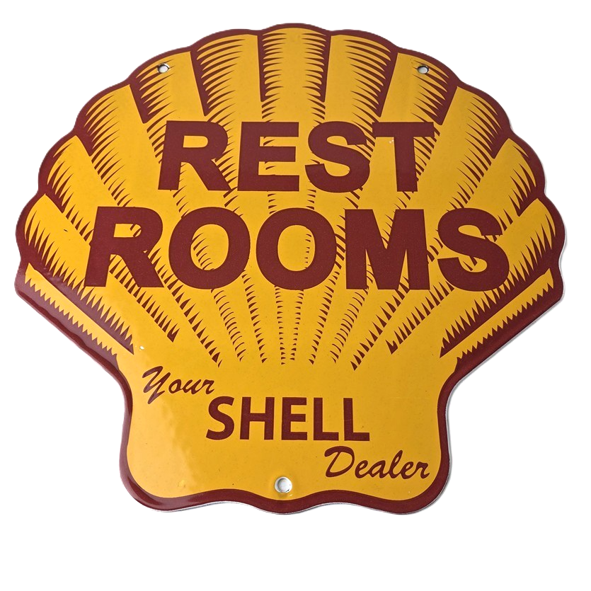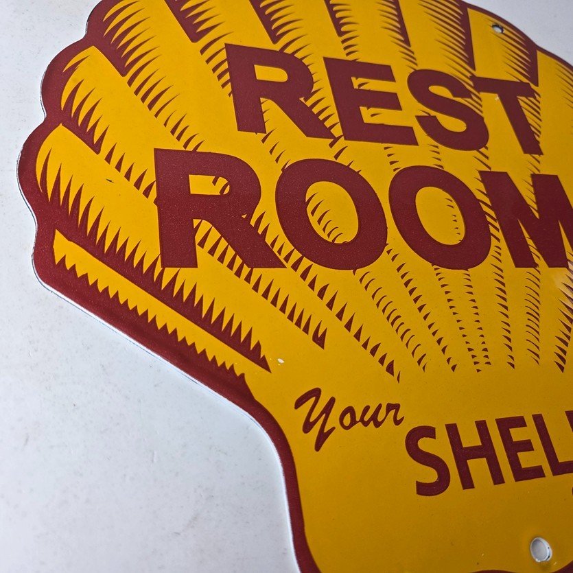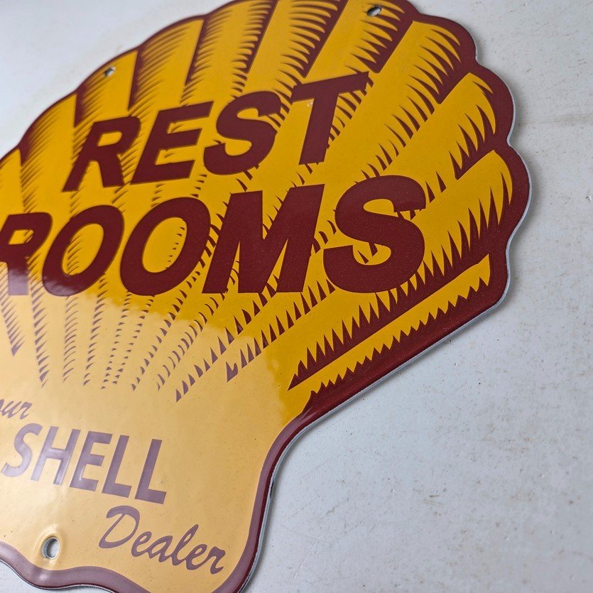 This vintage Shell porcelain sign is an excellent addition for a gas and oil collector and has the neat graphic of the Shell Rest Rooms lettering. The sign features the Clam Shell shape and the iconic colors of Shell Gasoline. Measuring at 11 3/4″ by 11 3/4″, this sign is a great addition to any vintage memorabilia collection. The sign is perfect for display in any garage, sign collection, shop or man cave and is sure to be a great center piece.