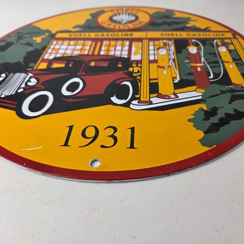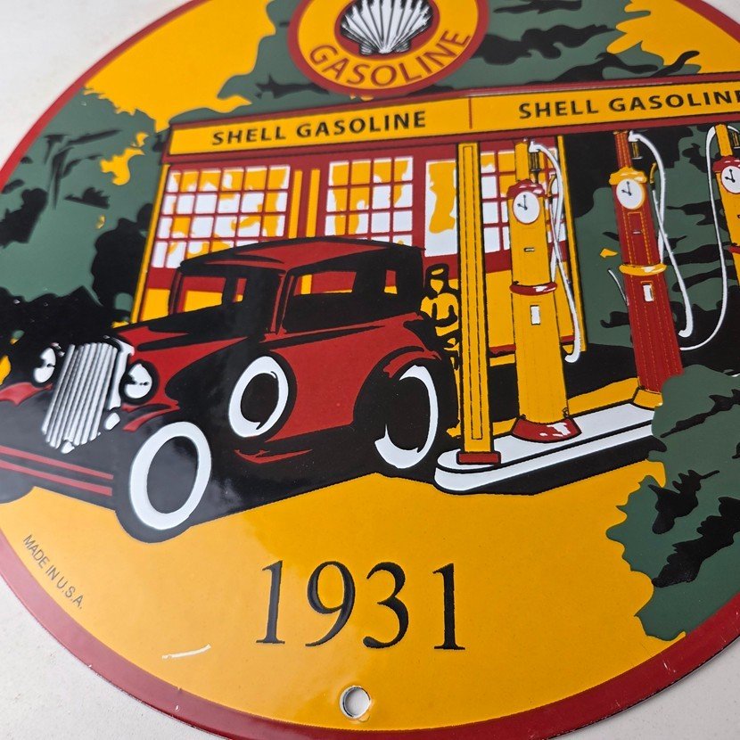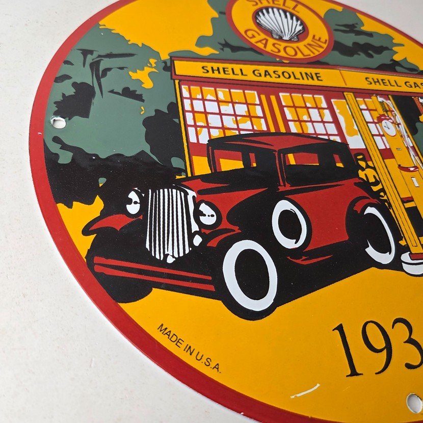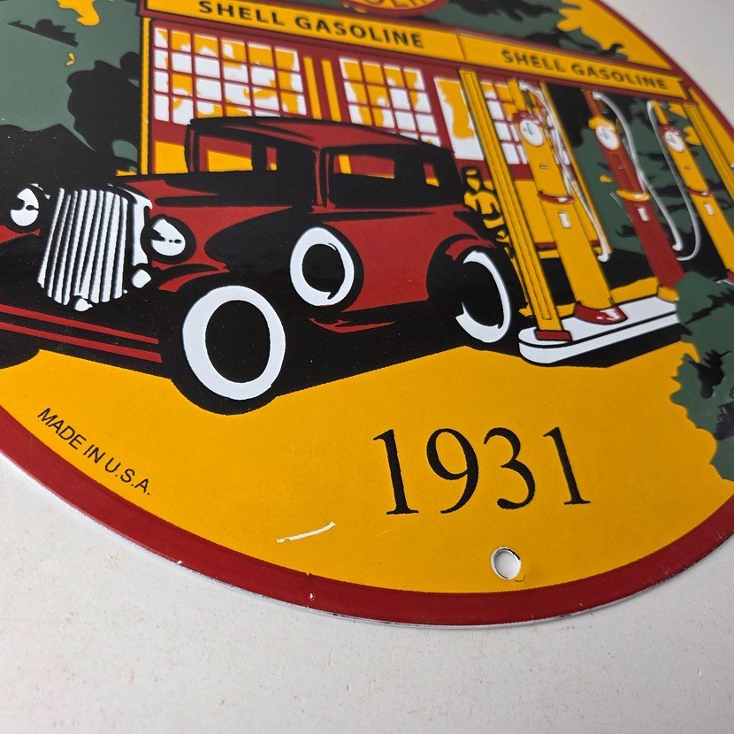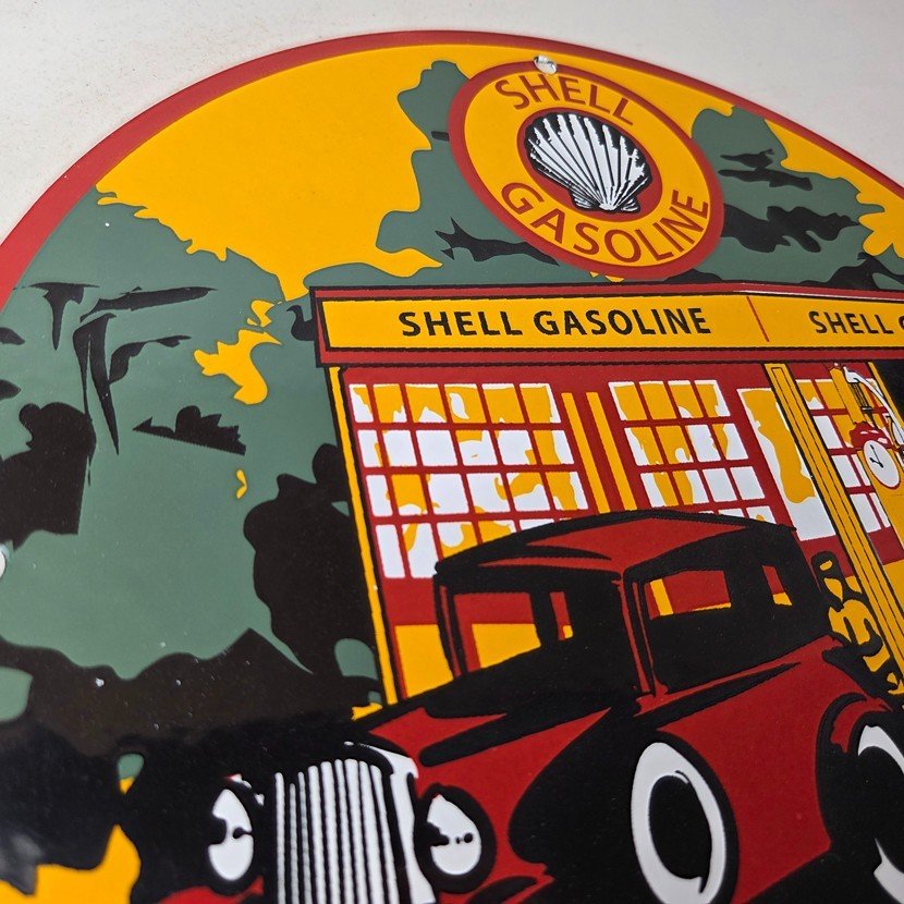 This vintage Shell Gasoline porcelain sign features the iconic Shell Gasoline branding and is made of porcelain. The sign measures 11 3/4″ across and features Shell blend and is designed for use on a Shell car pump.