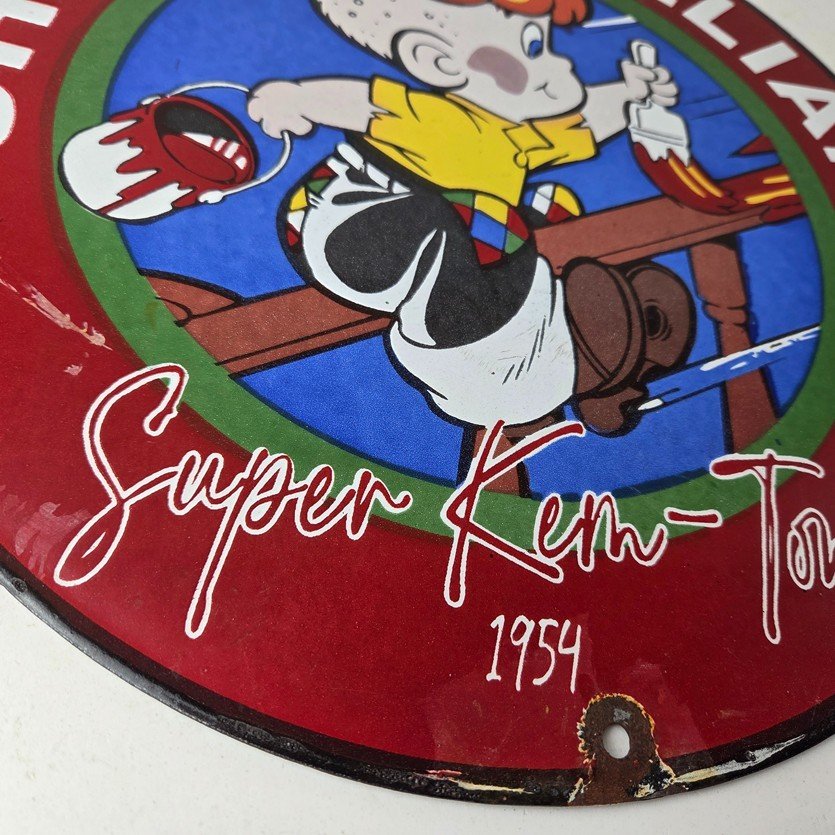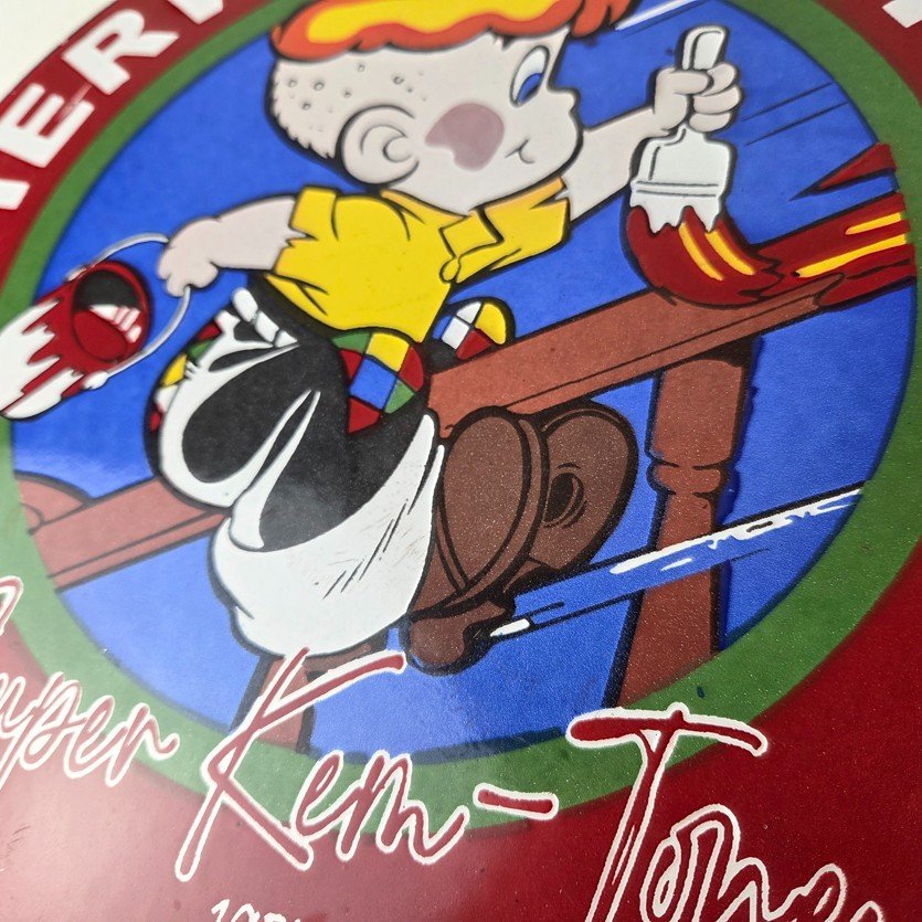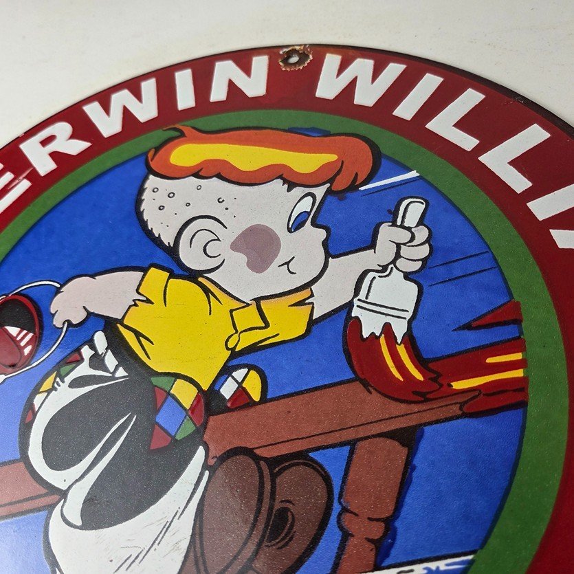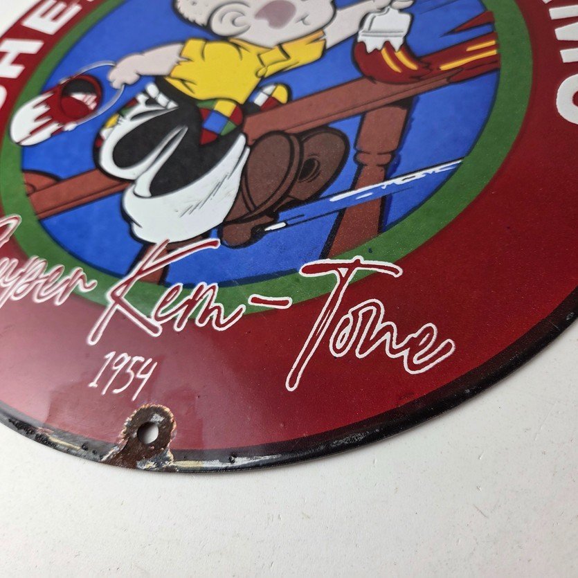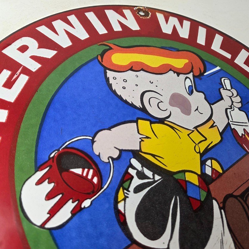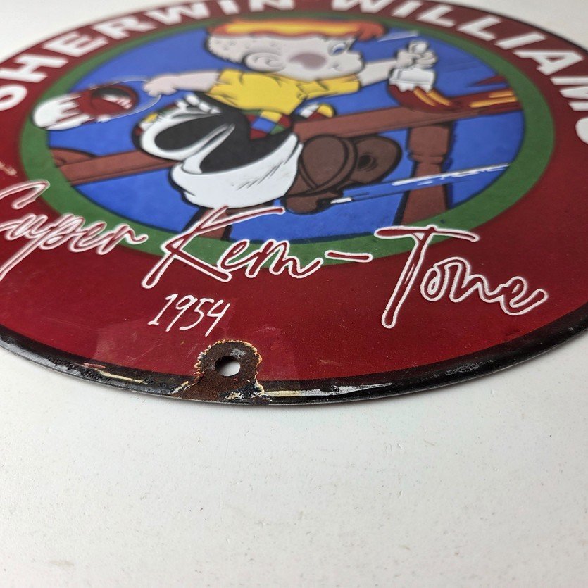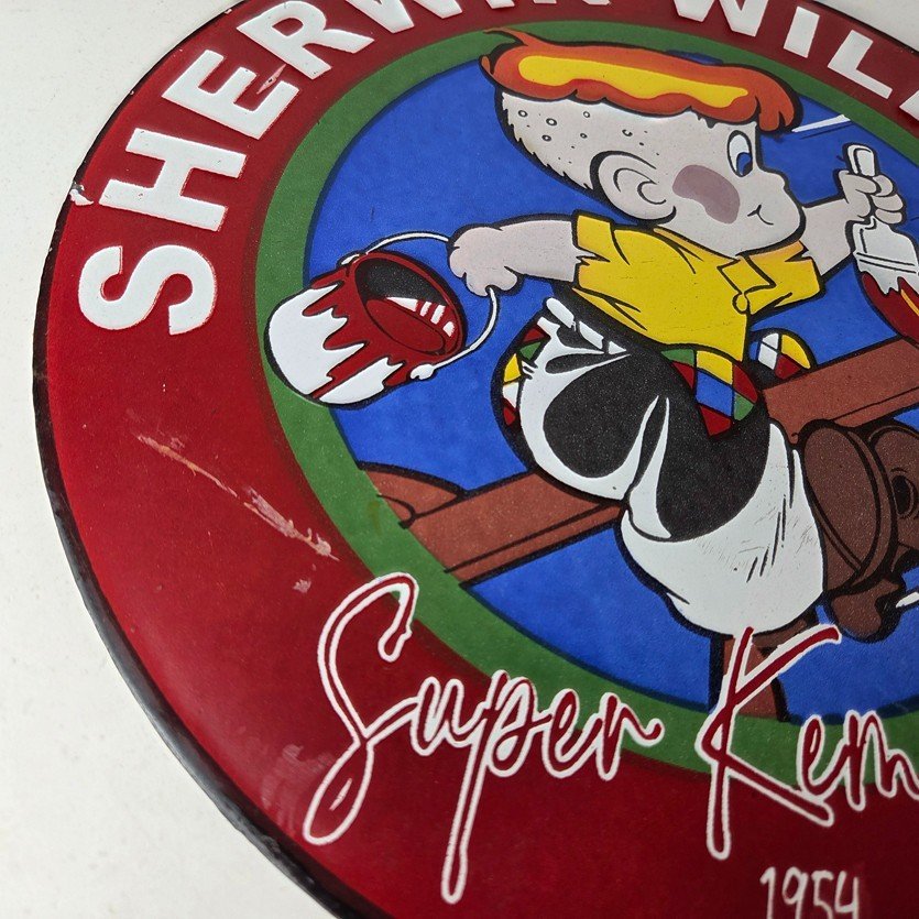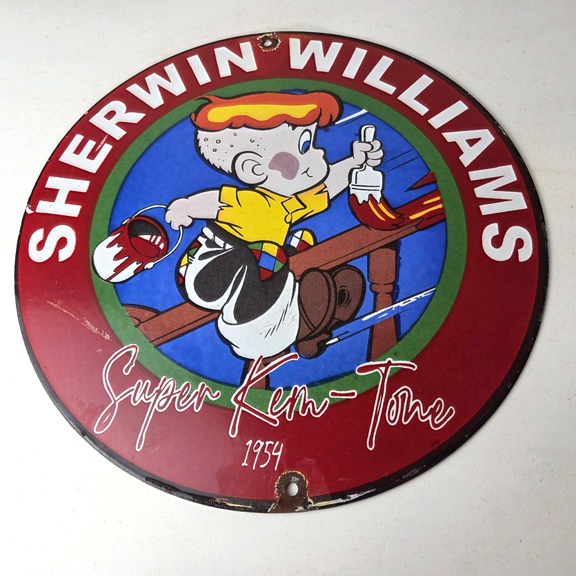 This vintage Sherwin Williams porcelain sign features the iconic Sherwin Williams brand, this porcelain sign showcases the comic book character with a paint brush. The red colors make the sign pop, perfect for adding to a gas and oil or advertising collection.