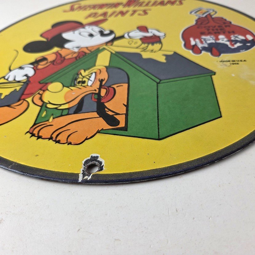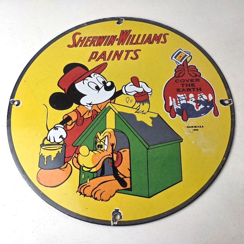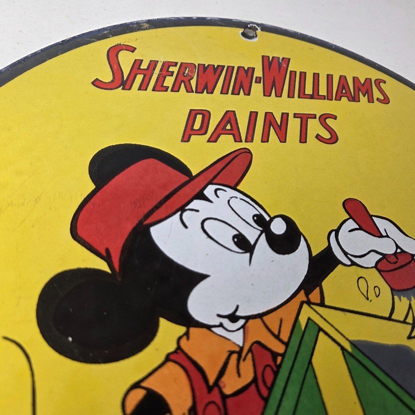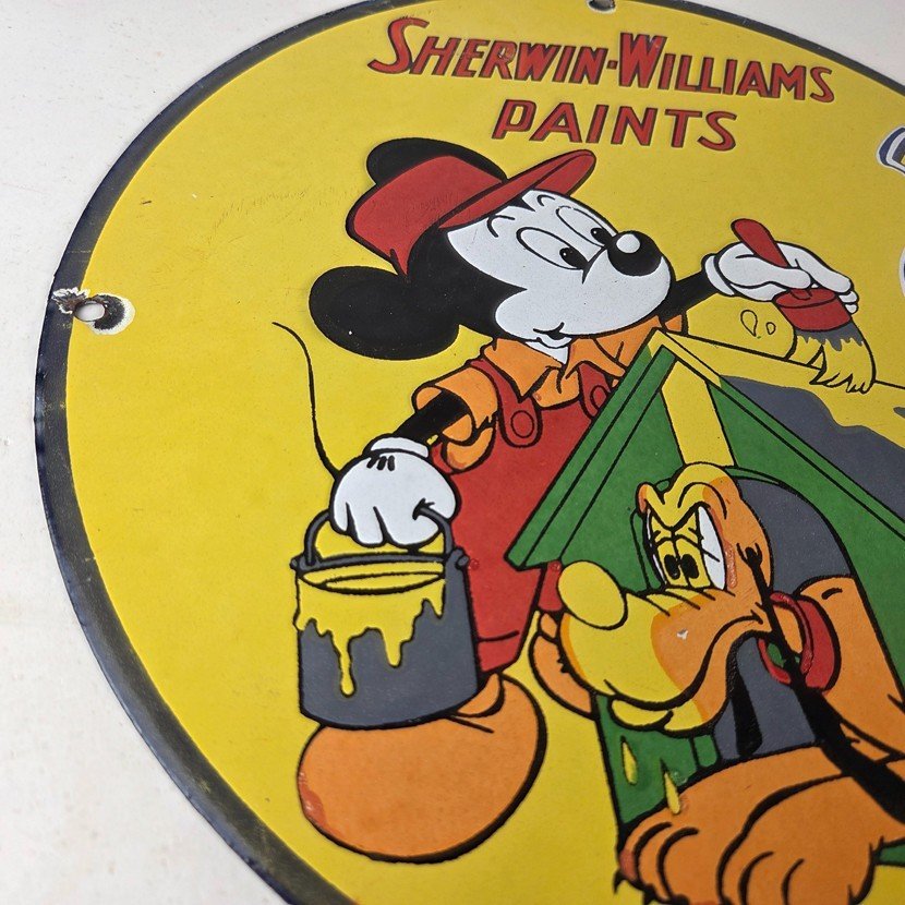 This vintage Sherwin Williams porcelain sign features the iconic Sherwin Williams brand, this porcelain sign showcases Mickey Mouse with a paint brush painting the dog shed. The yellow and red colors make the sign pop, perfect for adding to a gas and oil or advertising collection.