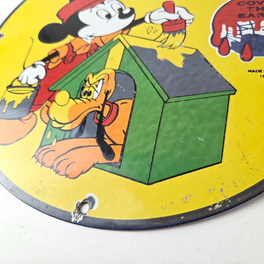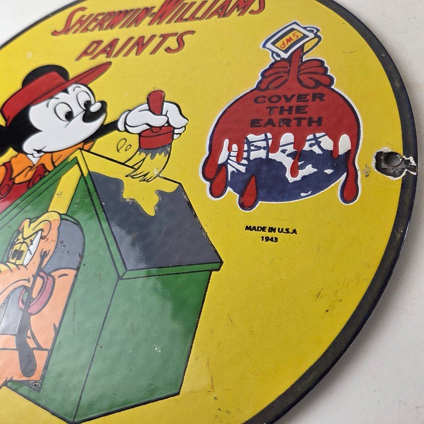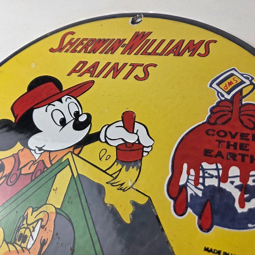 This vintage Sherwin Williams porcelain sign features the iconic Sherwin Williams brand, this porcelain sign showcases Mickey Mouse with a paint brush painting the dog shed. The yellow and red colors make the sign pop, perfect for adding to a gas and oil or advertising collection.