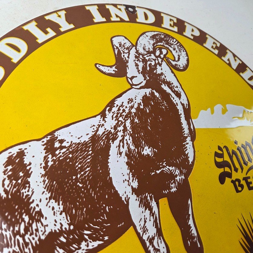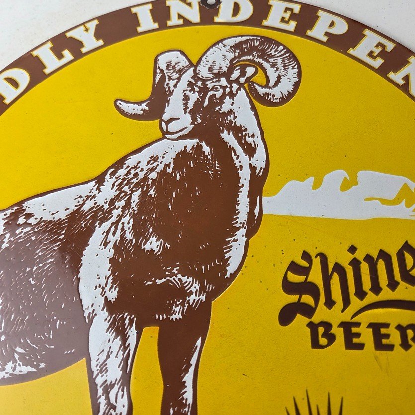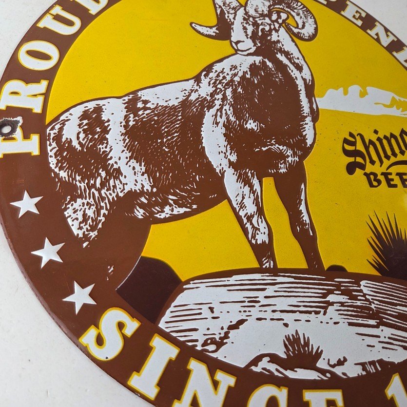 This vintage Shiner Beer porcelain sign features the iconic ram graphic. Add a vintage touch to your gas station or soda beverage collection with this alcohol beer sign. Measuring 12 inches, this sign has excellent colors and porcelain.