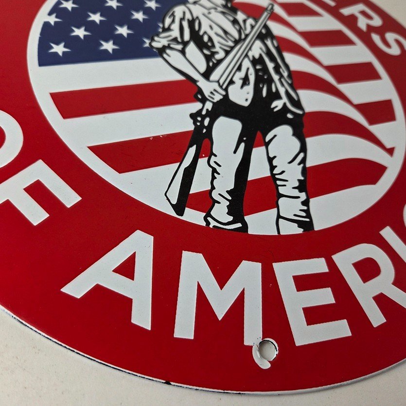This vintage porcelain sign is a great addition to any gas and oil or advertising memorabilia collection. Measuring 11 3/4″, this sign features the iconic American flag graphic with the soldier in the center. The Red, White & Blue color scheme adds a pop of color and has excellent porcelain & gloss.