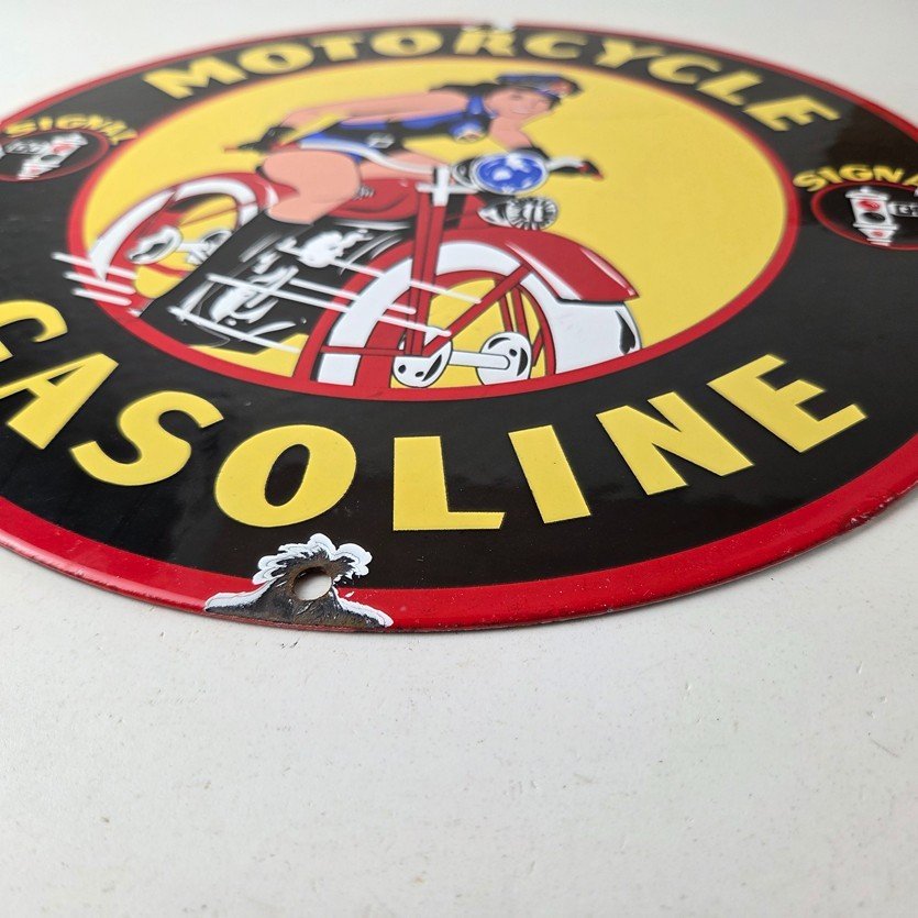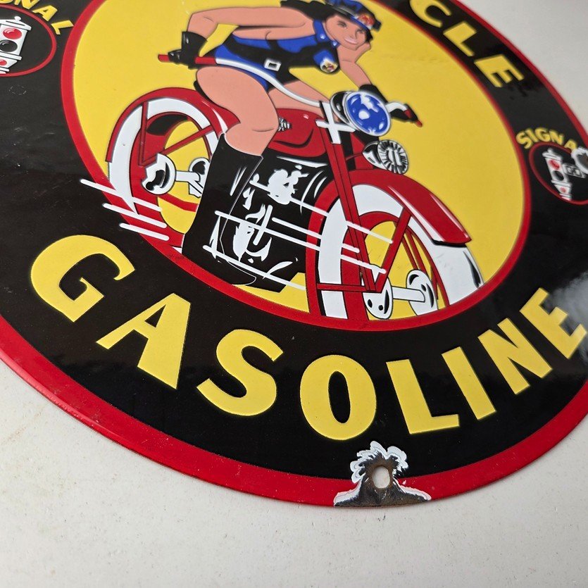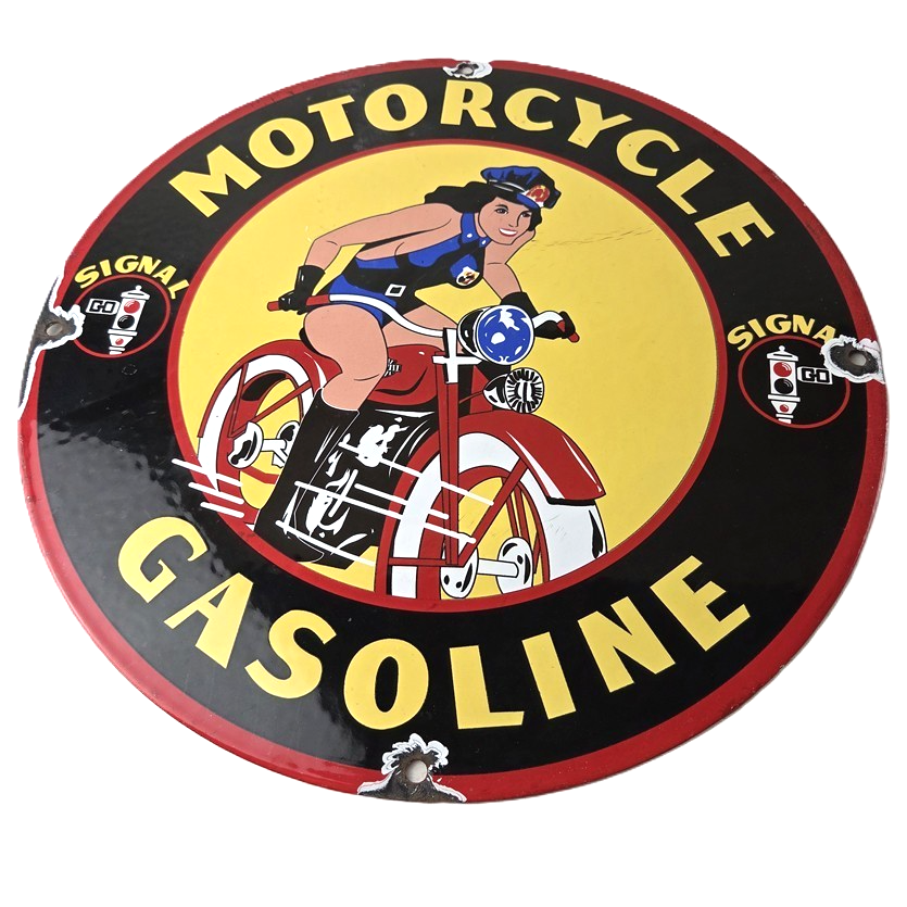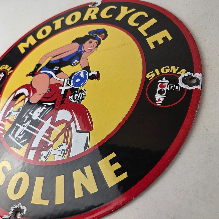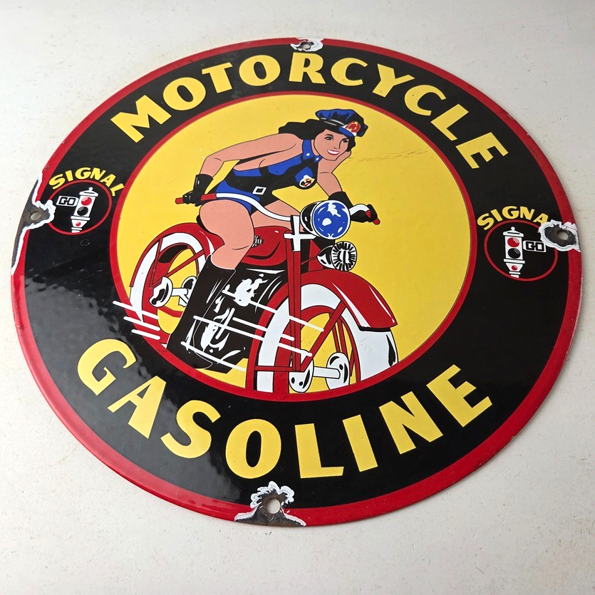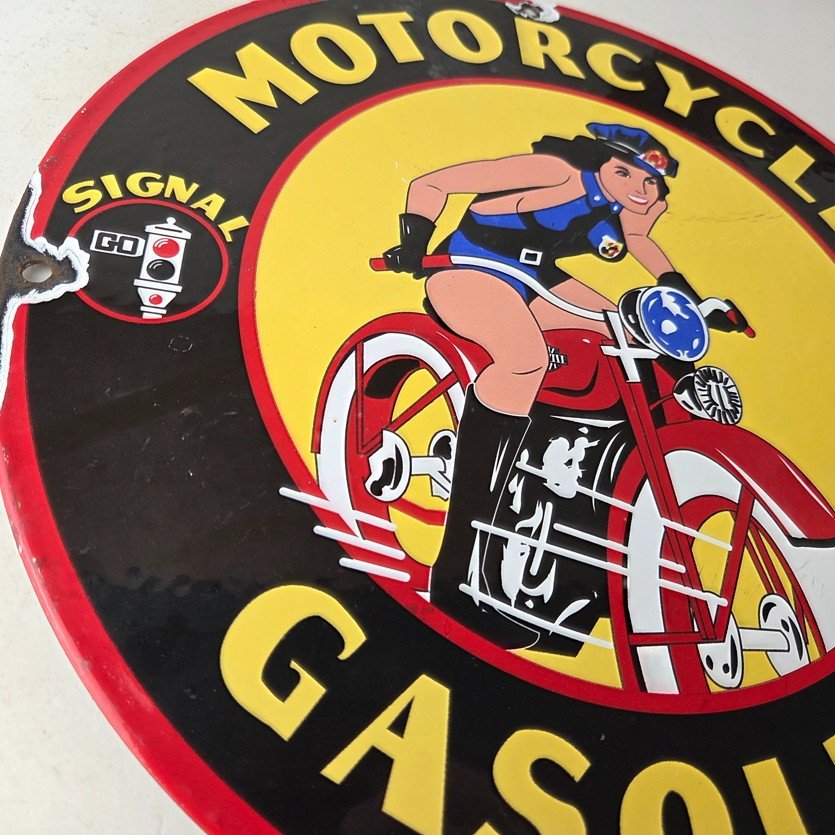 This vintage Signal Gasoline porcelain sign features the iconic Motorcycles police pinup girl, making it a must-have for any motorcycle enthusiast. The sign is made of porcelain and has the pinup girl biker on a motorcycle.