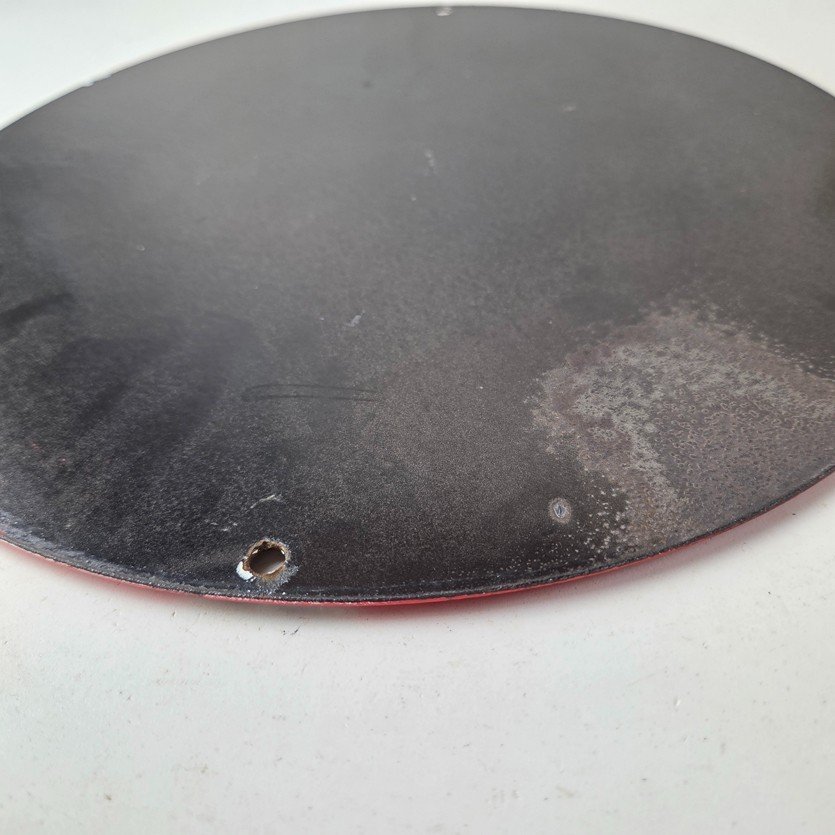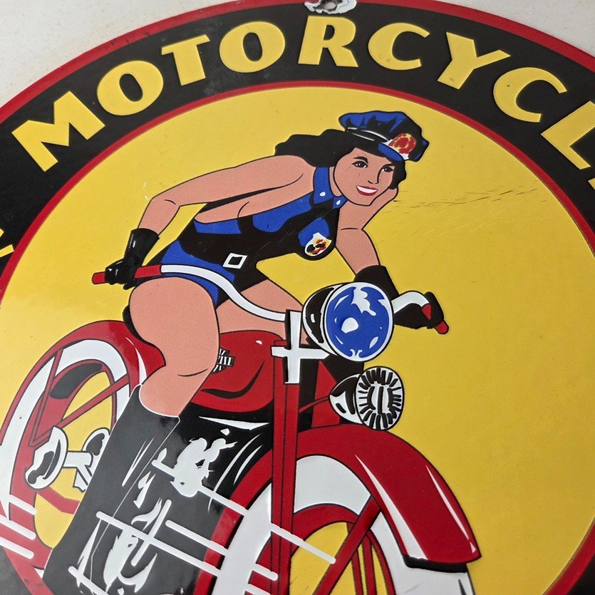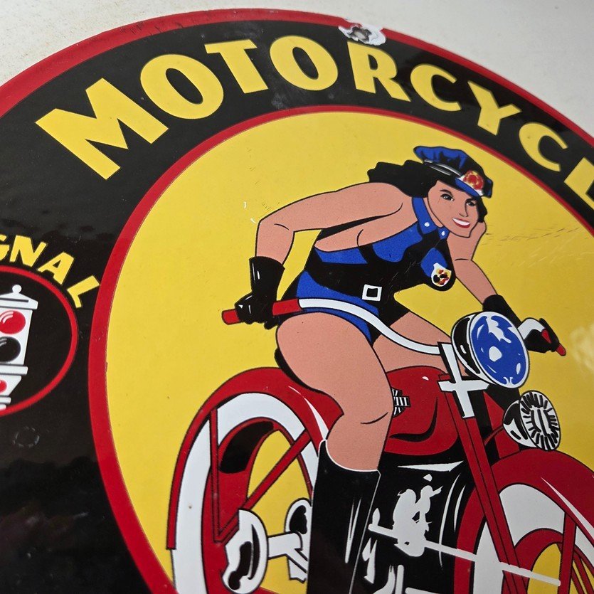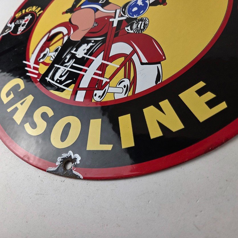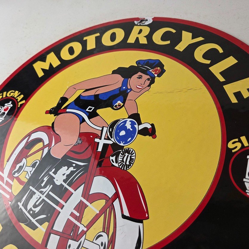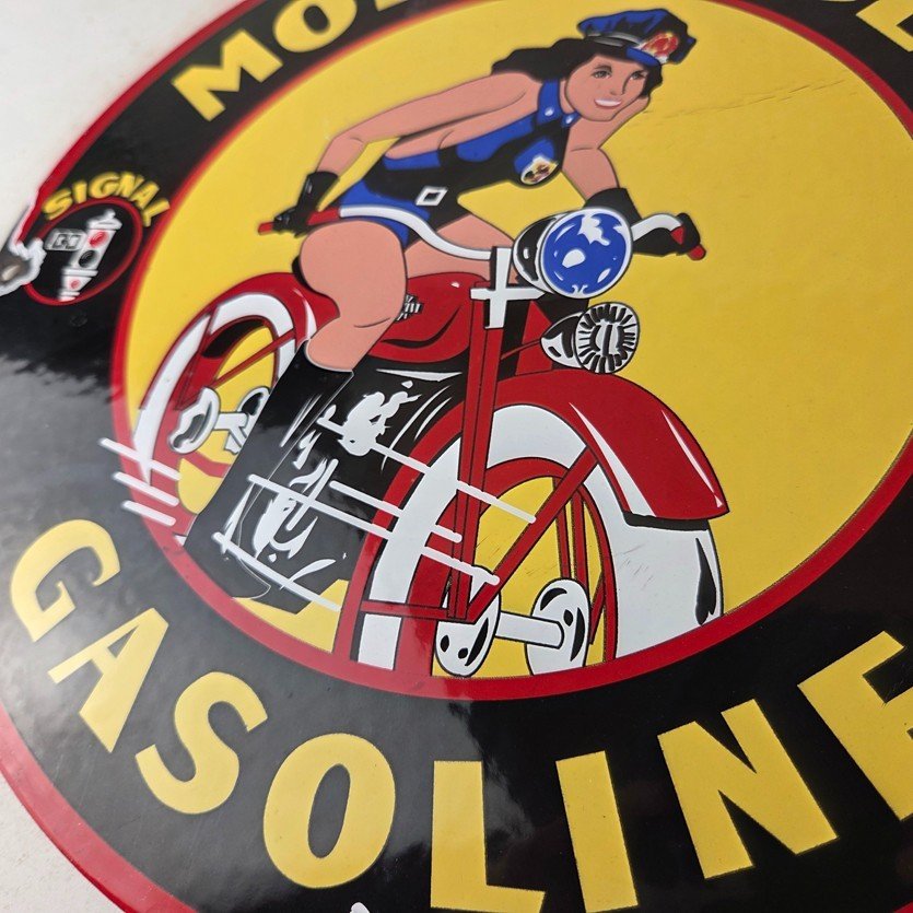 This vintage Signal Gasoline porcelain sign features the iconic Motorcycles police pinup girl, making it a must-have for any motorcycle enthusiast. The sign is made of porcelain and has the pinup girl biker on a motorcycle.