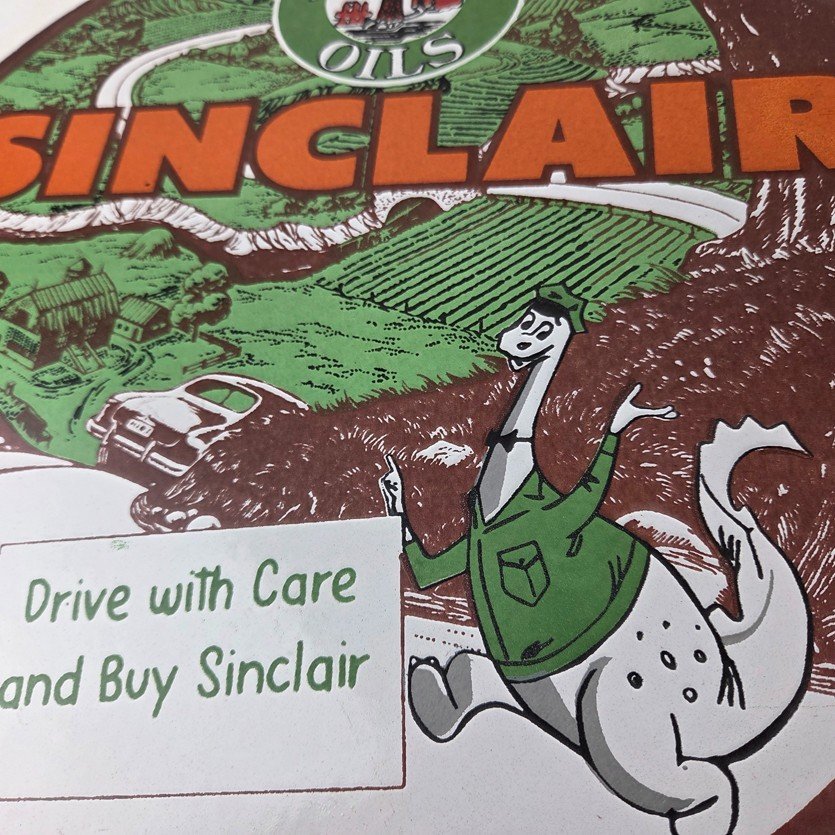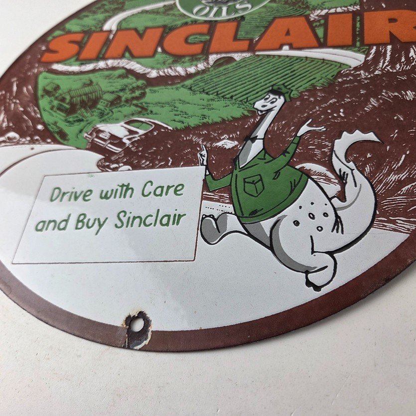 This vintage Sinclair Gasoline sign is a must-have for any gas and oil advertising collector. With its bold green Sinclair colors and iconic Sinclair Oils logo at the top, it’s sure to a make display to your collection. This pump plate sign features the Sinclair Gasoline brand name with Dino the dinosaur. Perfect for adding a touch of nostalgia to your gasoline collection, retro man cave, garage, gas pump or shop.