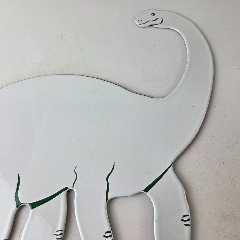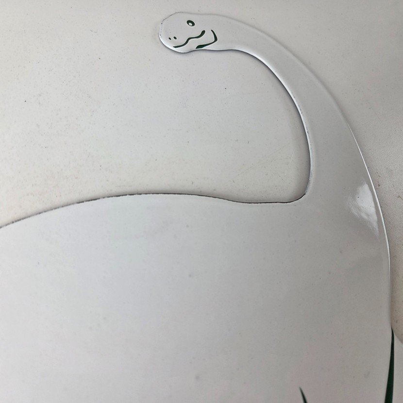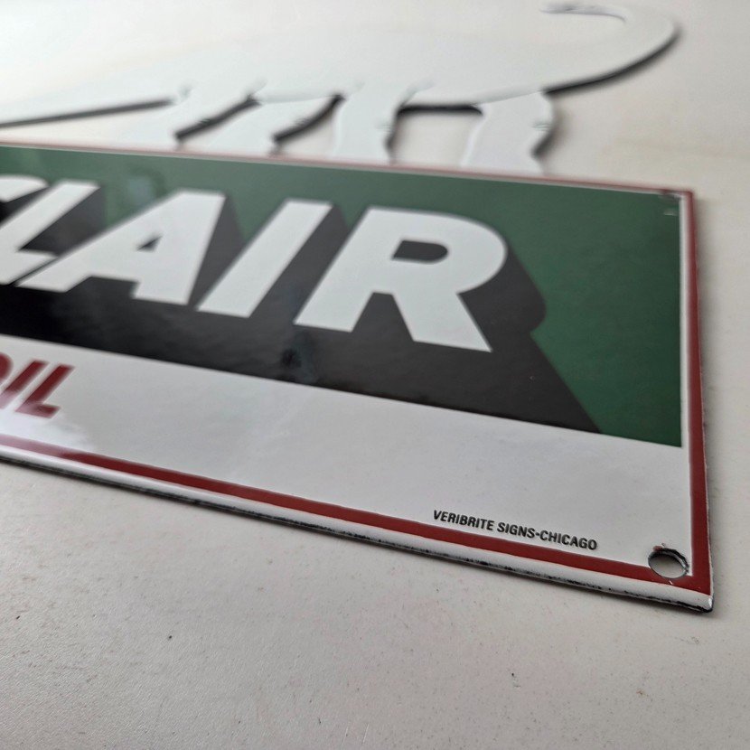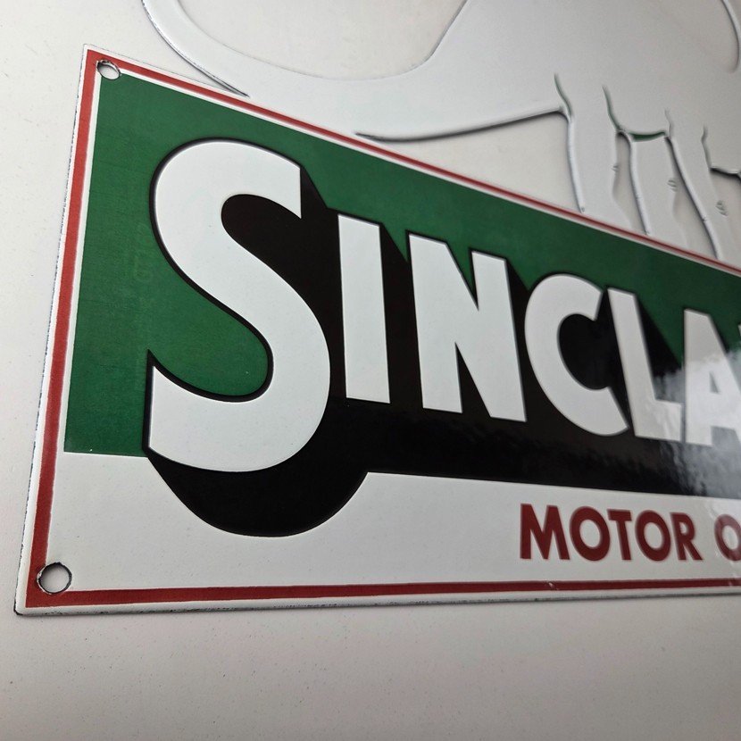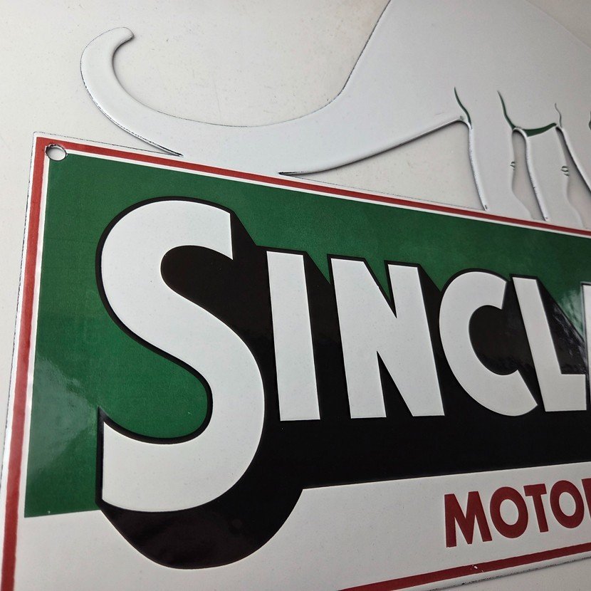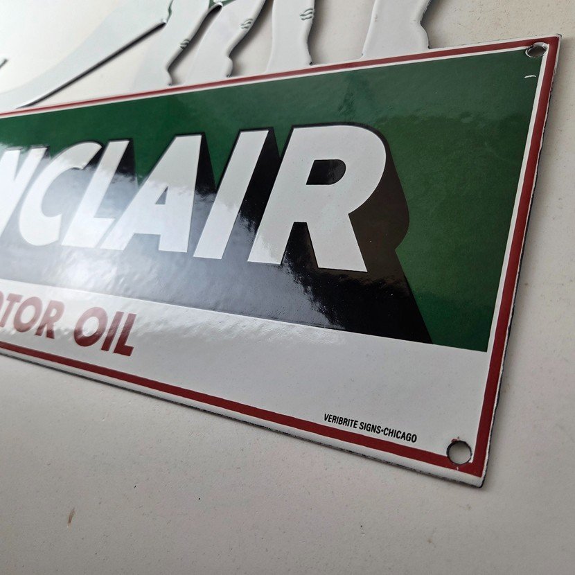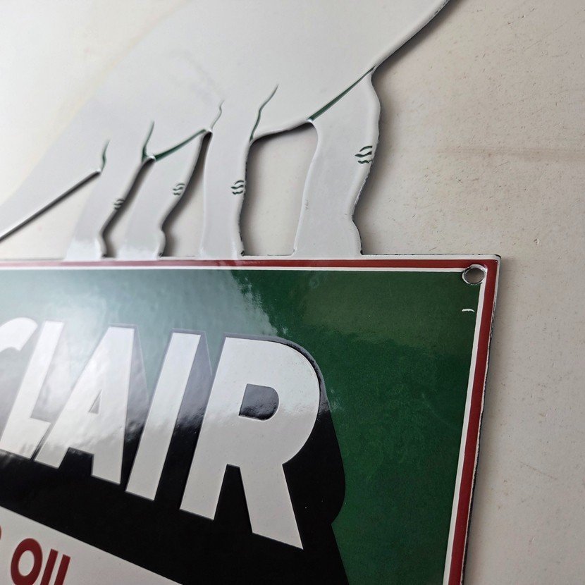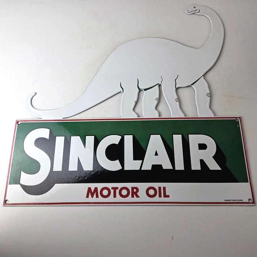 This vintage Sinclair Gasoline sign is a must-have for any gas and oil advertising collector. With its bold green Sinclair colors and iconic Dino shape, it’s sure to a make display to your collection. This pump plate sign features the Sinclair Gasoline brand name with Dino the dinosaur. Perfect for adding a touch of nostalgia to your gasoline collection, retro man cave, garage, gas pump or shop.