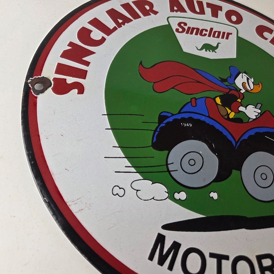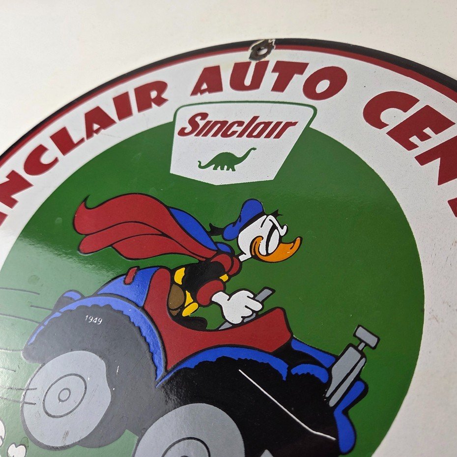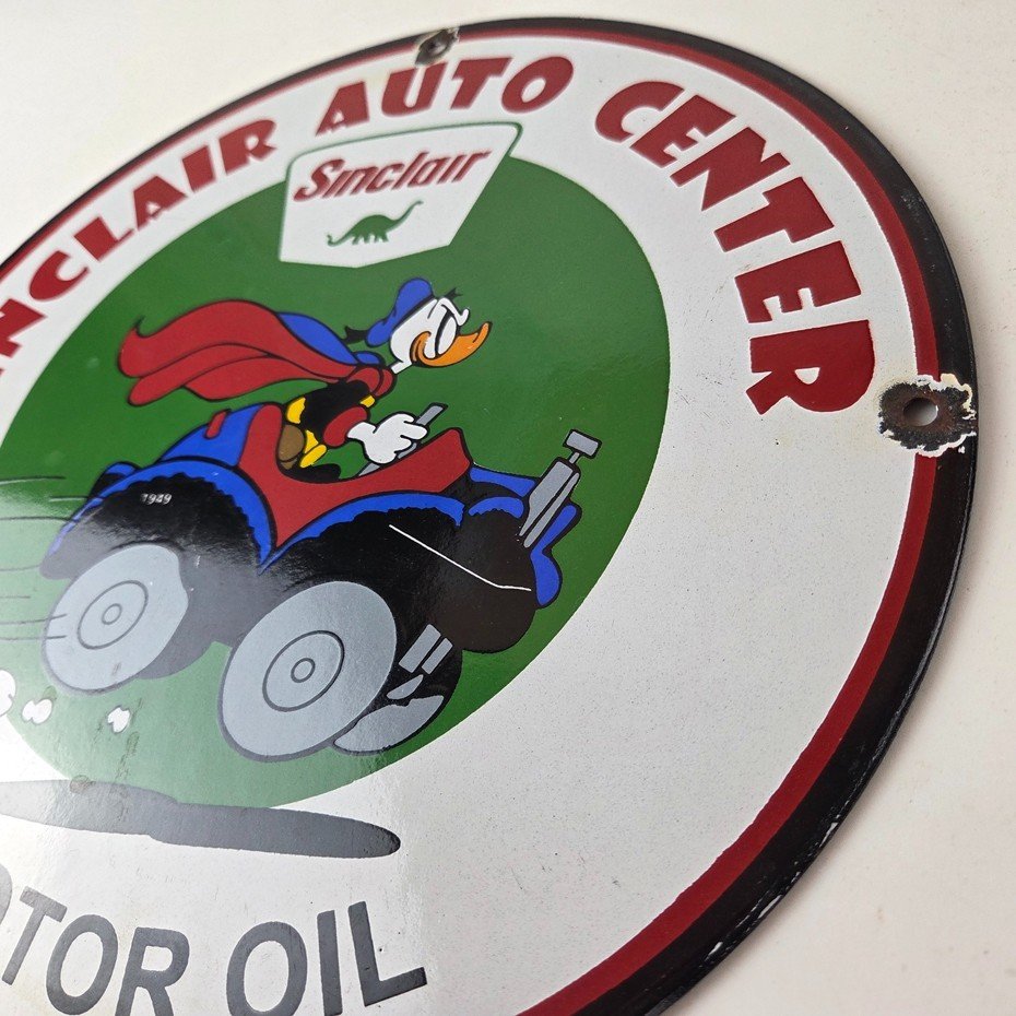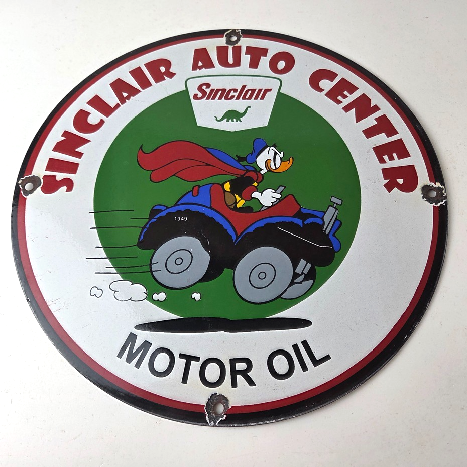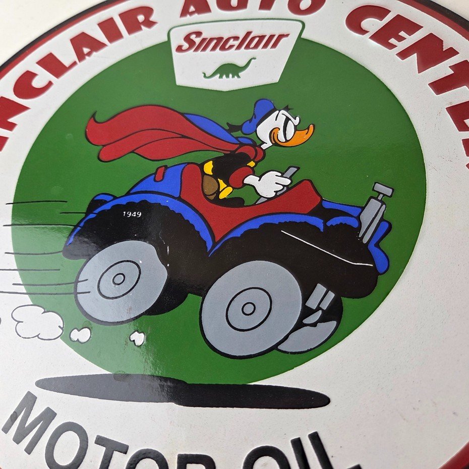 This vintage Sinclair Gasoline porcelain sign features Walt Disney Duck driving an old car. The colorful 12″ sign has vibrant colors that make it stand out, and its type of advertising will fit nicely with any collection. The brand is Sinclair Gasoline, which is the most iconic gasoline brand.