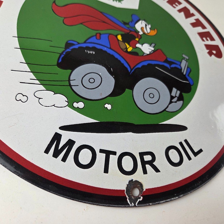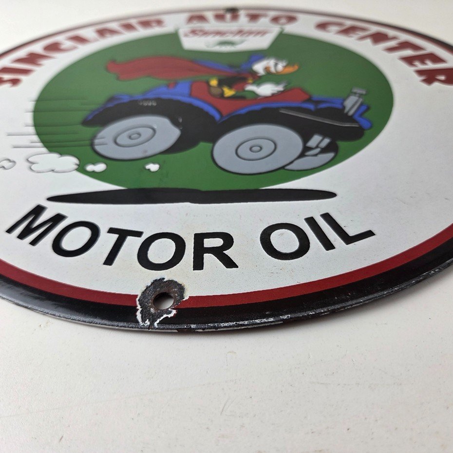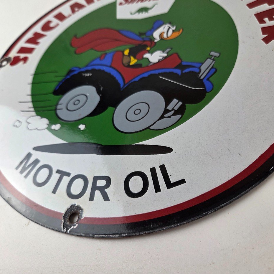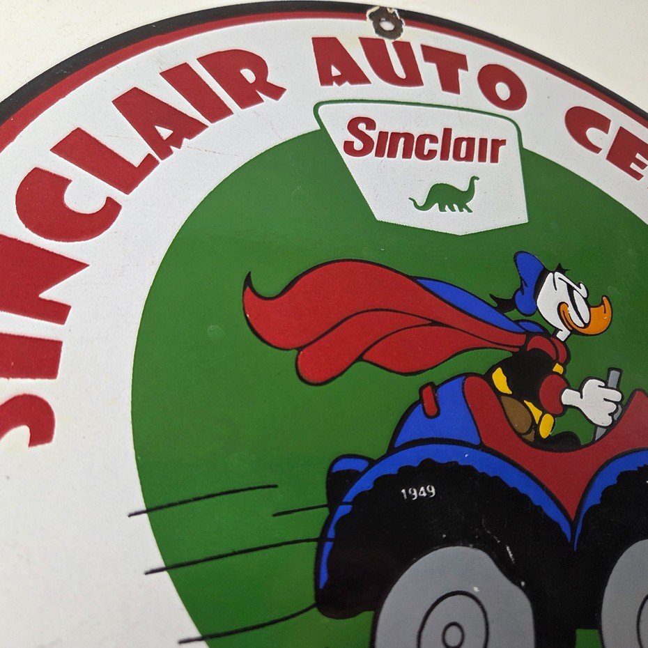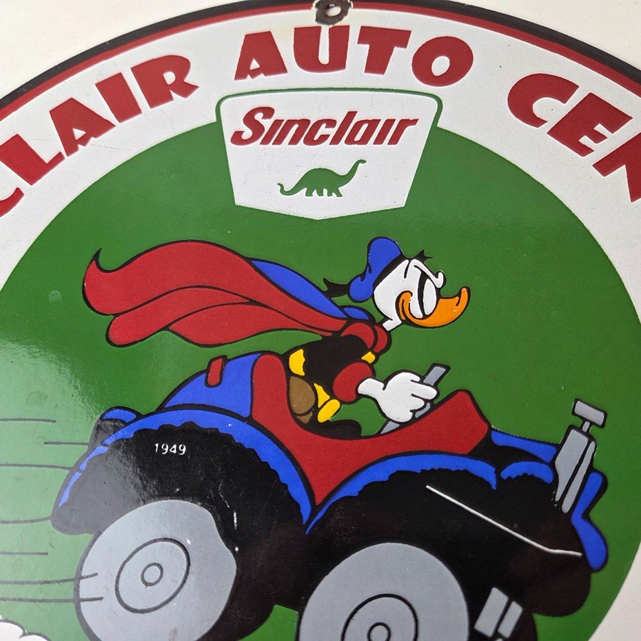 This vintage Sinclair Gasoline porcelain sign features Walt Disney Duck driving an old car. The colorful 12″ sign has vibrant colors that make it stand out, and its type of advertising will fit nicely with any collection. The brand is Sinclair Gasoline, which is the most iconic gasoline brand.