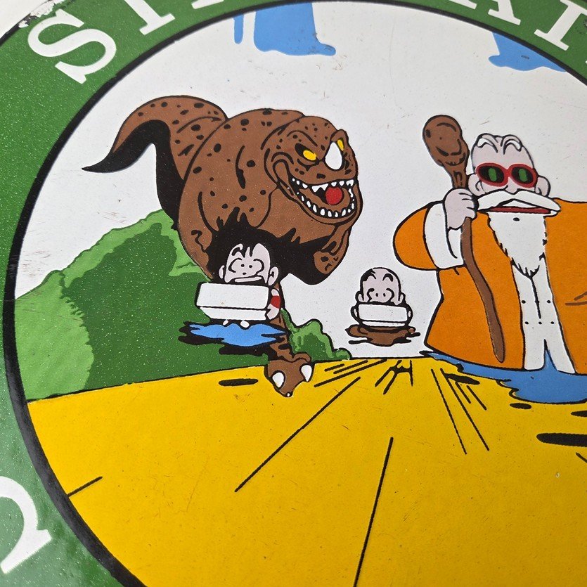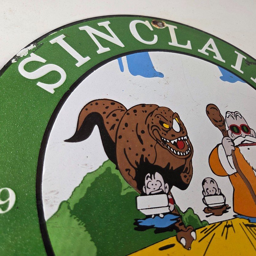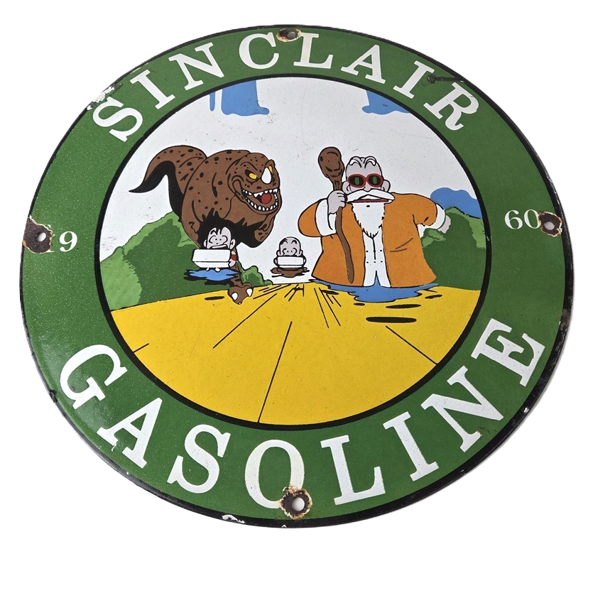 This vintage Sinclair Gasoline sign is a must-have for any gas and oil advertising collector. With its bold green Sinclair color and the old anime of Dragon Ball, it’s sure to a make display to your collection. This pump plate sign features the Sinclair Gasoline brand name with Dino the dinosaur. Perfect for adding a touch of nostalgia to your gasoline collection, retro man cave, garage, gas pump or shop.