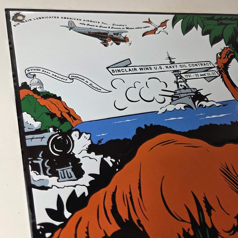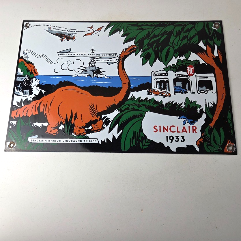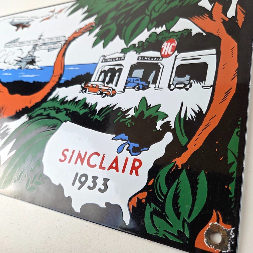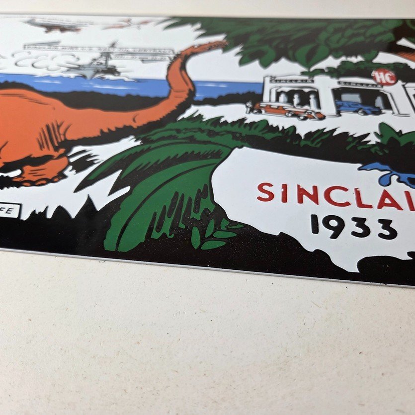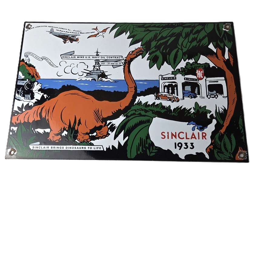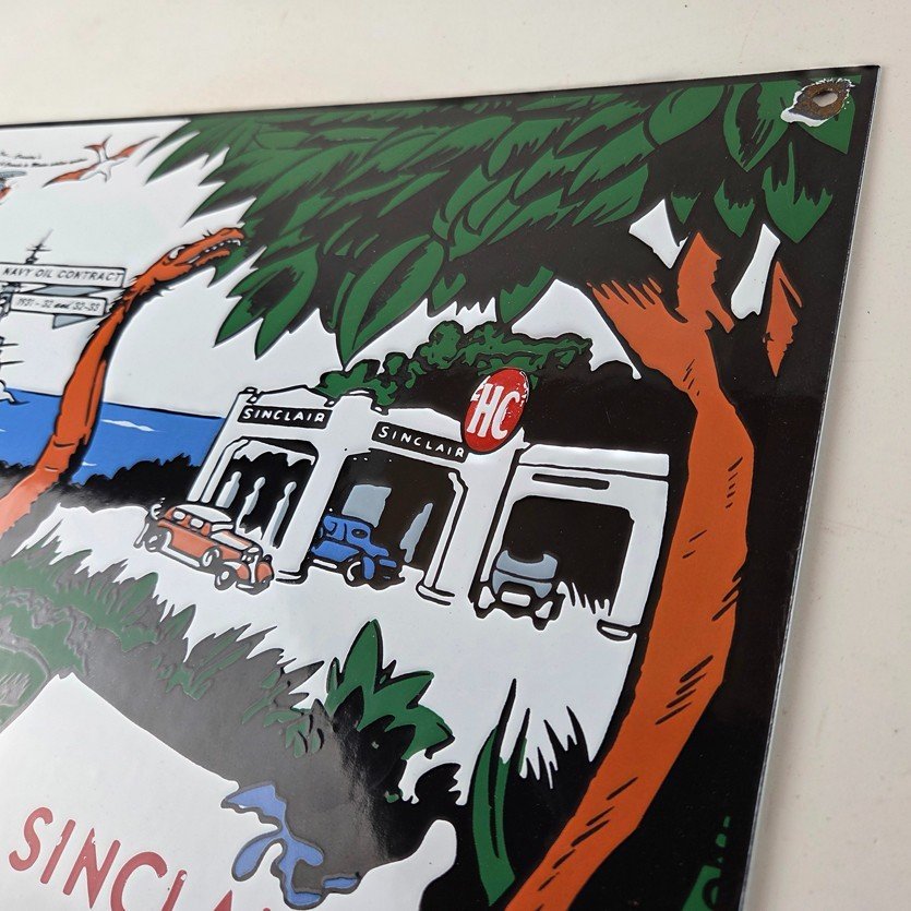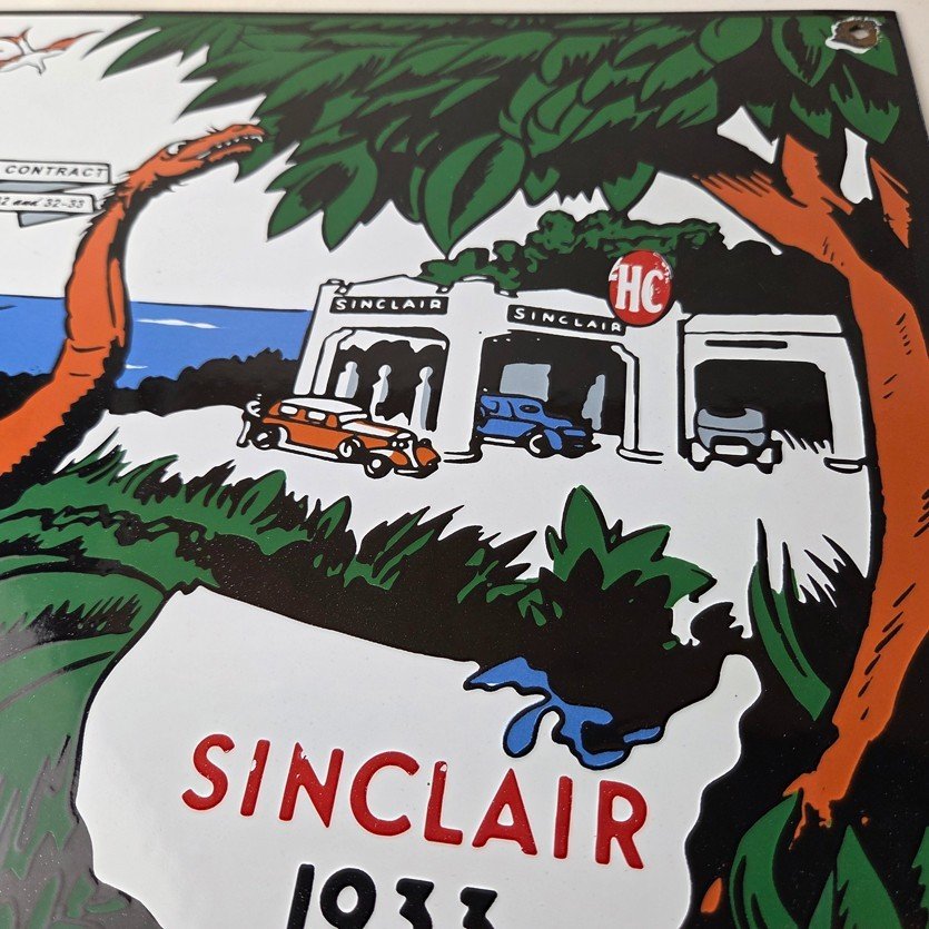 This vintage Sinclair Gasoline sign is a must-have for any gas and oil advertising collector. With its bold Sinclair colors and iconic Dinosaur with the HC Service Station, it’s sure to a make display to your collection.