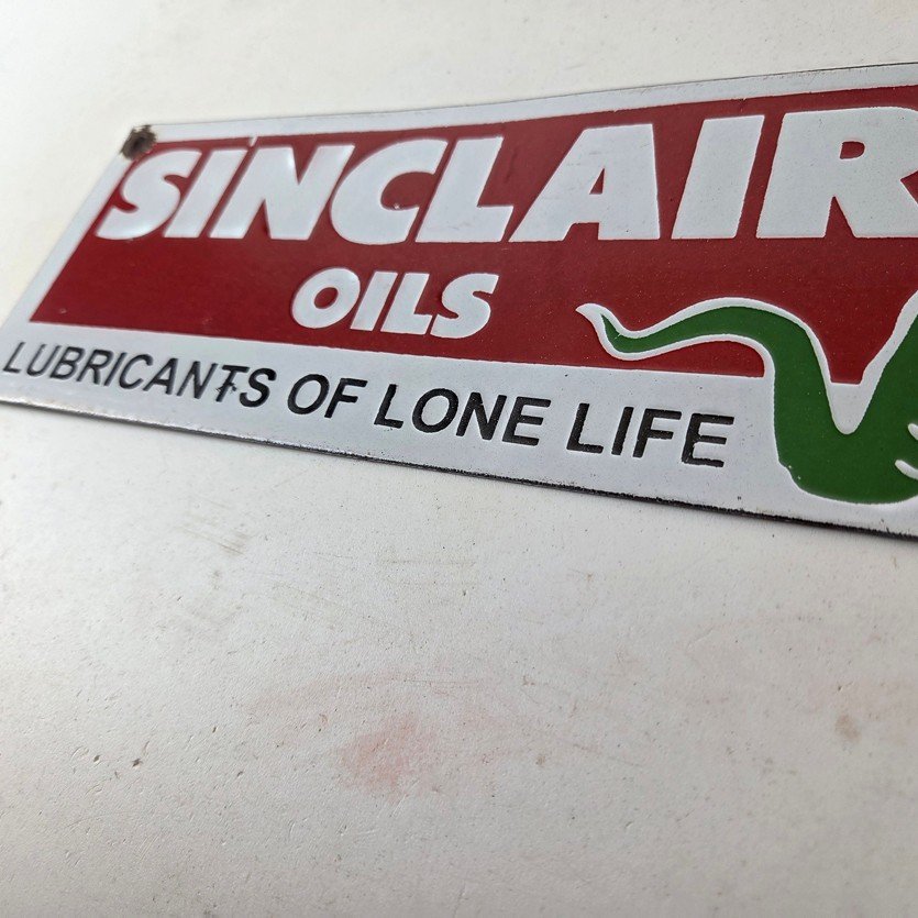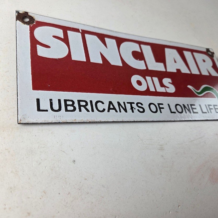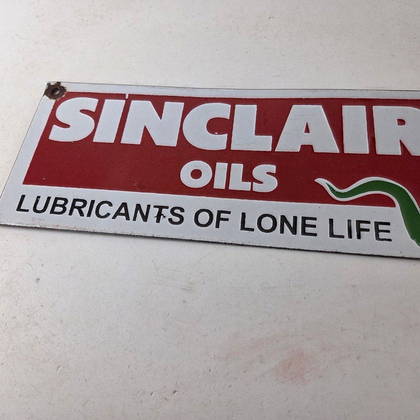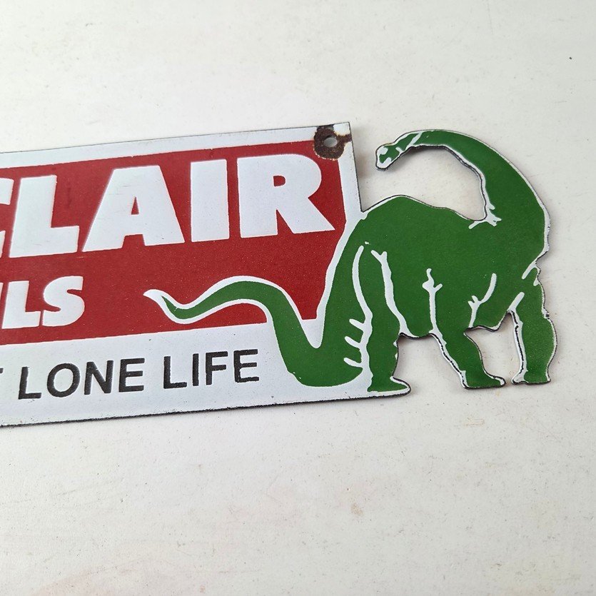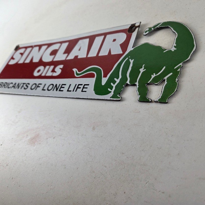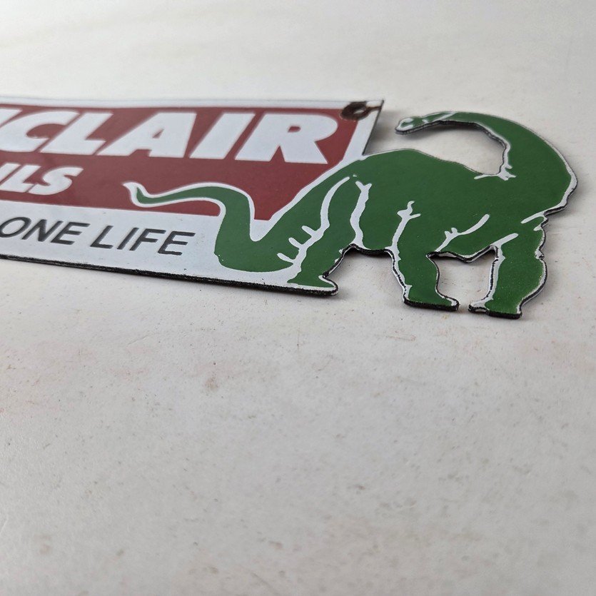 This vintage Sinclair Gasoline porcelain sign features the dinosaur on the right with large white lettering. The colorful 12″ x 4″ sign has vibrant colors that make it stand out, and its type of advertising will fit nicely with any collection. The brand is Sinclair Gasoline, which is the most iconic gasoline brand.