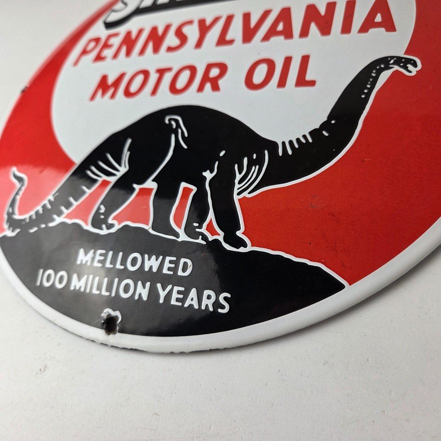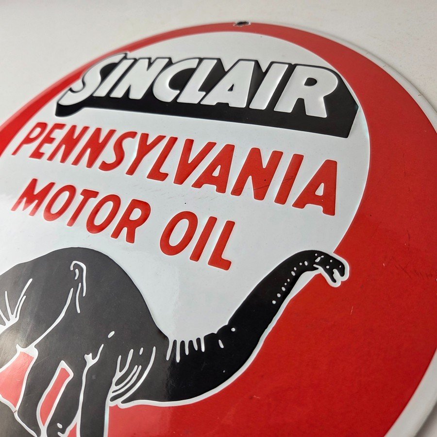 This vintage Sinclair Gasoline sign is a must-have for any gas and oil advertising collector. With its bold red color and iconic Dino logo, it’s sure to a make display to your collection. This convex / button shaped pump plate sign features the Sinclair Gasoline brand name with Dino the dinosaur. Perfect for adding a touch of nostalgia to your gasoline collection, retro man cave, garage, gas pump or shop.