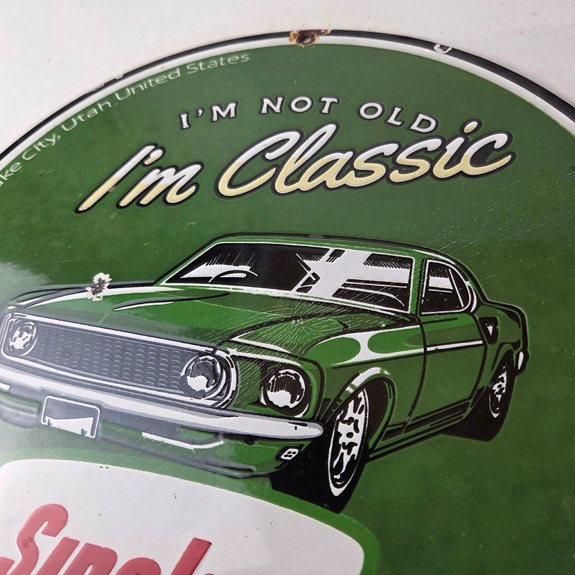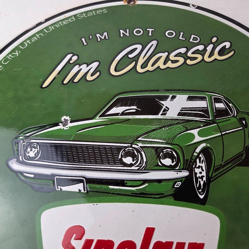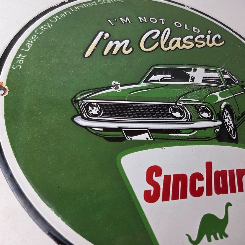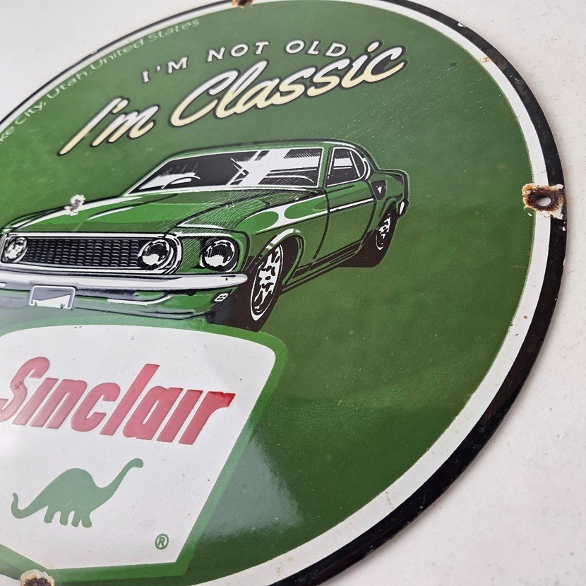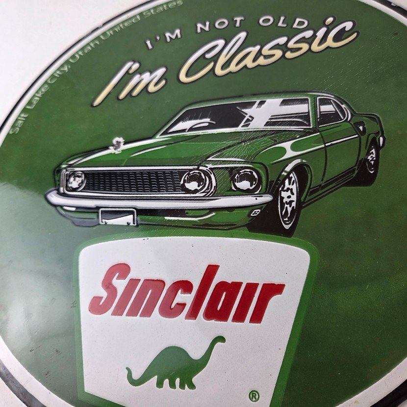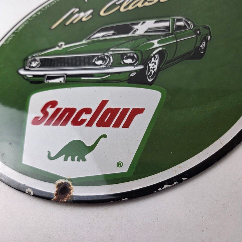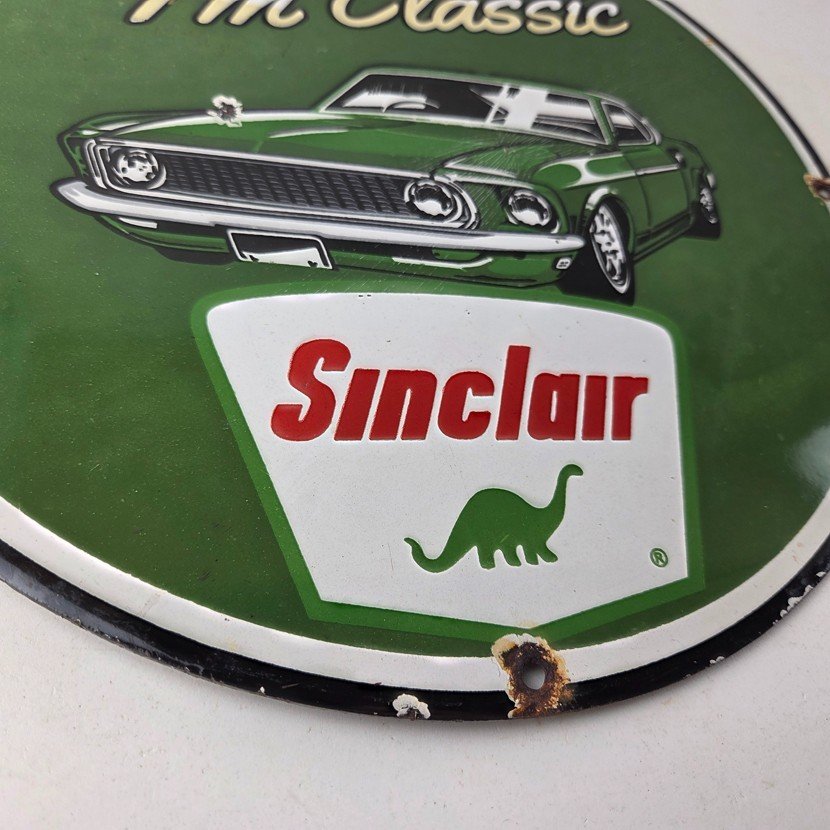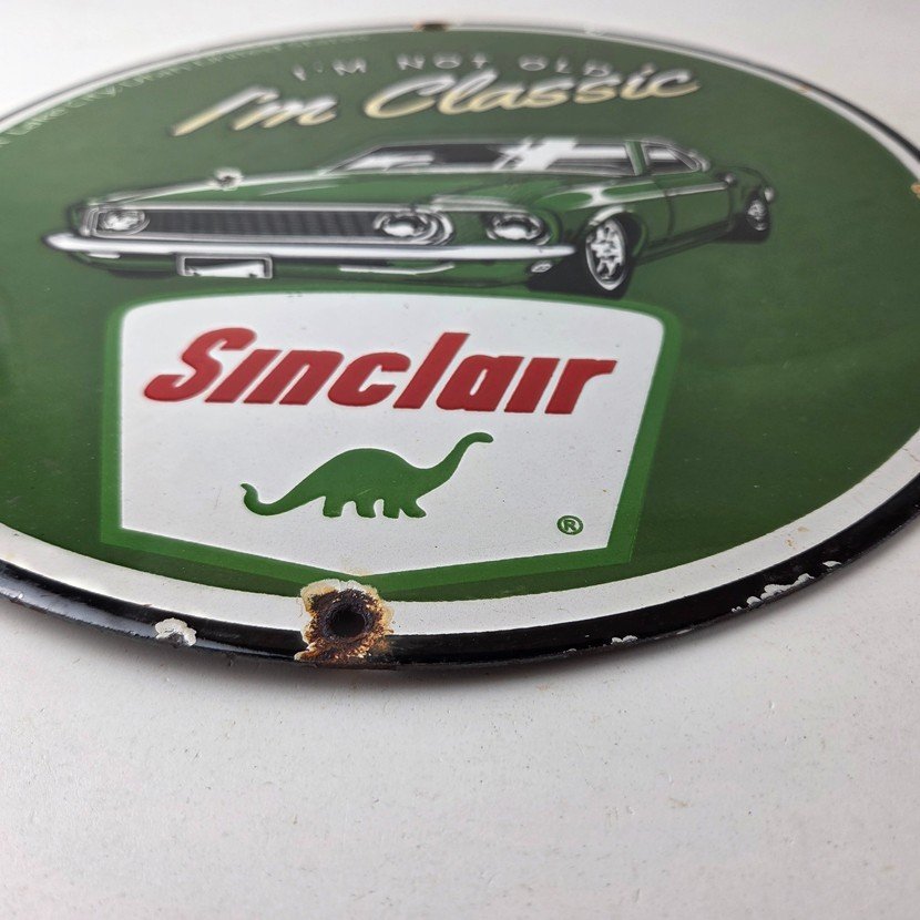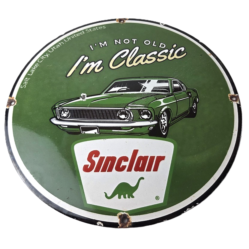 This vintage Sinclair Gasoline sign is a must-have for any gas and oil advertising collector. With its bold green Sinclair colors and iconic Dino logo, it’s sure to a make display to your collection. This pump plate sign features the Sinclair Gasoline brand name with Dino the dinosaur. Perfect for adding a touch of nostalgia to your gasoline collection, retro man cave, garage, gas pump or shop.