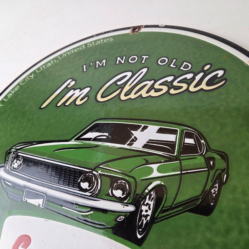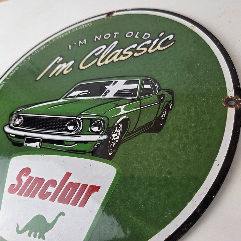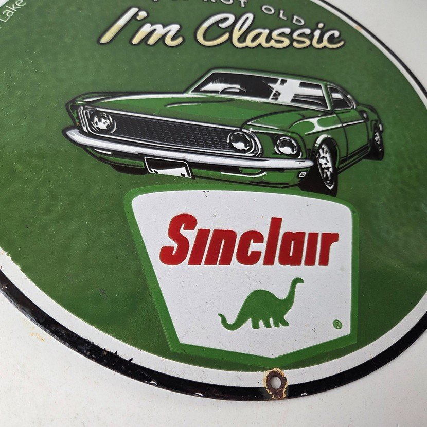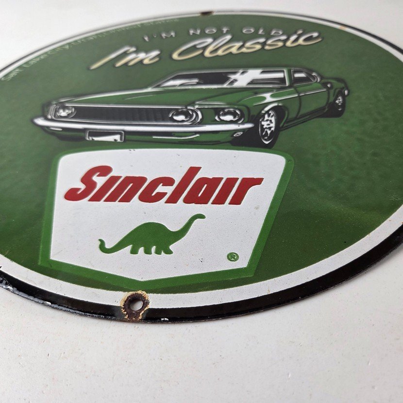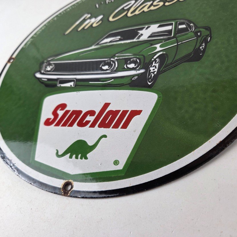 This vintage Sinclair Gasoline sign is a must-have for any gas and oil advertising collector. With its bold green Sinclair colors and iconic Dino logo, it’s sure to a make display to your collection. This pump plate sign features the Sinclair Gasoline brand name with Dino the dinosaur. Perfect for adding a touch of nostalgia to your gasoline collection, retro man cave, garage, gas pump or shop.