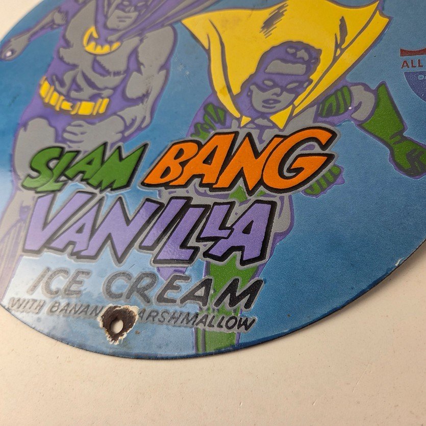 This vintage Slam Bang Vanilla Ice Cream porcelain sign features the iconic Batman and Robin, advertising for Vanilla Ice Cream. Add a vintage touch to your gas station or soda beverage collection with this Slam Bang Vanilla sign. Measuring 12 inches in size, this sign has excellent colors and porcelain.