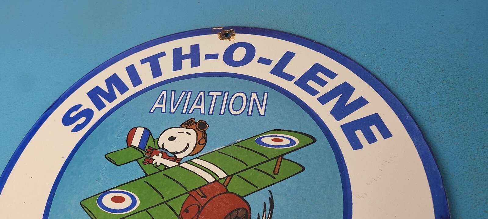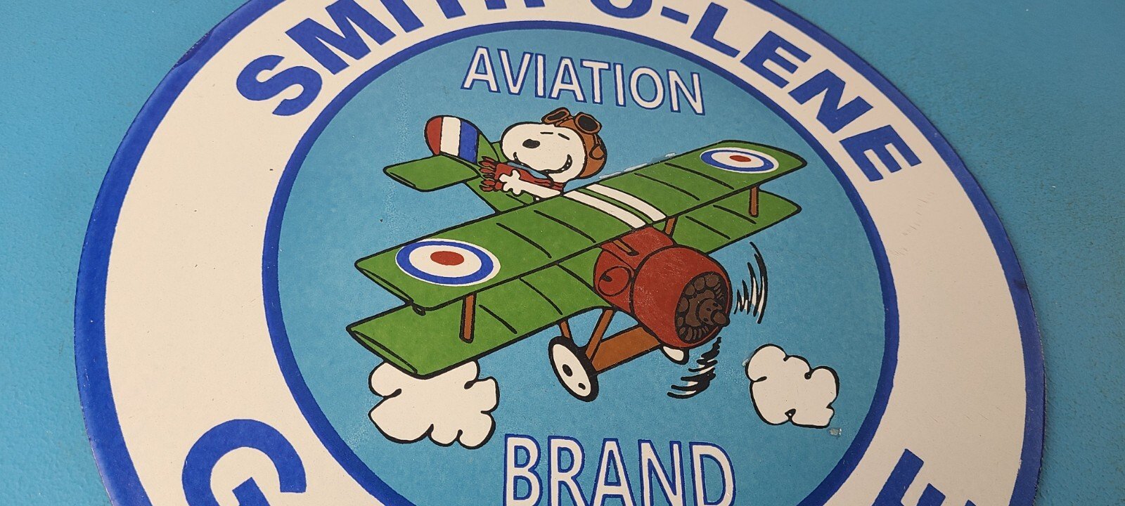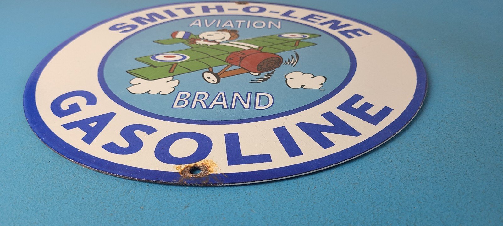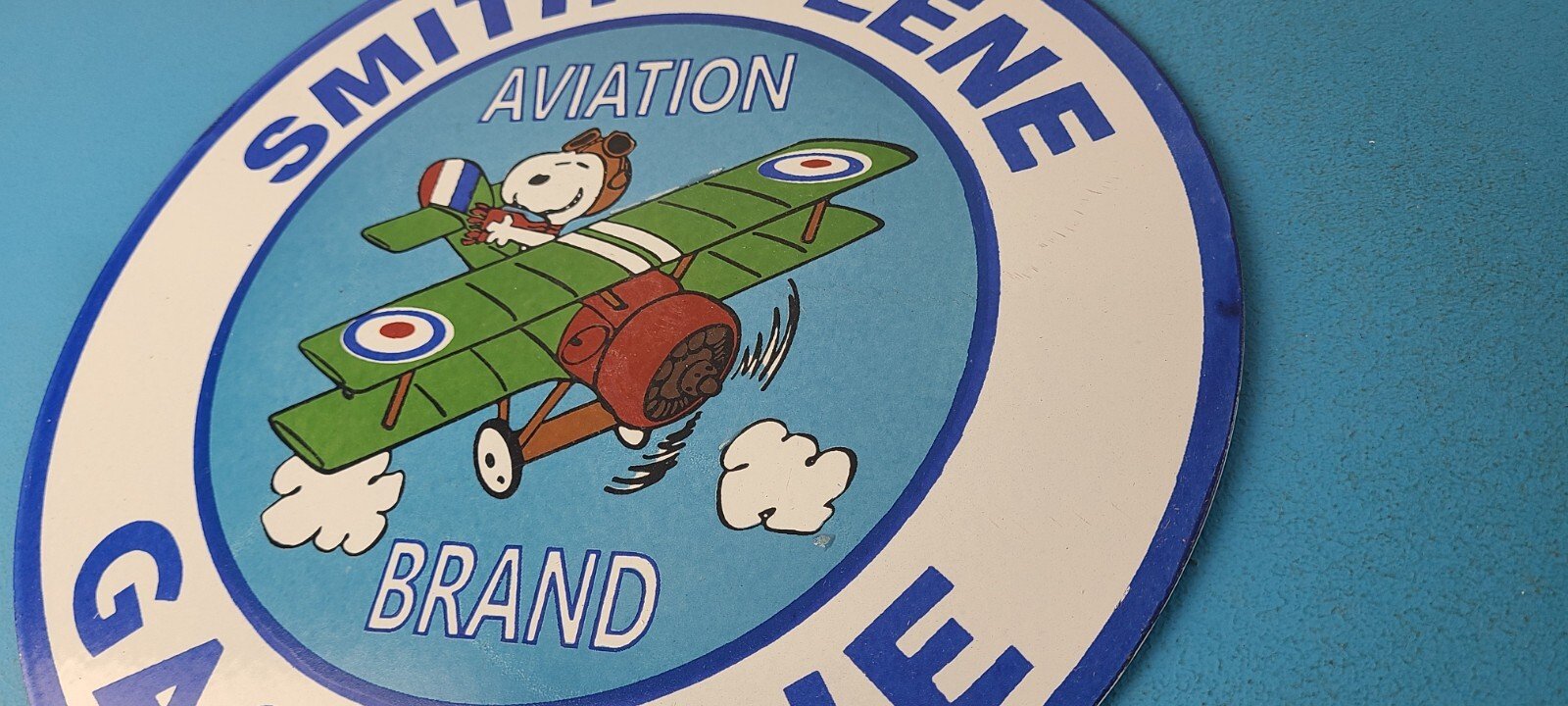 This vintage Smitholene Gasoline porcelain sign is a must-have for any gas and oil advertising enthusiast. The sign features bold colors, and prominently displays the Aviation brand. The sign is made of durable porcelain and would make a great addition to any service station or gas pump display.