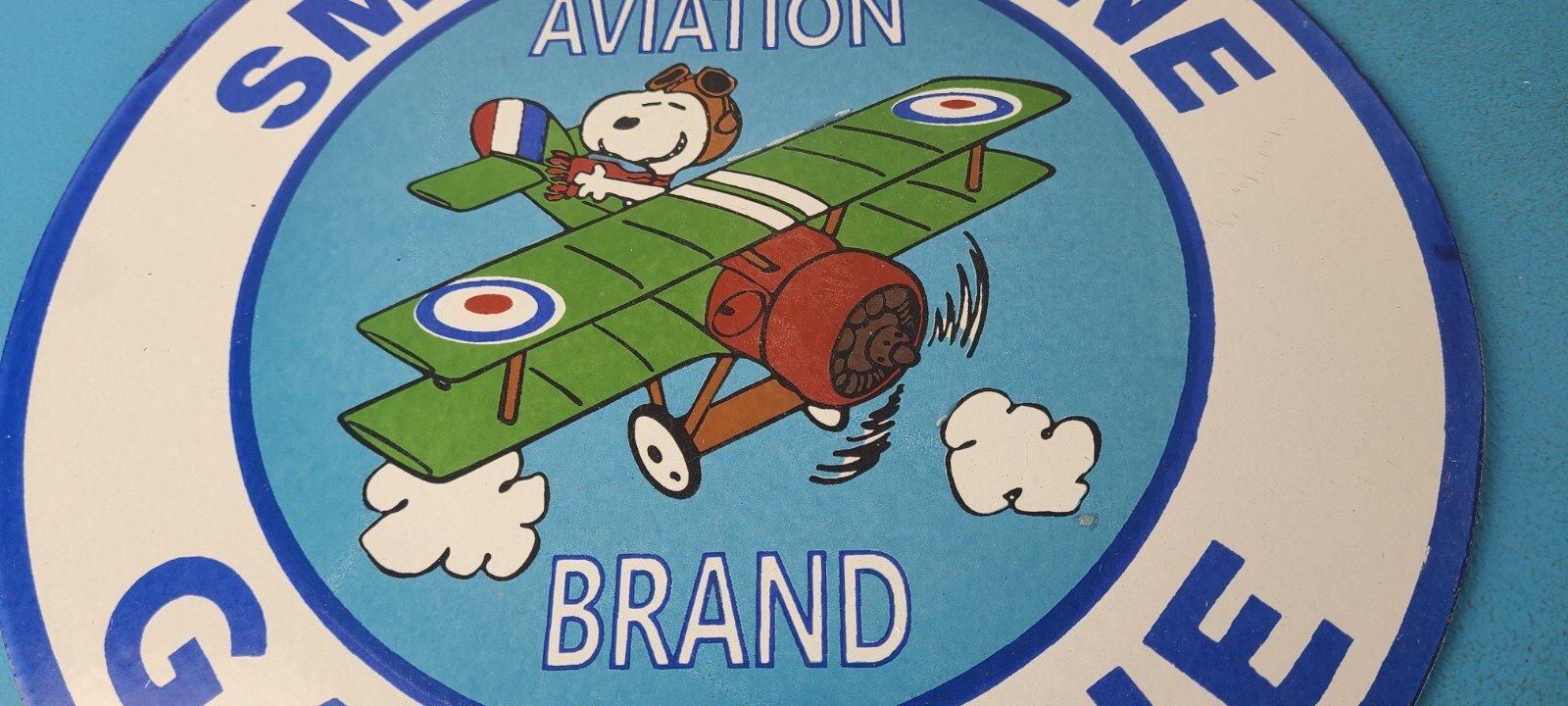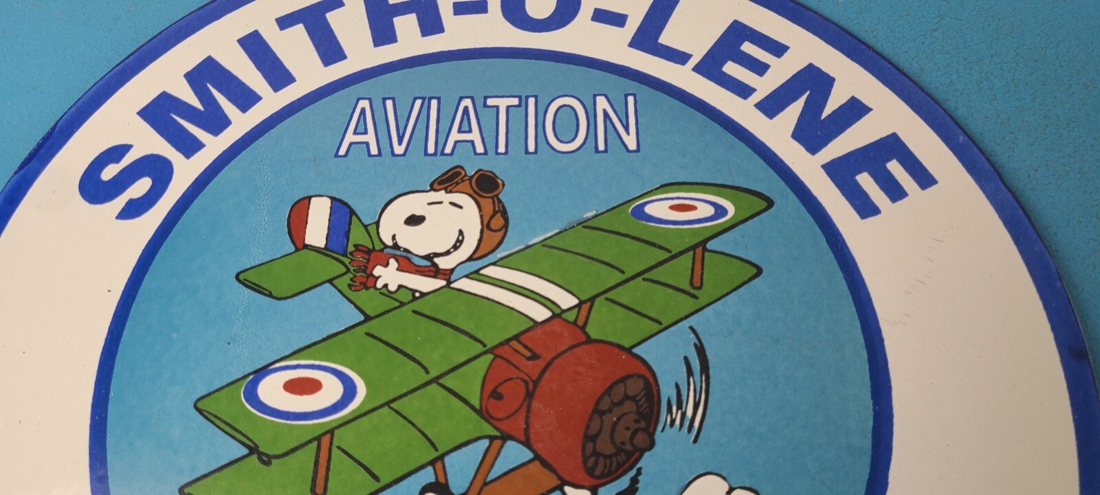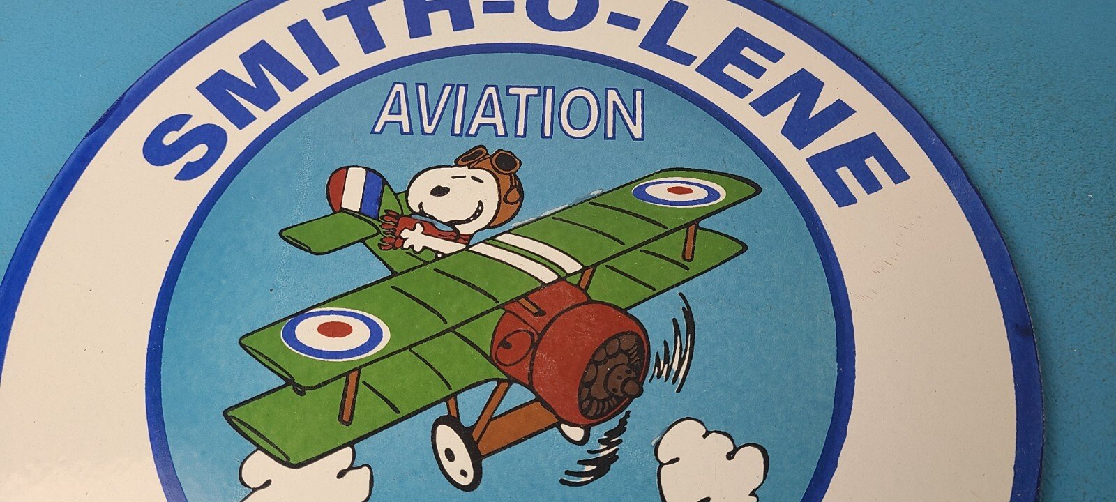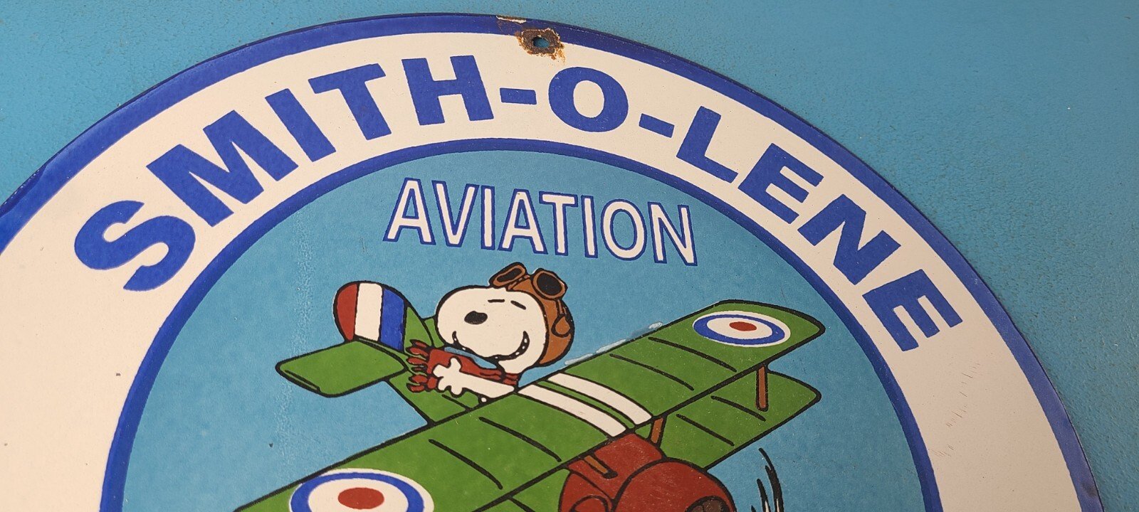 This vintage Smitholene Gasoline porcelain sign is a must-have for any gas and oil advertising enthusiast. The sign features bold colors, and prominently displays the Aviation brand. The sign is made of durable porcelain and would make a great addition to any service station or gas pump display.