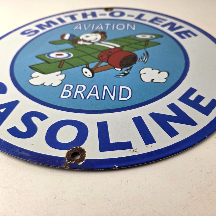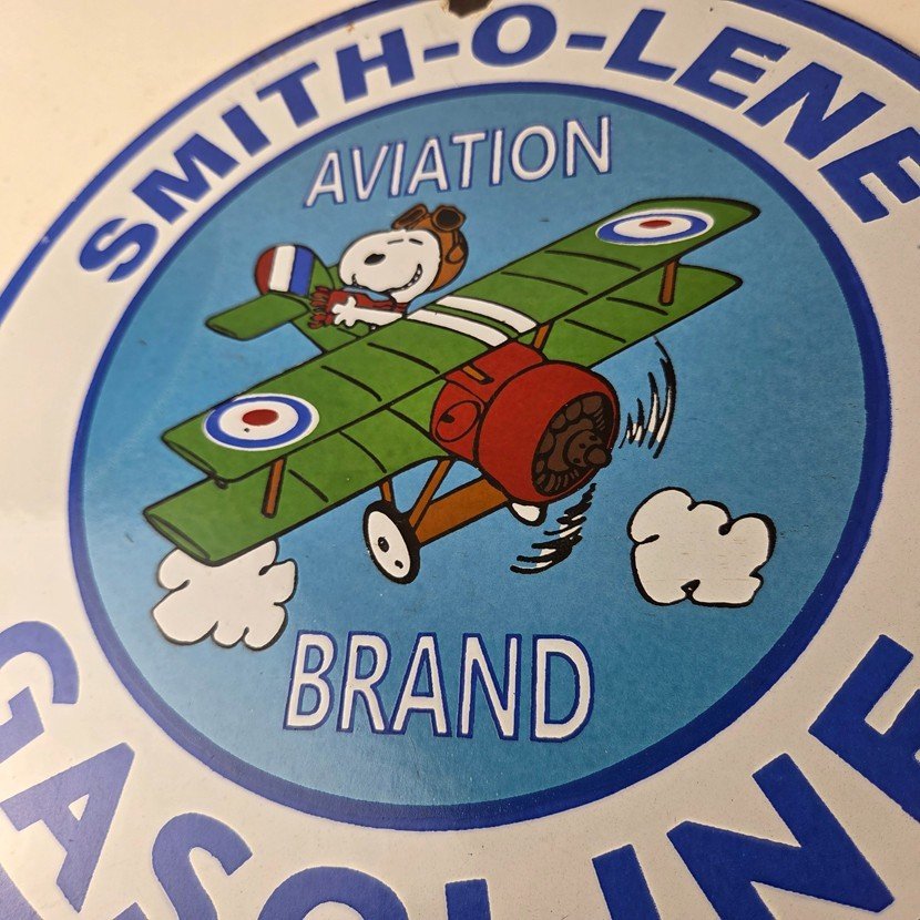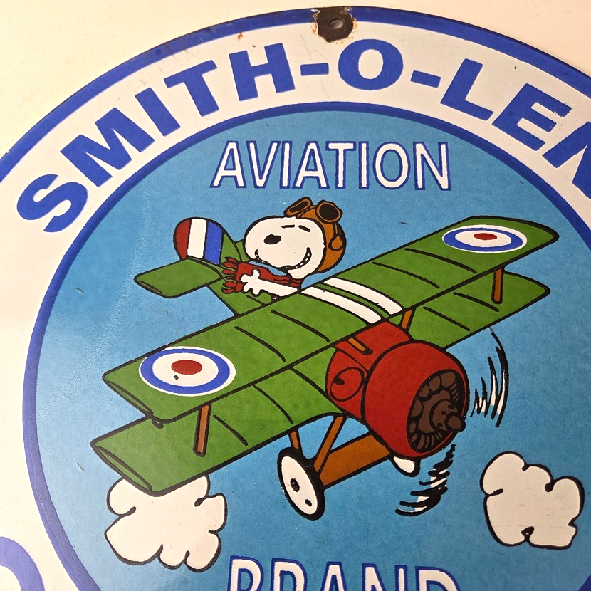 This vintage Smith-O-Lene Snoopy aviation sign makes a great addition to a garage, shop display, man cave, or any Smith-O-Lene memorabilia collection, vintage aviation gas station advertising collection, Snoopy/Peanuts crossover collection, or retro fuel sign collection.