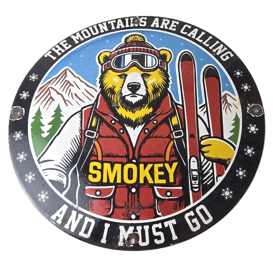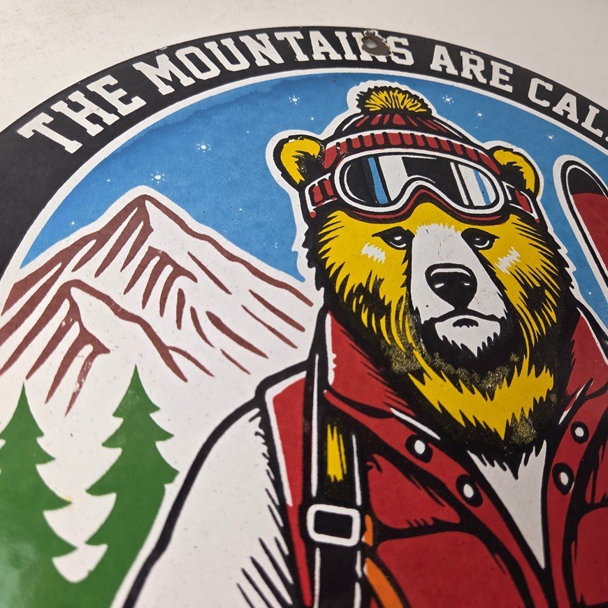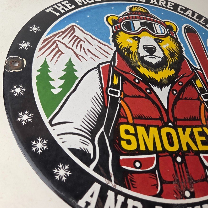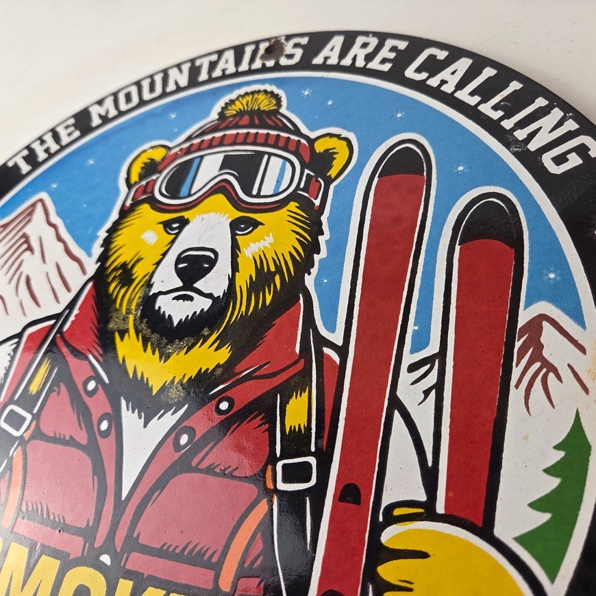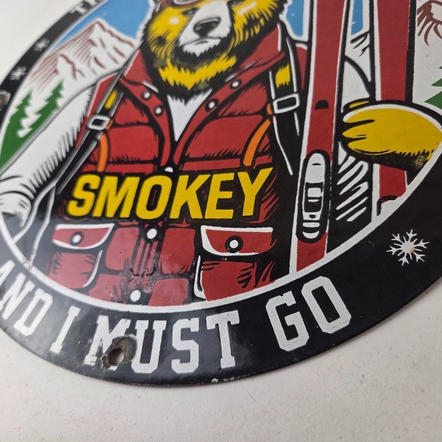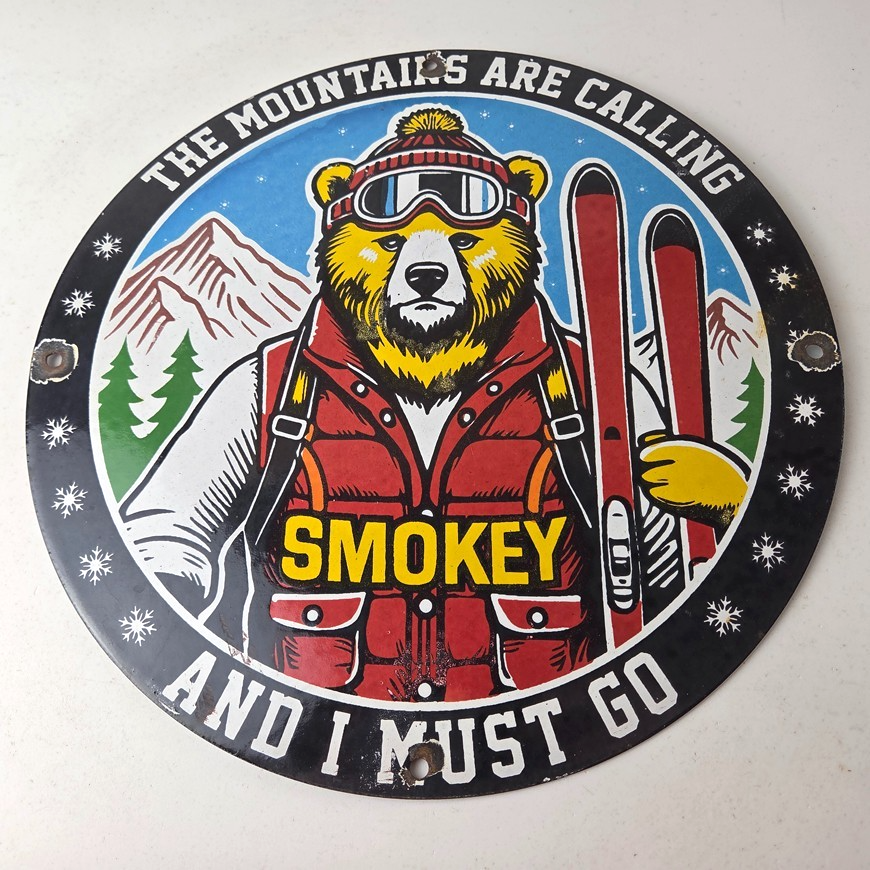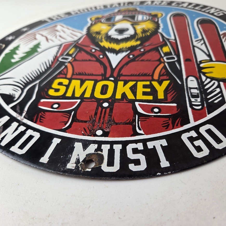 This vintage Forest Fires Prevention porcelain sign features the iconic Smokey Bear with snow skis and has large lettering that says “The Mountains Are Calling And I Must Go” around the rim. The sign is 12″ across and showcases a vivid color scheme. It is a Forest Service sign and falls under the Gas & Oil theme.