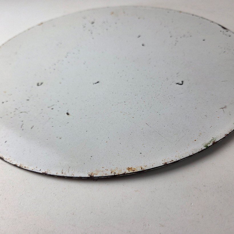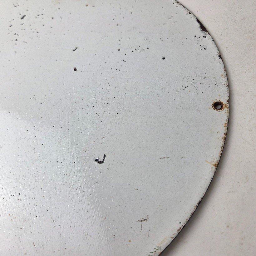 Made of porcelain enamel on steel with patina and wear: rust spotting around the mounting holes, minor edge chips, light surface scratches, and minimal discoloration. This is a porcelain enamel advertising sign in excellent condition, exactly as shown in the photos.