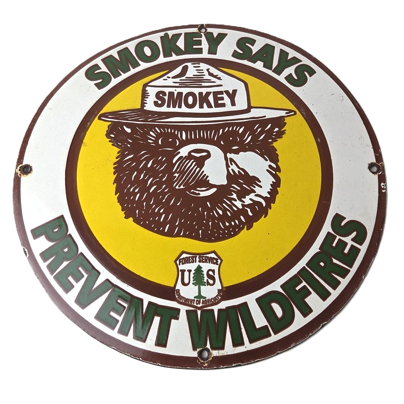 This vintage Wildlife Prevention porcelain sign features the iconic Smokey Bear and has large lettering that says “Smokey Says Prevent Wildfires” around the outside. The sign is 12″ across and showcases a brown, green and yellow color scheme. It is a Forest Service sign and falls under the Gas & Oil theme.