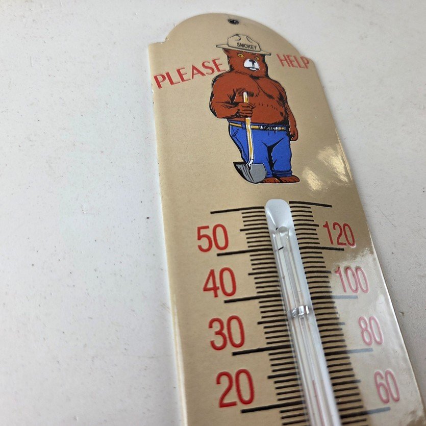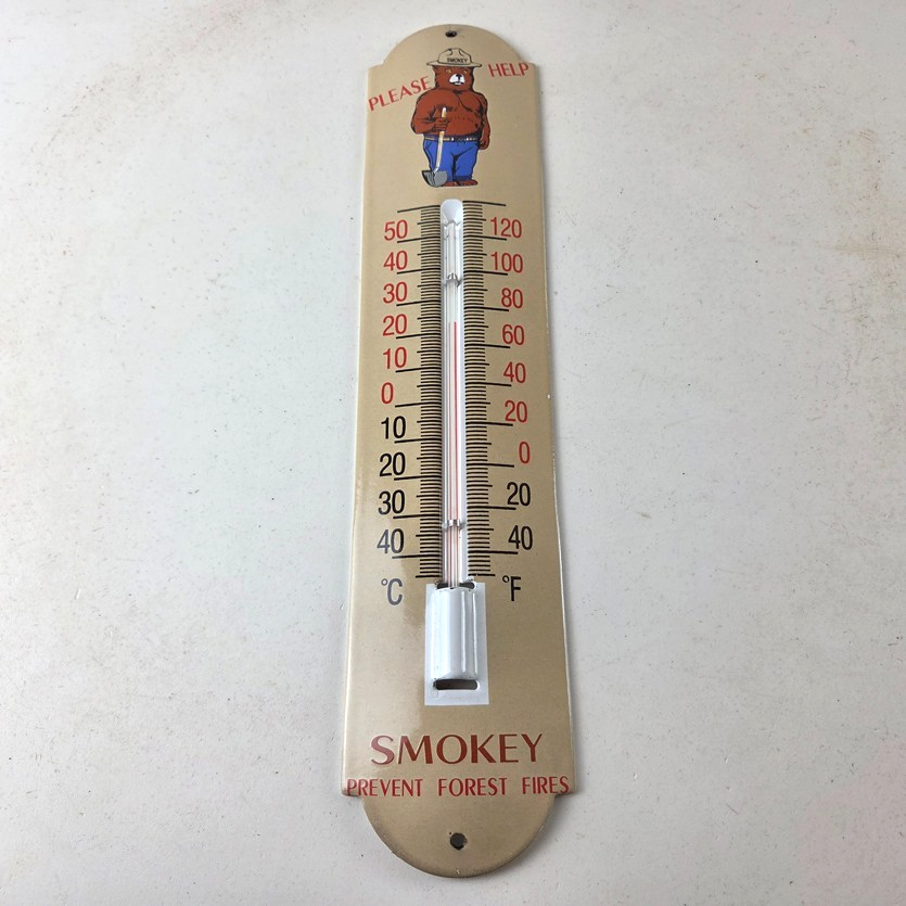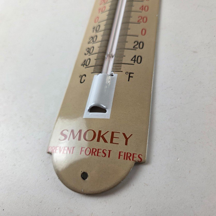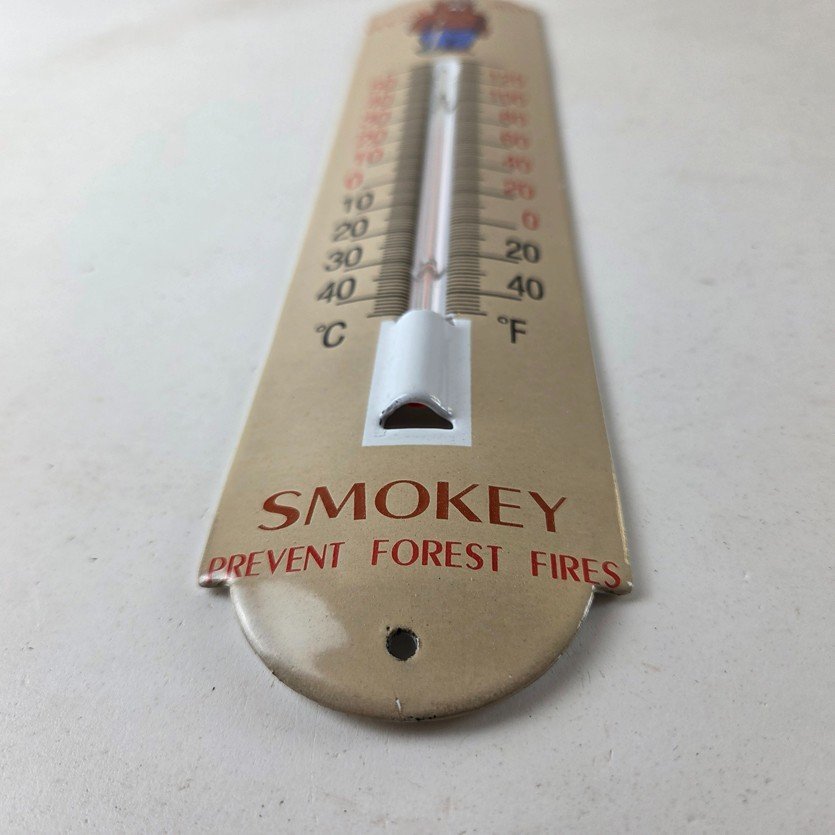 This vintage US Forest Service porcelain thermometer measures 11 3/4″ x 2 1/2″. This thermometer is a great addition to any collection. It features the iconic Smokey the Bear – Prevent Forest Fires advertisement.